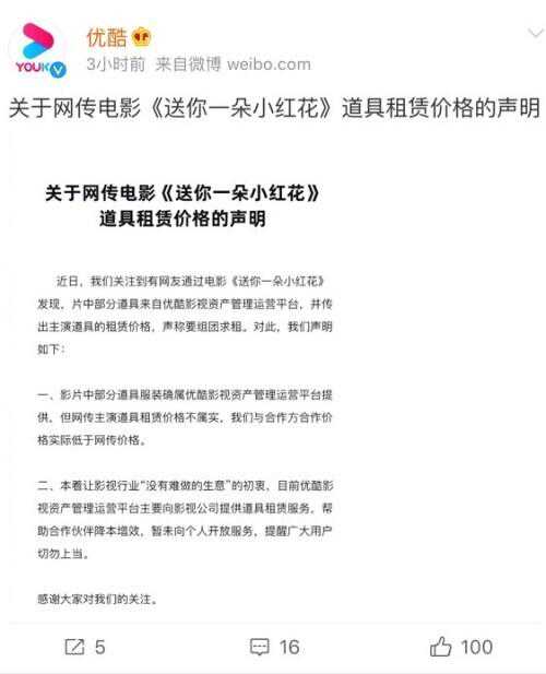 当话题不断发酵时,优酷通过官方微博发声明表示,片中大量道具通过租赁提供剧组使用,属优酷影视资产管理运营平台资产,希望帮助行业合作伙伴降本增效。
