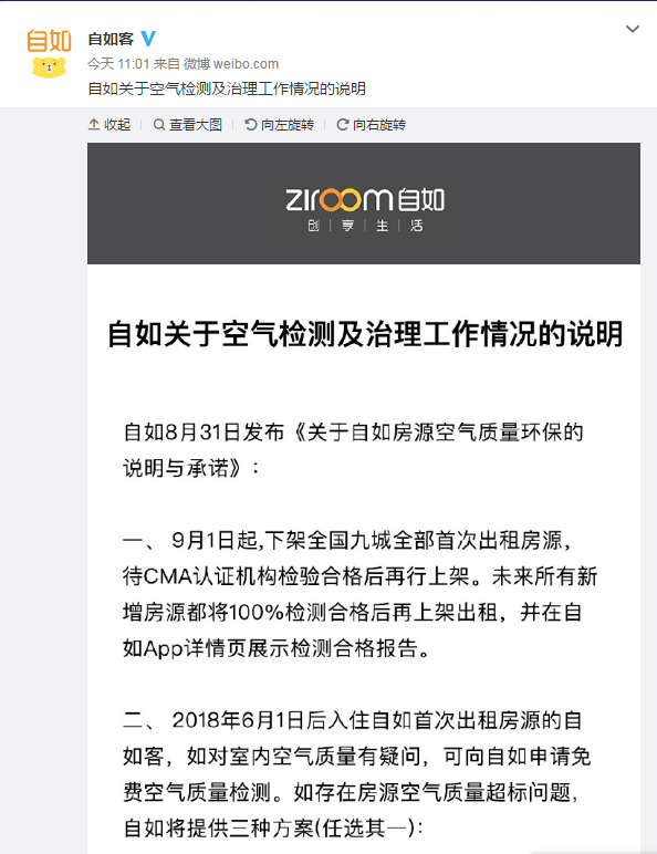 9月11日上午,自如官方微博发布《自如关于空气检测及治理工作情况的说明》,承诺“9月24日开始,所有首次出租房源,配置完成后,必须同时满足空气质量经权威机构检测合格且空置30天以上才能上架出租。” 自如官方微博截图 据媒体报道,2018年7月,某自如租客在被查出体内的白细胞数量明显偏低,大约只相当于正常人的60%,身体状况“就像刚做过化疗的病人一样。”该租客委托专业机构对租住房屋进行了检测,结果显示:卧室、厨房、客厅的甲醛、TVOC均超标,最高超标2.3倍。 另一位自如租客也遇到同样的问题,入住自如后,女友及其朋友时常会产生恶心、头晕等症状。 随后,又有媒体曝出,一名阿里员工在5月租住自如的房间后,7月时即感觉身体不适,在医院检查后,医生告知其血小板减少,随后确诊为急性髓系白血病。7月13日,病情恶化去世。 自如对此的官方回应是,“此事事关重大,一方面需要考虑相关内容对逝者家人造成的影响和压力,另一方面也需要客观、全面调查。” 自如CEO熊林也回复,“我们在积极联系家属,愿尽诚分担。” 其实,自如甲醛的消息从未停止过,早在2011年12月,就不断有自如甲醛的问题曝出。 自如相关负责人在和《每日经济新闻》记者交谈时表示,“甲醛这个事不好讲,就算我们自己家装修不是也要晾一晾才住吗?” 但自如工作人员曾对《每日经济新闻》记者表示,“租房讲究的就是短平快,自如的屋子三天就能装修好挂出去租。” 8月31日,自如发布《关于自如房源空气质量环保的说明与承诺》称,“看到‘无耻’这样的字眼与自如联系在一起时,我们被深深刺痛。”并表示,“自2018年6月1日起,自如将家具板材从国标E1升级为对标欧标的E0级板材。” 自如相关负责人曾对《每日经济新闻》记者表示,“甲醛问题我们也很无奈,可能是整个行业的问题,因为我们用的都是符合标准的材料,但是组合到一起就超标了,我们很早就用了E1的板材了。” 经《每日经济新闻》记者查询,E1板材的定义的确为“可直接用于室内的人造板”。但是房源的最终提供者是自如,而不是相关材料供应商。 自如在说明中表示,“2018年6月1日后入住自如首次出租房源的自如客,如存在房源空气质量超标问题,自如将提供三种方案(任选其一):1.无条件退租、换租;2.提供免费空气质量治理,经检验合格后再入住;3.90天品牌空气净化器无偿使用。” 与“6月1日”“90天”时间段相对应的是,板材内部胶水的甲醛是缓慢渗透释放的,可能持续好几年。 说明称,“9月1日起,下架全国九城全部首次出租房源,待CMA认证机构检验合格后再行上架。” 经《每日经济新闻》记者向自如工作人员确认,自如的确已下架全国九城全部首次出租房源。 9月11日上午,自如官方微博发布《自如关于空气检测及治理工作情况的说明》称,“9月1日,自如完成全国九城20603间首次出租房源的下架,并进入空气检测及治理流程。” 自如的态度一如既往的真诚。其承诺,“9月24日开始,所有首次出租房源,配置完成后,必须同时满足空气质量经权威机构检测合格且空置30天以上才能上架出租。” 自如还提到,“在9月10日上午10时,自如启动由CEO领导的‘自如深呼吸二期’项目,联合国内外先进企业、行业权威专家、专业研究机构,从原材料、家具、施工工艺、单位装载量等多个维度寻求系统性突破解决方案。” 最终甲醛治理完成的时间可以从说明中的一段话推断,“目前检测和治理产能还是严重不足,希望相关机构与我们联系,也欢迎各界人士为我们推荐。” 空气问题的解决似乎还道阻且长。 甲醛是一种无色无味的气体,正因如此才可以测试“良心”。 每日经济新闻
