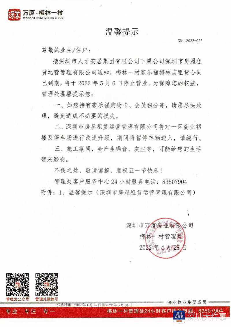 公告发布于4月28日,落款为深圳市万厦居业有限公司梅林一村管理处,而公告起因是接到来自深圳市人才安居集团有限公司下属公司深圳市房屋租赁运营管理有限公司的通知。 值得注意的是,家乐福梅林店于同日发布相关公告,称开业至今22年的门店,将在诉讼期间照常营业,欢迎广大业主继续来店或者线上购物。 缘何会有“诉讼期”一说?家乐福梅林门店的公告中,提示门店与业主方存在租约合同纠纷,门店与业主方的续约已经进入司法流程。公告强调,门店至今仍继续按时交租。 就此,南都记者向家乐福相关负责人了解情况。对方称,此次两方公告的出入正是由于续租纠纷。家乐福坚持正常营业,业主方准备强制收铺,也由此产生法院诉讼。如后续情况有新发展,将第一时间向公众说明。