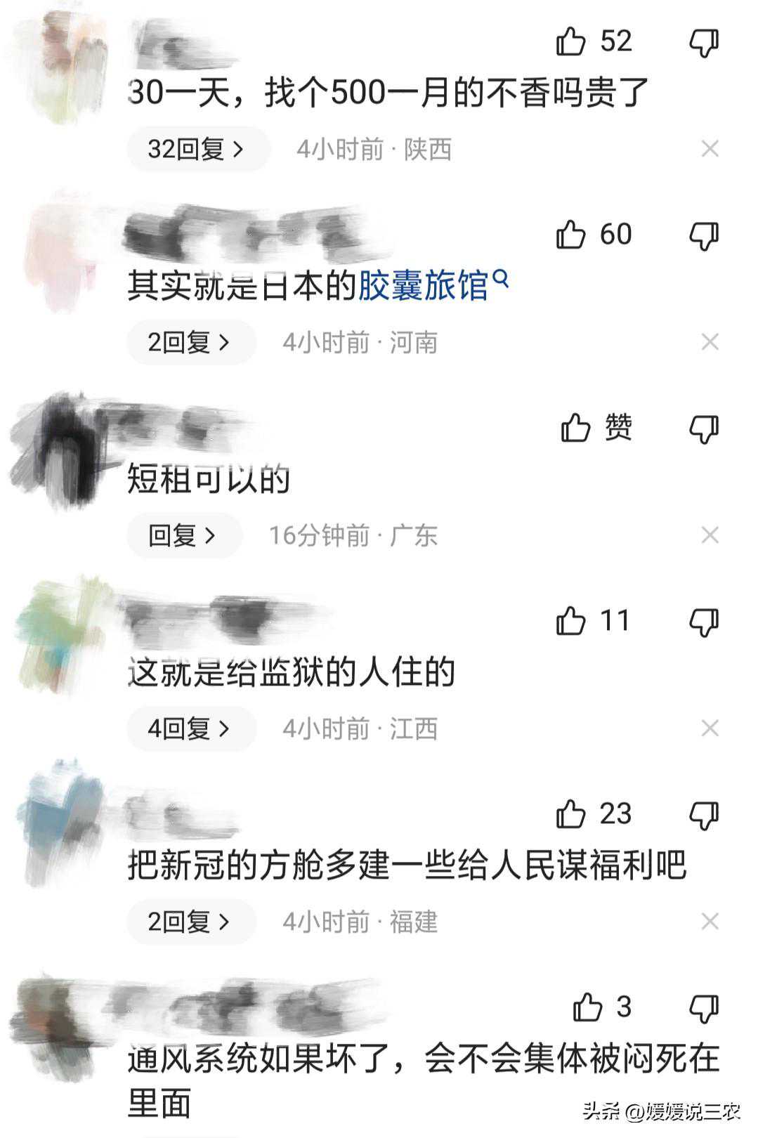 太空舱,也称为胶囊房或胶囊旅馆,最早起源于日本,是一种小型、简约的住宿设施。太空舱房间通常只有数平方米的面积,内部配置有基本的床铺、储物空间和电源插座,但通常没有独立卫生间和淋浴设施。这样的住宿条件,让人们不禁感叹,年轻人租房的降级程度已经到了前所未有的地步。 通常住太空舱的主要原因之一是经济压力。对于那些刚刚步入社会的年轻人来说,很多人的收入并不高,而传统的租房成本却相当昂贵。在大城市中,即使是简单的合租公寓,每月的租金也可能超过他们收入的一大部分。在这种情况下,住太空舱成为了一种相对廉价的选择,以维持基本生活,但这个显得有些心酸。 然而,住太空舱也面临着许多问题和挑战。首先是生活条件的拮据。太空舱的空间有限,通常没有独立卫生间,住客需要共用公共的洗漱设施。这样的不便会影响住户的生活品质,同时也可能对身体健康带来一定的影响。 其次是个人隐私的缺失。在太空舱里,住户之间的隔离较差,缺乏私密性。尽管房间内有隐私帘或隔板,但这并不能完全解决问题。对于需要安静学习或工作的年轻人来说,这样的环境很难满足他们的需求。 此外,太空舱的生活条件和设施相对简陋,没有完善的配套措施。缺乏餐厅、洗衣设施和娱乐区域等基本生活设施,使得居住在太空舱里的年轻人面临更多的不便和困扰。因此,如果配套措施不够完善,年轻人可以选择与几个同事或朋友一起合租,这样不仅可以降低生活成本,还能够租到更好的房子,享受更舒适的居住环境。 因此,媛媛觉得,尽管住太空舱能够降低生活成本,但其不便和不舒适的特点也不容忽视。尤其是对于那些需要更好生活条件和更好的隐私保护的年轻人来说,选择其他便宜但相对舒适的房子可能是更好的选择。而且租住太空舱每天30元,每日一结,但算下来一个月需要900多元,这在深圳关外村、江西景德镇、东莞、西安等地可以租个装修完善的大单间或者两室一厅了,所以选择住房还是好些。 此外,针对年轻人租房降级这件事,从侧面也反映了一个问题,人们除了房屋本身的选择外,政府和社会应该加大力度,提供更多完善的配套措施,以满足年轻人的租房需求。例如,建设更多经济适用房,完善租房市场的监管机制,提供更多租房补贴和优惠政策等,这些措施都可以提高年轻人租房的可负担性和生活品质。