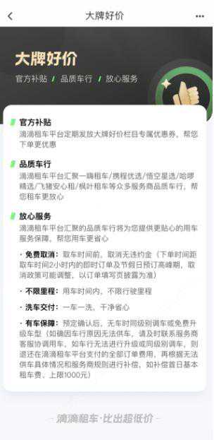 目前,滴滴租车平台已接入携程租车、哈啰租车、悟空租车、飞猪租车等行业伙伴商家,连接超1万家车行,在成都、北京、西安、广州等全国300多城市运营。 郊区放空、野外露营、周边参加音乐节等等,都是年轻人选择租车的常见场景。根据平台数据显示,滴滴租车试运营以来,租车订单中本地游场景订单占比最高,超过35%,周末这一比例超过40%。 端午假期将至,周期短、距离长、路线灵活的自驾出行需求将持续上涨,滴滴租车将通过多方比价和滴滴限时6折优惠的形式,联合众多租车合作伙伴,为用户提供更优惠的租车好服务。 同时,滴滴租车还推出“大牌好价”栏目,由平台筛选出评价好、服务优的品质车行,为用户提供优质好价的租车服务。从“大牌好价”租用的车辆,平台承诺“放心服务”,包括免费取消、不限里程、洗车交付、有车保障等。 滴滴租车“大牌好价”栏目为用户提供多项服务保障 此外,滴滴租车还通过持续优化免押能力、推动全流程信息展示标准化、突出展示用户实付总价等方式,努力降低租车服务使用门槛,提升租车服务信息透明度,让用户租车更方便、更安心。 本文源自金融界资讯