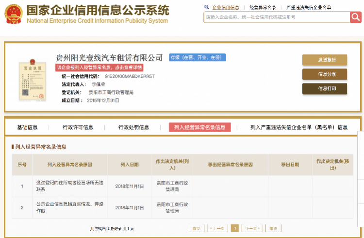 贵州阳光壹线汽车租赁有限公司已被列入经营异常名录。