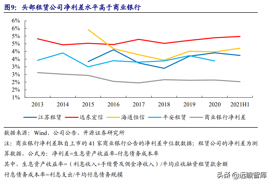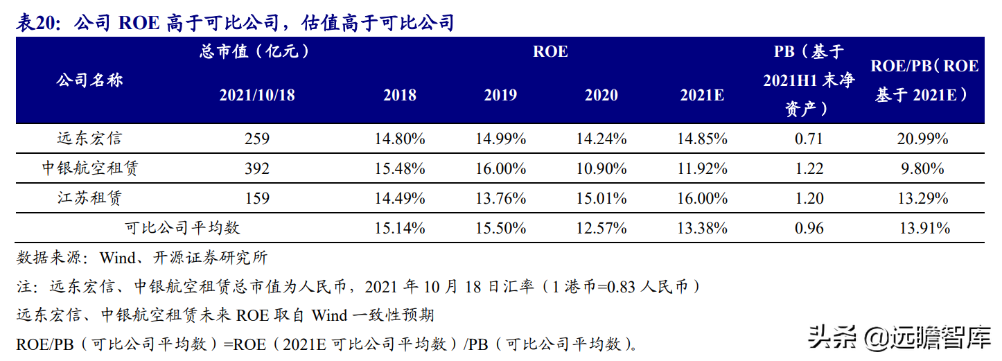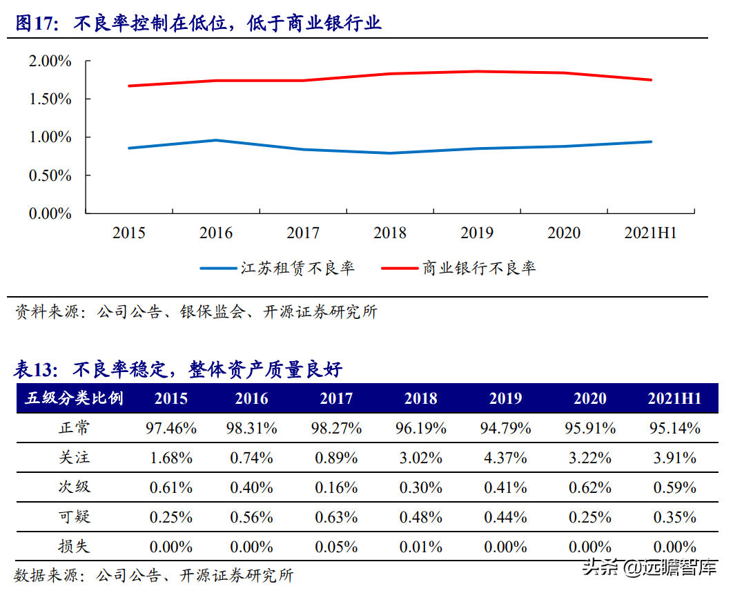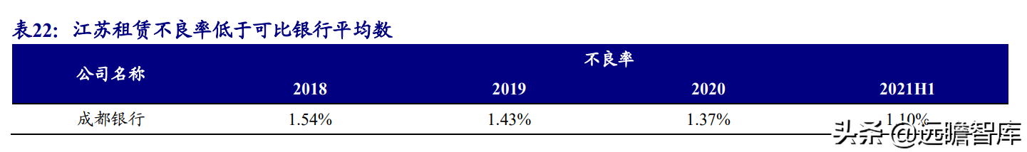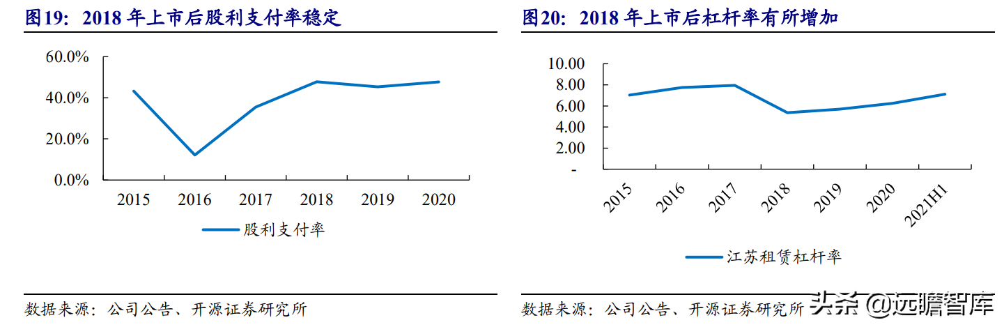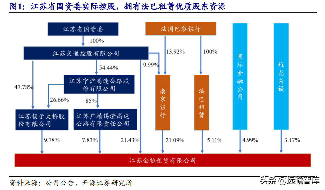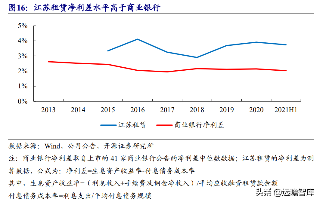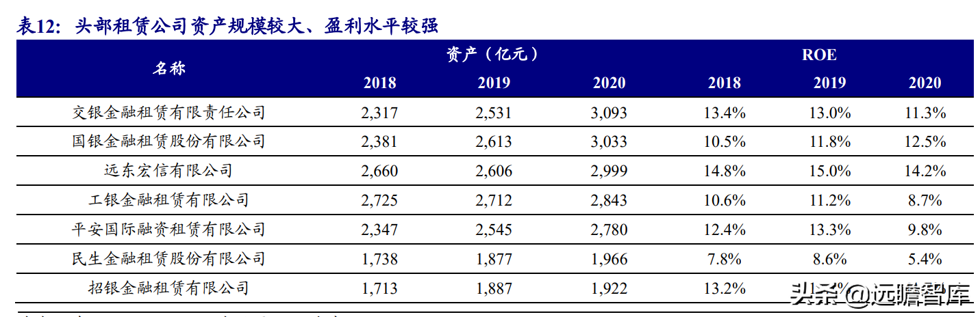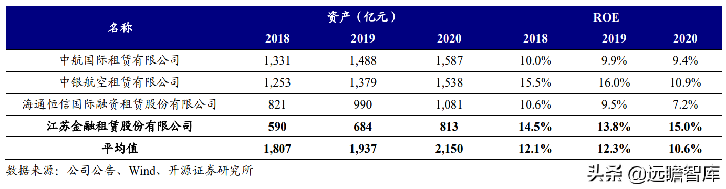(报告出品方/作者:开源证券高超吕晨雨) 公司是全国最早的专业性金融租赁公司之一,A股唯一上市金融租赁公司。 公司原名为“江苏省租赁有限公司”,于1985年成立运营,成立时注册资本为500万元。 经中国人民银行总行批准公司改组为非银行金融机构并颁发了金融许可证,于1988年4月在江苏省工商行政管理局办理工商设立登记,是全国最早的专业性金融租赁公司之一。 2003年,公司更名为“江苏金融租赁有限公司”。 2014年,公司更名为“江苏金融租赁股份有限公司”,注册资本约23.5亿元。 2018年3月公司在上交所上市,注册资本增加至29.9亿元。 作为首家及目前唯一一家A股主板上市的金融租赁公司,公司成立35年保持持续盈利。 江苏国资委实际控股,拥有南京银行、法巴租赁优质股东资源。 截至2020年末,公司总股本29.87亿股,控股股东江苏交通控股有限公司是江苏省资产规模最大的国有企业,江苏交通控股及其一致行动人合计持有本公司股份比例39.04%。 其他主要股东包括南京银行持股21.09%,战略投资者法国巴黎银行租赁集团(欧洲最大的融资租赁公司之一)和国际金融公司(世界银行集团成员)各自分别持股5.11%和4.99%,公司管理层及核心骨干员工持股近1%。 法巴租赁——欧洲领先的租赁公司,服务中小企业的厂商租赁模式典范。 法巴租赁于1963年成立,是法国巴黎银行的全资子公司。法巴租赁是欧洲领先的租赁公司,2020年第五次被评为年度欧洲租赁公司。 其业务特色为服务中小微企业的厂商租赁模式,业务集中于农机、工程机械、办公设备及IT市场,业务分布20个国家,具有成熟的业务模式和全球厂商合作资源。 根据法巴银行年报披露,截至2020年末,法巴租赁的融资租赁业务总额达340亿欧元,2020年度,法巴租赁新增项目约31万个,新增投放金额约128亿欧元。 2014年,法巴租赁入股江苏租赁,除了在业务方面的深入合作,对于江苏租赁转型厂商模式提供发展蓝本。 管理层团队在公司长期任职,专业能力突出。 核心管理层在公司工作年限均17年以上,专业能力突出,多位高管出自业务线条。稳定的管理队伍保证了公司战略实施的可持续性。 员工团队高学历人数占比较高,整体队伍年轻有活力。 公司员工具备金融、法律等专业或复合专业高学历背景,员工团队高学历人数占比较高。截至2020年末,公司员工共356人,硕博占比64.9%,本科及以上员工约占比100%。公司重视业务拓展,业务人员占比66.3%,专注培养专业化融资租赁服务能力。 根据公司9月投资者关系记录表公告,目前公司员工约400余人,平均年龄不到32岁,其中70%为前台业务人员。为打造良性竞争,提供成长机会,公司每3年组织开展双选竞聘,中层管理人员全部实施竞聘上岗,目前中层管理团队平均年龄约37岁。整体队伍年轻有活力。 限制性股票激励计划激发长期发展动力。 2019年12月21日公司推出限制性股票股权激励计划,激励计划有效期5年,包括2年禁售期和3年解锁期,实际可解锁数量与激励对象上一年度绩效评价结果挂钩。 股权激励计划授予价格为3.89元/股(上市公司最近一期每股净资产)。股权激励计划在股东、公司、员工三方之间形成了“风险-利益”长期共同体,为公司资产规模高质量可持续增长注入动力源。 限制性股票激励解锁条件合理,有利于激发员工活力。 公司选择2018年末资产规模500亿以上的金融租赁公司作为对标企业,合计16家(不含本公司),以对标企业相关指标75分位值为解锁业绩条件,解锁条件合理,能够激发员工活力,利于提升公司业绩。 2020年,公司资产增速18.9%,%,高于对标企业75分位值。 2.1、商业模式:打造资产端运营和风控能力是优秀租赁公司的共同路径 行业内以融资租赁业务为主,融资租赁本质是类信贷业务模式。融资租赁行业业务分为融资租赁业务和经营租赁业务。 融资租赁业务通过为企业客户提供融资为主的金融服务,赚取息差收入,融资租赁以承租人占用融资成本的时间计算租金。 经营租赁业务是出租人向承租人提供设备出租,出租人负责安装、保养、维修、支付保险费和提供专门技术服务等,以承租人租赁使用物的时间计算租金。 相比而言,融资租赁类似于抵押贷款的模式,经营租赁类似于资产经营模式。经营租赁对于公司产业、资产运营、专业能力、风控能力和资金体量要求更高。国内租赁公司以融资租赁业务为主。 重资产模式下核心考量ROE指标。融资租赁业务赚取息差的特点决定了公司重资产的经营模式,在这种情况下核心考量ROE。 通过我们的拆解,资产端收益率与负债端利息成本作为核心因素影响融资租赁企业利润。 融资租赁行业负债端与银行相比具有一定劣势。 对于金融机构的信贷业务模式,负债融资是做高杠杆、做大资产规模的关键。 银行的负债端为居民储蓄,低资金成本是其核心优势。融资租赁行业相对于银行,负债端具有明显劣势,融资租赁行业负债端多为银行借款、债券、ABS等,资金成本较高。 资产端运营和风控能力是融资租赁企业的核心竞争力。 负债端与银行相比不占优的情况下,融资租赁公司需要增强在资产端运营和风控管理能力,从而在类信贷的业务模式下与银行竞争,资产端能力是租赁公司高利差和低不良的核心保障,因此资产运营能力和风险控制能力是融资租赁公司的核心竞争力。 与银行贷款相比,融资租赁业务更加灵活且更深入产业。业务