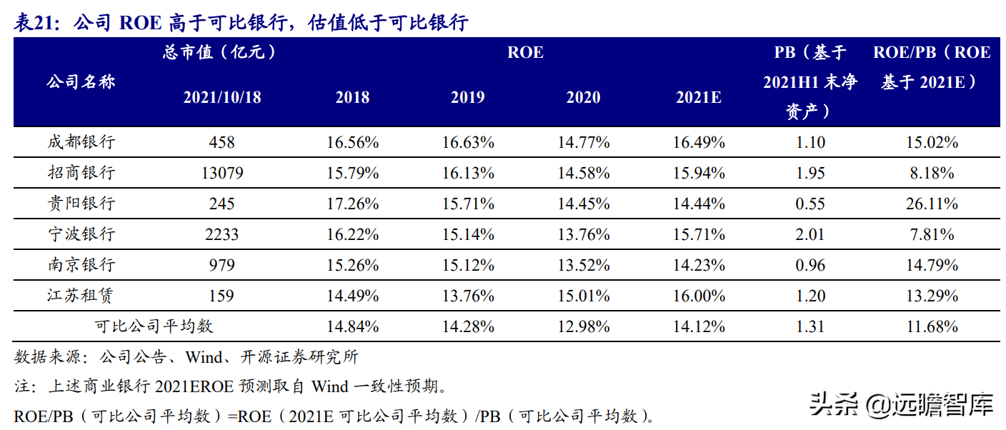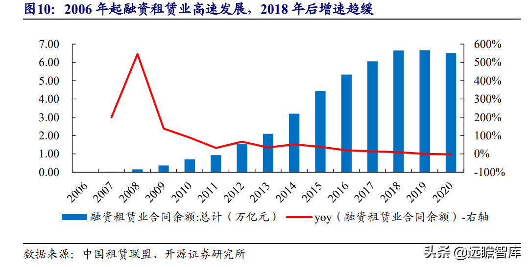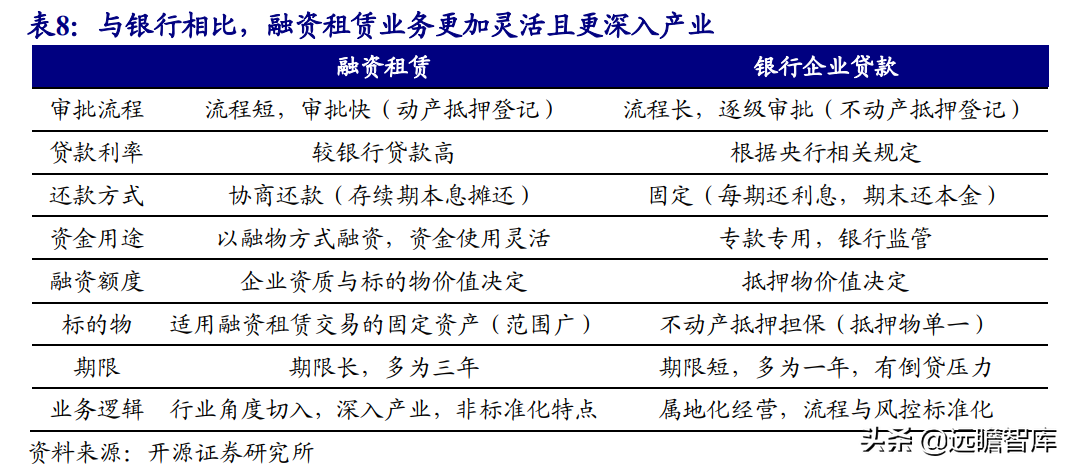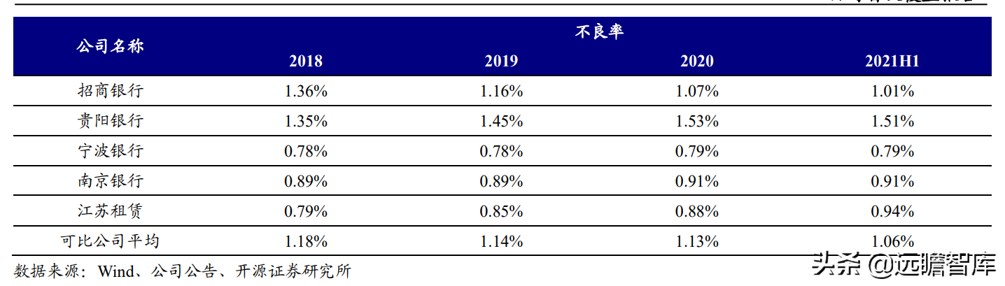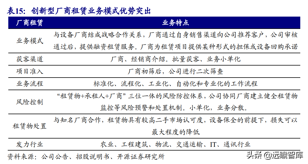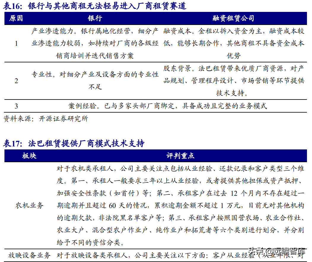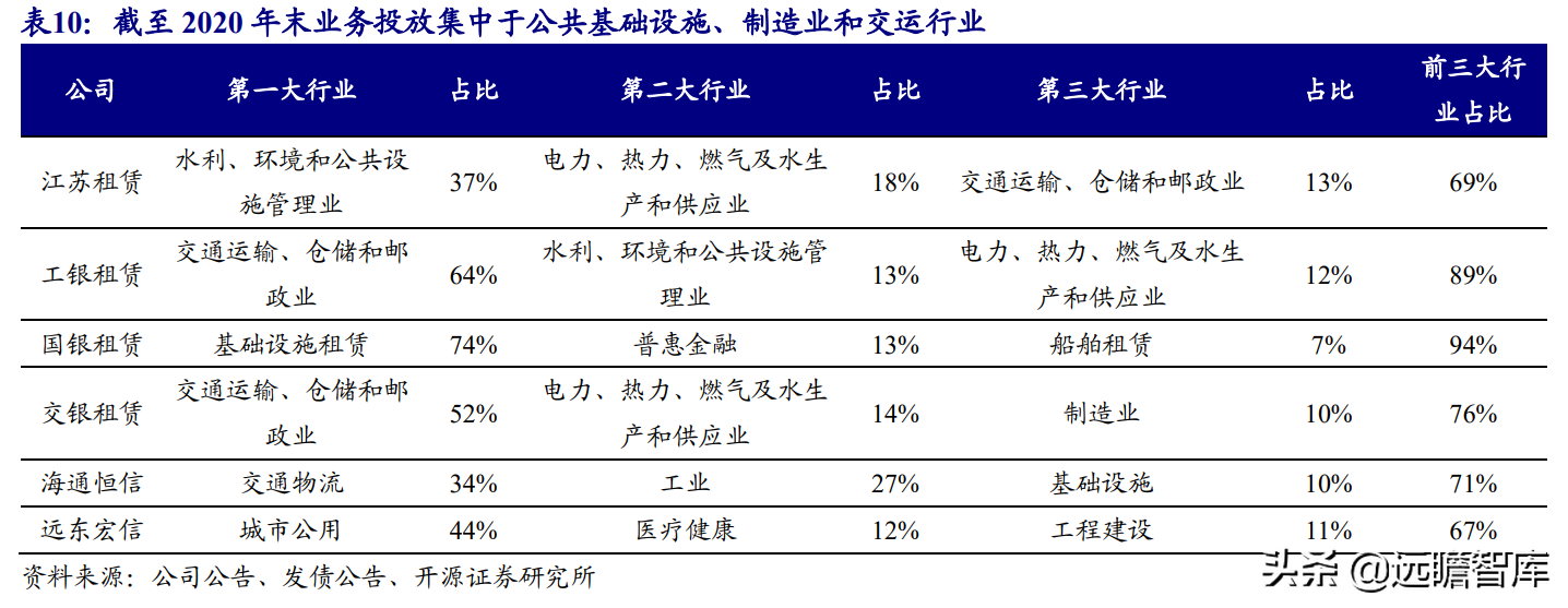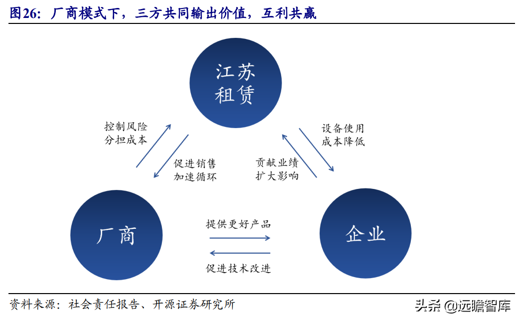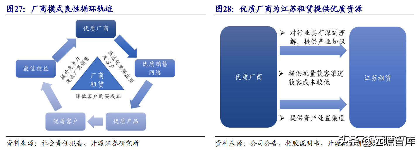 (报告出品方/作者:开源证券高超吕晨雨) 公司是全国最早的专业性金融租赁公司之一,A股唯一上市金融租赁公司。 公司原名为“江苏省租赁有限公司”,于1985年成立运营,成立时注册资本为500万元。 经中国人民银行总行批准公司改组为非银行金融机构并颁发了金融许可证,于1988年4月在江苏省工商行政管理局办理工商设立登记,是全国最早的专业性金融租赁公司之一。 2003年,公司更名为“江苏金融租赁有限公司”。 2014年,公司更名为“江苏金融租赁股份有限公司”,注册资本约23.5亿元。 2018年3月公司在上交所上市,注册资本增加至29.9亿元。 作为首家及目前唯一一家A股主板上市的金融租赁公司,公司成立35年保持持续盈利。 江苏国资委实际控股,拥有南京银行、法巴租赁优质股东资源。 截至2020年末,公司总股本29.87亿股,控股股东江苏交通控股有限公司是江苏省资产规模最大的国有企业,江苏交通控股及其一致行动人合计持有本公司股份比例39.04%。 其他主要股东包括南京银行持股21.09%,战略投资者法国巴黎银行租赁集团(欧洲最大的融资租赁公司之一)和国际金融公司(世界银行集团成员)各自分别持股5.11%和4.99%,公司管理层及核心骨干员工持股近1%。 法巴租赁——欧洲领先的租赁公司,服务中小企业的厂商租赁模式典范。 法巴租赁于1963年成立,是法国巴黎银行的全资子公司。法巴租赁是欧洲领先的租赁公司,2020年第五次被评为年度欧洲租赁公司。 其业务特色为服务中小微企业的厂商租赁模式,业务集中于农机、工程机械、办公设备及IT市场,业务分布20个国家,具有成熟的业务模式和全球厂商合作资源。 根据法巴银行年报披露,截至2020年末,法巴租赁的融资租赁业务总额达340亿欧元,2020年度,法巴租赁新增项目约31万个,新增投放金额约128亿欧元。 2014年,法巴租赁入股江苏租赁,除了在业务方面的深入合作,对于江苏租赁转型厂商模式提供发展蓝本。 管理层团队在公司长期任职,专业能力突出。 核心管理层在公司工作年限均17年以上,专业能力突出,多位高管出自业务线条。稳定的管理队伍保证了公司战略实施的可持续性。 员工团队高学历人数占比较高,整体队伍年轻有活力。 公司员工具备金融、法律等专业或复合专业高学历背景,员工团队高学历人数占比较高。截至2020年末,公司员工共356人,硕博占比64.9%,本科及以上员工约占比100%。公司重视业务拓展,业务人员占比66.3%,专注培养专业化融资租赁服务能力。 根据公司9月投资者关系记录表公告,目前公司员工约400余人,平均年龄不到32岁,其中70%为前台业务人员。为打造良性竞争,提供成长机会,公司每3年组织开展双选竞聘,中层管理人员全部实施竞聘上岗,目前中层管理团队平均年龄约37岁。整体队伍年轻有活力。 限制性股票激励计划激发长期发展动力。 2019年12月21日公司推出限制性股票股权激励计划,激励计划有效期5年,包括2年禁售期和3年解锁期,实际可解锁数量与激励对象上一年度绩效评价结果挂钩。 股权激励计划授予价格为3.89元/股(上市公司最近一期每股净资产)。股权激励计划在股东、公司、员工三方之间形成了“风险-利益”长期共同体,为公司资产规模高质量可持续增长注入动力源。 限制性股票激励解锁条件合理,有利于激发员工活力。 公司选择2018年末资产规模500亿以上的金融租赁公司作为对标企业,合计16家(不含本公司),以对标企业相关指标75分位值为解锁业绩条件,解锁条件合理,能够激发员工活力,利于提升公司业绩。 2020年,公司资产增速18.9%,%,高于对标企业75分位值。 2.1、商业模式:打造资产端运营和风控能力是优秀租赁公司的共同路径 行业内以融资租赁业务为主,融资租赁本质是类信贷业务模式。融资租赁行业业务分为融资租赁业务和经营租赁业务。 融资租赁业务通过为企业客户提供融资为主的金融服务,赚取息差收入,融资租赁以承租人占用融资成本的时间计算租金。 经营租赁业务是出租人向承租人提供设备出租,出租人负责安装、保养、维修、支付保险费和提供专门技术服务等,以承租人租赁使用物的时间计算租金。 相比而言,融资租赁类似于抵押贷款的模式,经营租赁类似于资产经营模式。经营租赁对于公司产业、资产运营、专业能力、风控能力和资金体量要求更高。国内租赁公司以融资租赁业务为主。 重资产模式下核心考量ROE指标。融资租赁业务赚取息差的特点决定了公司重资产的经营模式,在这种情况下核心考量ROE。 通过我们的拆解,资产端收益率与负债端利息成本作为核心因素影响融资租赁企业利润。 融资租赁行业负债端与银行相比具有一定劣势。 对于金融机构的信贷业务模式,负债融资是做高杠杆、做大资产规模的关键。 银行的负债端为居民储蓄,低资金成本是其核心优势。融资租赁行业相对于银行,负债端具有明显劣势,融资租赁行业负债端多为银行借款、债券、ABS等,资金成本较高。 资产端运营和风控能力是融资租赁企业的核心竞争力。 负债端与银行相比不占优的情况下,融资租赁公司需要增强在资产端运营和风控管理能力,从而在类信贷的业务模式下与银行竞争,资产端能力是租赁公司高利差和低不良的核心保障,因此资产运营能力和风险控制能力是融资租赁公司的核心竞争力。 与银行贷款相比,融资租赁业务更加灵活且更深入产业。业务