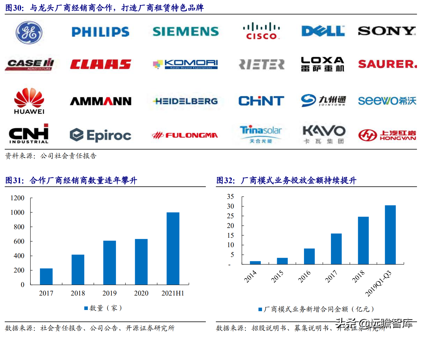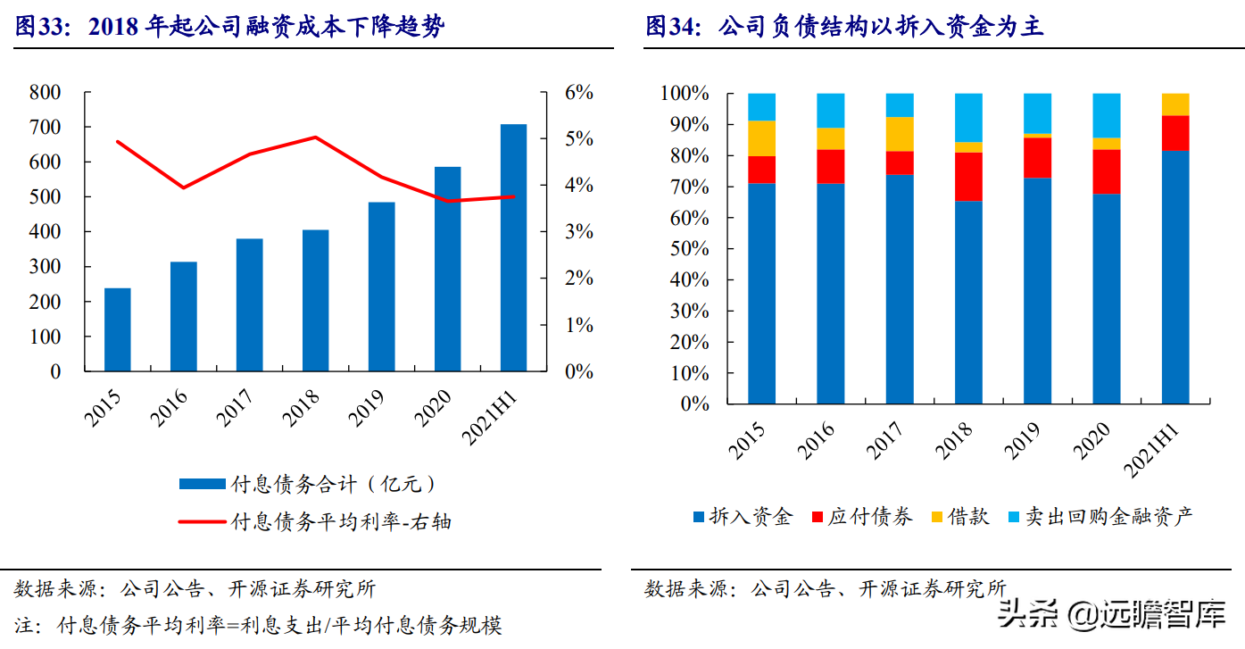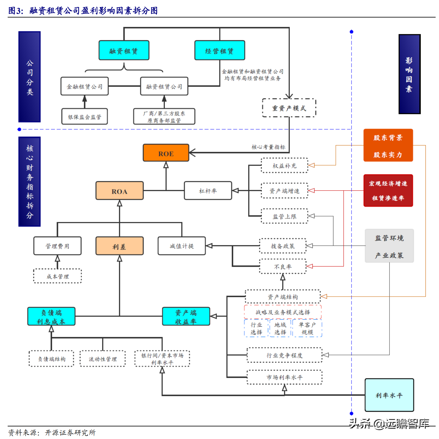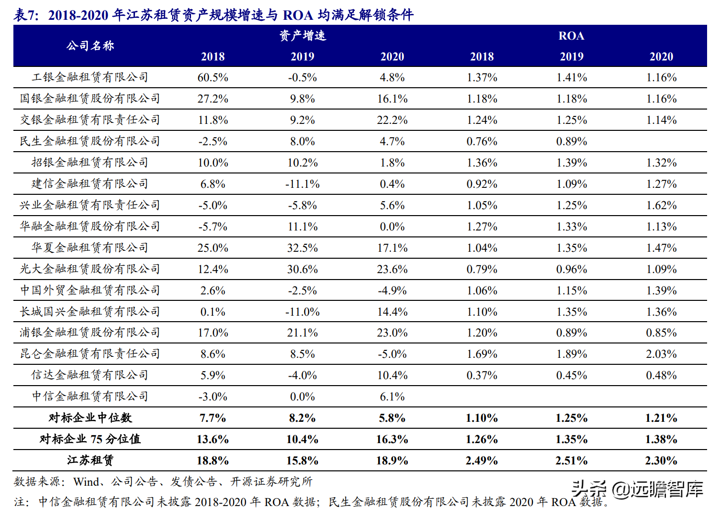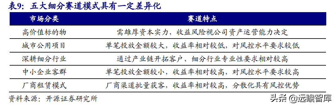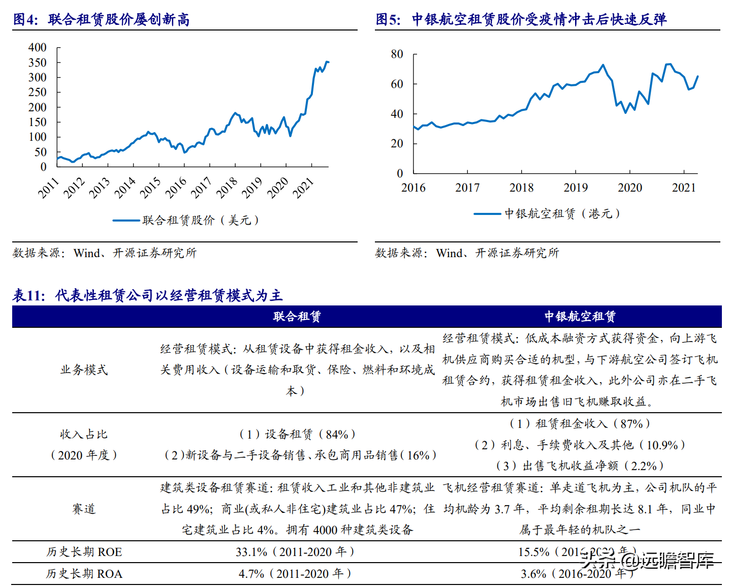(报告出品方/作者:开源证券高超吕晨雨) 公司是全国最早的专业性金融租赁公司之一,A股唯一上市金融租赁公司。 公司原名为“江苏省租赁有限公司”,于1985年成立运营,成立时注册资本为500万元。 经中国人民银行总行批准公司改组为非银行金融机构并颁发了金融许可证,于1988年4月在江苏省工商行政管理局办理工商设立登记,是全国最早的专业性金融租赁公司之一。 2003年,公司更名为“江苏金融租赁有限公司”。 2014年,公司更名为“江苏金融租赁股份有限公司”,注册资本约23.5亿元。 2018年3月公司在上交所上市,注册资本增加至29.9亿元。 作为首家及目前唯一一家A股主板上市的金融租赁公司,公司成立35年保持持续盈利。 江苏国资委实际控股,拥有南京银行、法巴租赁优质股东资源。 截至2020年末,公司总股本29.87亿股,控股股东江苏交通控股有限公司是江苏省资产规模最大的国有企业,江苏交通控股及其一致行动人合计持有本公司股份比例39.04%。 其他主要股东包括南京银行持股21.09%,战略投资者法国巴黎银行租赁集团(欧洲最大的融资租赁公司之一)和国际金融公司(世界银行集团成员)各自分别持股5.11%和4.99%,公司管理层及核心骨干员工持股近1%。 法巴租赁——欧洲领先的租赁公司,服务中小企业的厂商租赁模式典范。 法巴租赁于1963年成立,是法国巴黎银行的全资子公司。法巴租赁是欧洲领先的租赁公司,2020年第五次被评为年度欧洲租赁公司。 其业务特色为服务中小微企业的厂商租赁模式,业务集中于农机、工程机械、办公设备及IT市场,业务分布20个国家,具有成熟的业务模式和全球厂商合作资源。 根据法巴银行年报披露,截至2020年末,法巴租赁的融资租赁业务总额达340亿欧元,2020年度,法巴租赁新增项目约31万个,新增投放金额约128亿欧元。 2014年,法巴租赁入股江苏租赁,除了在业务方面的深入合作,对于江苏租赁转型厂商模式提供发展蓝本。 管理层团队在公司长期任职,专业能力突出。 核心管理层在公司工作年限均17年以上,专业能力突出,多位高管出自业务线条。稳定的管理队伍保证了公司战略实施的可持续性。 员工团队高学历人数占比较高,整体队伍年轻有活力。 公司员工具备金融、法律等专业或复合专业高学历背景,员工团队高学历人数占比较高。截至2020年末,公司员工共356人,硕博占比64.9%,本科及以上员工约占比100%。公司重视业务拓展,业务人员占比66.3%,专注培养专业化融资租赁服务能力。 根据公司9月投资者关系记录表公告,目前公司员工约400余人,平均年龄不到32岁,其中70%为前台业务人员。为打造良性竞争,提供成长机会,公司每3年组织开展双选竞聘,中层管理人员全部实施竞聘上岗,目前中层管理团队平均年龄约37岁。整体队伍年轻有活力。 限制性股票激励计划激发长期发展动力。 2019年12月21日公司推出限制性股票股权激励计划,激励计划有效期5年,包括2年禁售期和3年解锁期,实际可解锁数量与激励对象上一年度绩效评价结果挂钩。 股权激励计划授予价格为3.89元/股(上市公司最近一期每股净资产)。股权激励计划在股东、公司、员工三方之间形成了“风险-利益”长期共同体,为公司资产规模高质量可持续增长注入动力源。 限制性股票激励解锁条件合理,有利于激发员工活力。 公司选择2018年末资产规模500亿以上的金融租赁公司作为对标企业,合计16家(不含本公司),以对标企业相关指标75分位值为解锁业绩条件,解锁条件合理,能够激发员工活力,利于提升公司业绩。 2020年,公司资产增速18.9%,%,高于对标企业75分位值。 2.1、商业模式:打造资产端运营和风控能力是优秀租赁公司的共同路径 行业内以融资租赁业务为主,融资租赁本质是类信贷业务模式。融资租赁行业业务分为融资租赁业务和经营租赁业务。 融资租赁业务通过为企业客户提供融资为主的金融服务,赚取息差收入,融资租赁以承租人占用融资成本的时间计算租金。 经营租赁业务是出租人向承租人提供设备出租,出租人负责安装、保养、维修、支付保险费和提供专门技术服务等,以承租人租赁使用物的时间计算租金。 相比而言,融资租赁类似于抵押贷款的模式,经营租赁类似于资产经营模式。经营租赁对于公司产业、资产运营、专业能力、风控能力和资金体量要求更高。国内租赁公司以融资租赁业务为主。 重资产模式下核心考量ROE指标。融资租赁业务赚取息差的特点决定了公司重资产的经营模式,在这种情况下核心考量ROE。 通过我们的拆解,资产端收益率与负债端利息成本作为核心因素影响融资租赁企业利润。 融资租赁行业负债端与银行相比具有一定劣势。 对于金融机构的信贷业务模式,负债融资是做高杠杆、做大资产规模的关键。 银行的负债端为居民储蓄,低资金成本是其核心优势。融资租赁行业相对于银行,负债端具有明显劣势,融资租赁行业负债端多为银行借款、债券、ABS等,资金成本较高。 资产端运营和风控能力是融资租赁企业的核心竞争力。 负债端与银行相比不占优的情况下,融资租赁公司需要增强在资产端运营和风控管理能力,从而在类信贷的业务模式下与银行竞争,资产端能力是租赁公司高利差和低不良的核心保障,因此资产运营能力和风险控制能力是融资租赁公司的核心竞争力。 与银行贷款相比,融资租赁业务更加灵活且更深入产业。业务