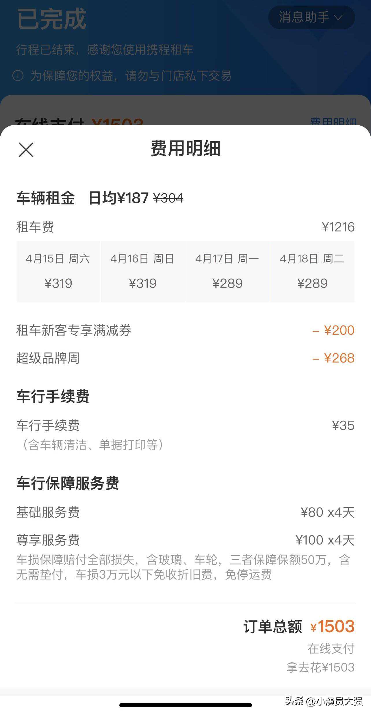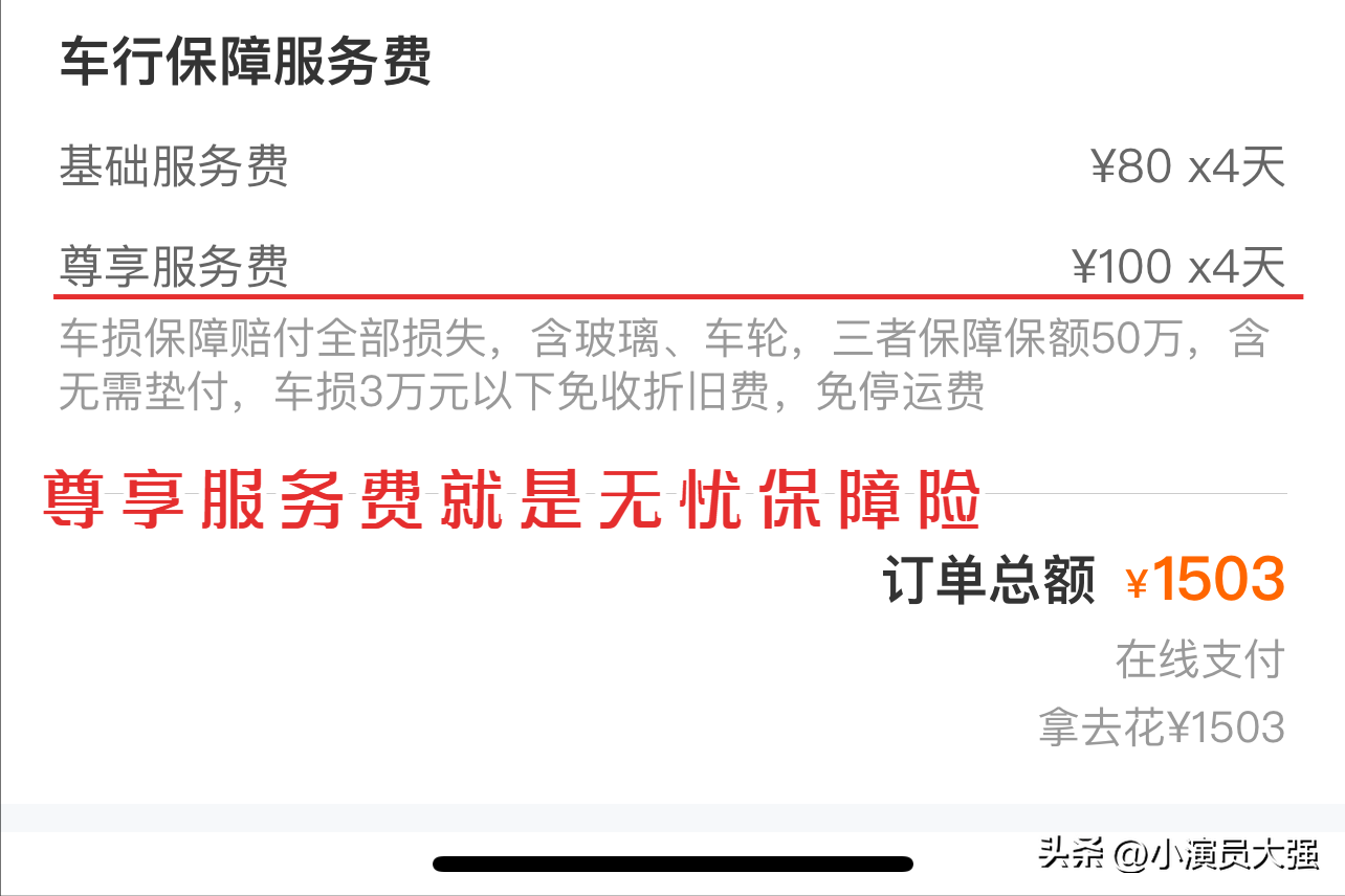 跟大季家聊一聊在北京短期租车的感受 前段时间家人要来北京看我,顺便也想看看首都,逛一逛,想着有台车能方便些,就在租车软件租了一台奥迪a4l。 图为租赁到的车辆,尾号是9 先跟大家算笔账,车一共租了4天,总价是1503,这其中包括基础服务费是80一天x4、买了个无忧保障险是100一天x4、还有个车行手续费是35,(无忧保障险就是尊享服务费,这个不是必须项,可以选择不买)价格基本上就是这个样子,大家参考一下。 具体价格及费用明细大家可以参考一下 再说说车,车是20款的a4l40tfsi最低配,车很新,里程表显示只有3万公里,车也很干净,4天使用下来没有什么问题,使用过程中加司机(就是我)一共是4个人,算是满员状态,4天一共行驶500公里左右,200公里高速,300公里市区,油费300,算下来每公里6毛,a4的油耗还是可以的。 奥迪a4,图片来自租车平台 奥迪a4内饰,图片来自租车平台 加油凭证 拿车第二天晚上加油,油箱加满 那车第三天晚上加油,油箱加满 拿车第四天晚上加油,油箱加满 切记,还车时车内油量要与取车时油量相等! 取车时油量剩余里程 还车时忘记拍照了,跟取车时一样,820公里,a4l满油续航里程应该是在840公里左右。 其次,验车一定要认真,当你取车时一定要看好车辆的情况,并拍照取证,虽然车行工作人员也会记录车辆情况并且会把记录发给你,但是自己还是一定要认真,记录车漆的划痕,轮毂的剐蹭,内饰的损伤以及玻璃等。我当时就疏忽了第二排点烟器收纳盒,取到车开回家才发现第二排的点烟器收纳盒是坏的,打开就无法关闭了,还好及时跟车行沟通了没有造成误会。 合不上的第二排点烟器盒子 限号城市的老铁一定要提前问清楚关于限号的问题,在你租赁期间由尾号限行造成的违章谁来解决,我租的这台车就涉及到这个问题,车行明确的告诉我尾号限行的违章由车行自己负责我放心使用。 最后,跟大家聊一下无忧保障险 前面提到的100块钱一天的这个保险,首先,这个价钱并不是固定的,其次,这个保险是车行自己的附加项目,每个车行的定价都不同,另外,也会根据车的品牌和型号浮动,但是保障的内容大致都一样,我购买了这个车行的最高档保险,100一天,具体项目可以见下图,购买这个就是图个安心嘛,这个大家可以根据自身情况来决定买或不买。 其他车行以及其他车型的无忧保障险项目 其他车行以及其他车型的无忧保障险项目 在这里我想吐槽一下,关于车行这个保险的问题,在你订车的时候,车行是默认强制性的让你购买一个基础保障险,价格大概在每天30-80之间,但是当你选择购买更高等级的无忧保障险后,这个强制购买的基础保障险不会被取消也不能被取消,会和无忧保障险叠加购买,所有车行都这样,这点让我很疑惑! 蓝线上就是基础保障险 押金分为车辆押金和违章押金两种,但这两种押金在大部分平台是可以支付宝授权信用分,及格的话是可以免押的,不免押的话车辆押金也会根据车辆的品牌和型号来定,少则几千,多则上万都不等,违章押金一般在2000-3000rmb。 可减免押金的车行 图为不可减免押金的车行 租车的原因主要是因为穷啊! 大学毕业后在北京也漂了许多年了,依然没车没房没存款,租的房是个一室一厅,家人来没地方住。并且他们这一辈子也没出过远门,北京也是第一次来,想让他们有个好的出行体验,也住个好一些的酒店。但是酒店还得离我住的地方近,因为他们就想在我这多待一会,可怜天下父母心。最终在离家5公里的地方选了希尔顿欢朋,实地考察过后订下了,酒店确实还不错,价格也不是很贵,家人对早餐很满意哈哈,但是唯一的缺点就是交通不方便,周围没有地铁站(虽然一开始也没想过让他们挤地铁吧) 这样一来有台车确实很方便,早上他们吃过早餐就能在酒店楼下接上他们出去玩,玩累了跟我回家休息,晚上在家吃个饭,困了送他们回去睡觉等等,自己家人啊,永远都想给他们最好的,在自己力所能及的范围内,能花点钱换来安心和舒适,也算是尽力一份孝心吧。 谢谢大家!