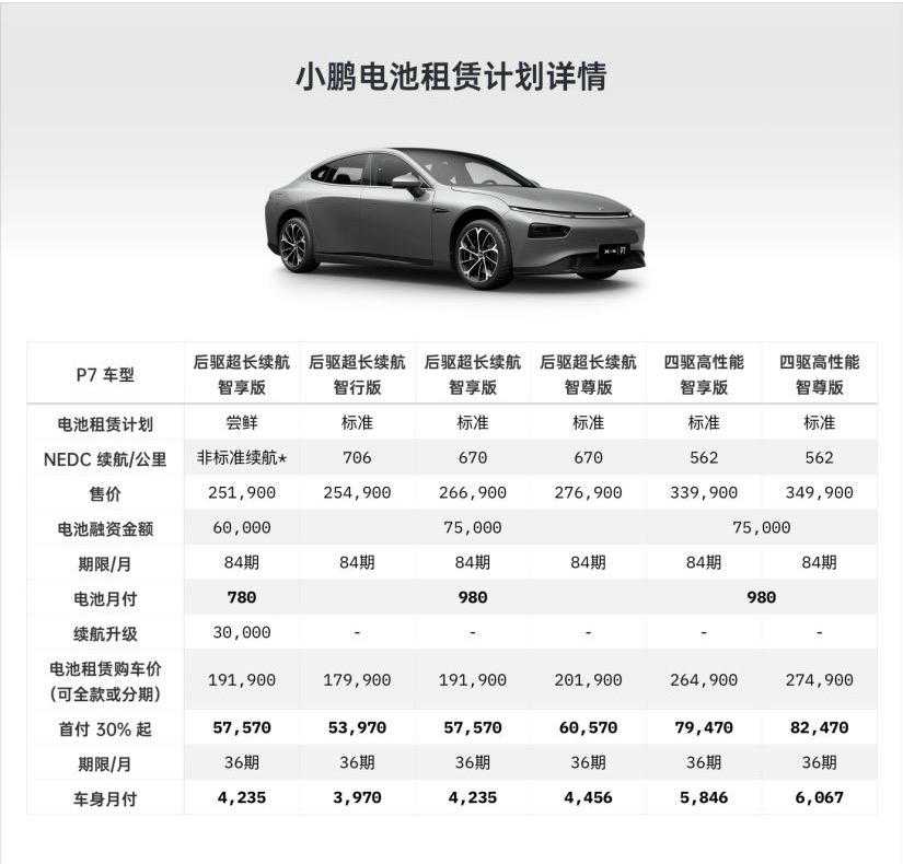 ---------------------------------- 刚刚上市的小鹏汽车并没有安于现状,而又开始有了新动作。在9月1日,小鹏汽车正式推出电池租赁计划,消费者可以通过7年84分期服务分摊电池成本,能够降低客户的购车门槛,而在7年的分期完成之后,消费者可获得电池的所有权;另外电池融资租赁计划中的车身价款也可以通过最低30%的首付购买,又能大幅度降低购车的压力。 目前该项服务在北京、上海、广州和深圳等城市以试点的方式实施,涉及车型包括小鹏P7的四驱高性能系列和后驱超长续航系列,同时还有小鹏G3520i系列(悦享版/智享版/尊享版)。 小鹏汽车的电池租赁计划有“尝鲜”和“标准”两个版本。标准版的电池租赁计划针对小鹏P7和小鹏G3,分别可以将车价降低7.5万和6万。 小鹏P7车型的84期每期需要支付980元(和现在蔚来汽车一样),小鹏G3车型84期每期需要支付780元。简单计算一下,小鹏P7车型的花费为84期x980=8.232万元,比一次性买断只贵了7320元,7年每年的年化利率不到2%。 至于尝鲜版的电池租赁计划,小鹏P7和小鹏G3的车价降低了6万和4.3万,小鹏P7车型的84期每期需要支付780元,而小鹏G3车型的84期每期需要支付580元。 小鹏汽车这次的支持电池租赁的电池组都是同一款,但是小鹏汽车会通过软件限制的方式锁定一部分的电池容量,所以“非标准续航”的车辆续航会低于其他版本的车型;因为小鹏汽车是通过软件限制实现的,所以选择“尝鲜”版的用户后期也可以通过加钱的方式“升级续航”。 在年初的时候,威马汽车就针对旗下的威马EX6Plus400轻享版车型推出了“车电分离”的直购模式,消费者详细解读“威马直购”的模式之后,“威马直购”被许多消费者称为“半价提车,六折回购”。 “威马直购”的大致政策可以理解为消费者仅需支付9.49万元便可购买威马EX6,但是不包含电池,之后可按月租赁电池,两年合同约期后,可以直接买断电池、转租为购或者直接由威马回购,大幅降低了消费者的购车门槛。 威马汽车在单车成本中,动力电池约占了电动汽车成本的50%。消费者选购完成后,需要签署行驶月费套餐,根据不同的行驶里程,提供两档不同的月费套餐。每个月行驶里程在1500km以内,前两年的月费为1599元;两年到期之后续约再优惠200元。如果消费者每个月行驶里程比较多,那就可以选择第二档月费套餐,费用为1999元,这一档不限里程数。 而“威马直购”的新零售模式还赋予了消费者充分的自主选择权,两年合同到期后,可以支付一定的电池买断价格,就可以完全拥有这辆车和电池的所有权。如果消费者选择不买断,也可以选择每两年进行续约,但是最高期限为六年,到了第六年之后,只需支付一元的价格,整车的所有权就默认归你了。 当然了,如果消费者使用两年或者几年之后,不想使用这辆车了,“威马直购”零售模式也提供了“保值回购”计划,分别为2年到期,回购价为6.09万元;4年到期,回购价为4.06万元;6年到期,回购价为2.09万元。威马汽车根据新能源汽车保值率的问题,给消费者提供了回购计划保障,这是实打实的有益于消费者购车政策。 而在此前,8月20日,蔚来汽车正式发布了电池租用服务BaaS(BatteryAsAService),提供车电分离、电池租用和可充可换的新型购车购电模式。 如果消费者购买蔚来汽车选择了这项BaaS模式,就可以在购车的时候不购买电池包,而购买机动车的销售发票价格中就不含电池包的价格,消费者的购车金融贷款首付和每月的还款均会去掉电池包的价格;而选择BaaS模式的消费者就需要根据自己的实际用车续航需求,按月付费的方式租用不用容量的电池包。 选择BaaS电池租用的消费者和购买电池的消费者同样都享受蔚来汽车的换电服务和电池灵活升级服务,还同样享受国家的新能源汽车购置补贴和购置税免征政策支持。 消费者选择了BaaS电池租用服务,就可以在原来的车价基础上节约7万元的成本,每个月只需缴纳980元的电池租赁费用,节约的购车款可以支付接近6年的电池租赁费用,计算下来这项电池租赁属于不涨价不降价的业务。 从威马汽车的“威马直购”,到蔚来汽车BaaS电池租用,再到小鹏汽车电池租赁,都是造车新势力对于全新商业模式的探索,为消费者降低购车门槛,吸引更多的潜在消费者,能够让部分预算不足的消费者多一条购车方式。那电池租赁计划是否能有效地刺激新能源市场,并将销量提升呢?只能有待进一步观察了。 ----------------------------------