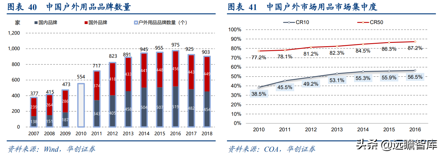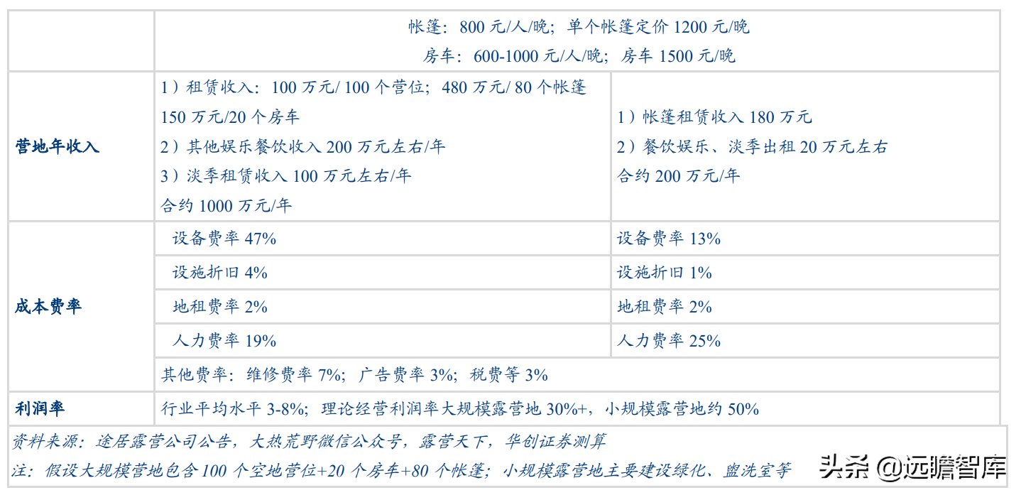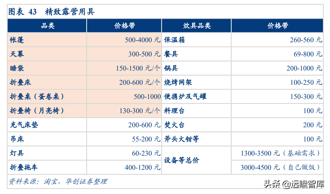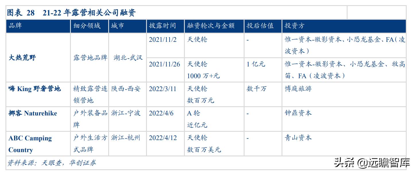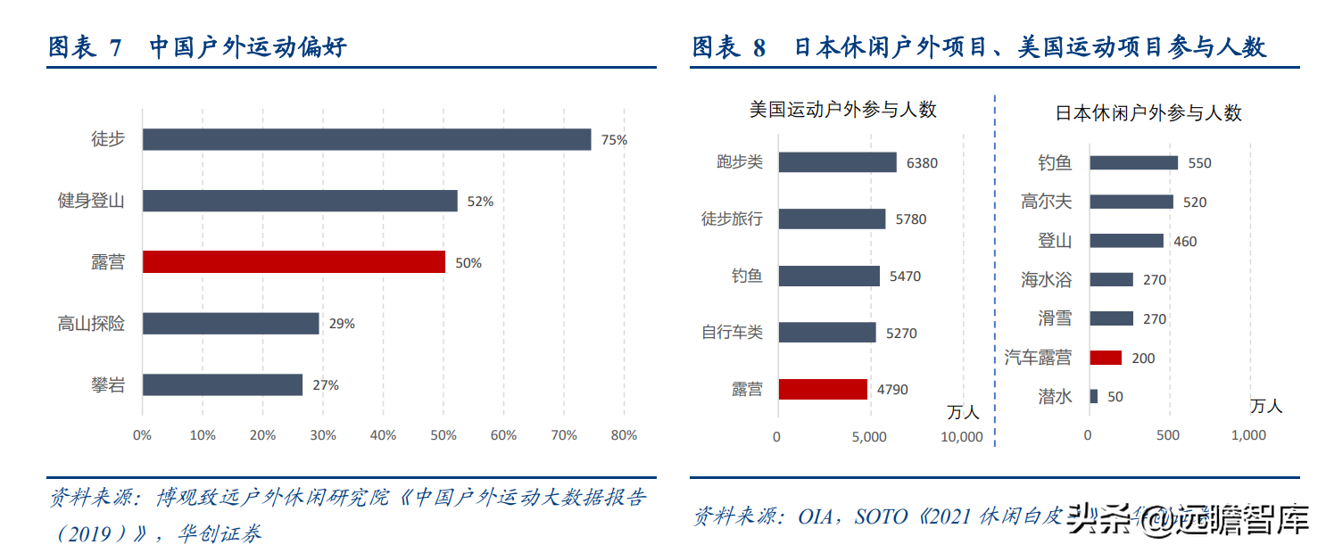 (报告出品方/分析师:华创证券王薇娜) (一)疫情带动近郊户外运动,中国户外市场持续增长 1、疫情防控催化,户外与露营需求大幅提升 疫情防控需求使得居民跨省流动受限,入住酒店花费不菲且可能增加风险暴露,周边游形式的户外活动热度增加,露营成为家庭聚会、朋友出行、接触户外的首选。 从21年清明假期开始,根据马蜂窝数据显示,2021年“周边游”的搜索热度同比增长2.5倍,其中3-4月春游旺季搜索热度增长3-5倍。2021年十一假期天猫露营用品销售量同比增长50%。 2022年春季综艺《一起露营吧》与小红书等社交平台内容教育下,露营需求再度爆发:小红书关于“露营”笔记数从22年初100万+笔记数,到5月底接近350万+笔记数。根据通联数据,22年1-4月天猫淘宝露营野炊装备累计成交额31.8亿元,环比翻倍增长。2022年1-4月通过携程报名露营游用户是2021年全年5倍以上。 供给端逐步优化,露营体验感提升,精致露营与“露营+”产品走俏。 精致露营概念在海内外走红,Glamping=Glamorous+Camping,主打远离自然条件恶劣的户外环境,追求享受户外。新增营地以帐篷营地、帐篷酒店为主,例如大热荒野旗下20家连锁露营地,定位野奢;嗨king20家营地更多在景区、特色小镇等开辟特色营地。 相比16-17年发展较快的房车营地,帐篷营地与自然融合度更高,在自然资源支持下开辟更多“露营+”活动。 2、中国千亿泛户外市场,户外参与度仍偏低 露营热度带动户外相关产品需求快速增长,中国泛户外市场以鞋服消费为主。我们估算中国泛户外市场近4000亿元。 根据通联数据,21年运动户外产品线上成交额共计3382亿元,线下渠道以迪卡侬为代表,我们预计2021年迪卡侬中国贡献营收超125亿元(2017年中国迪卡侬260+家门店实现105亿元收入,目前在中国已分布308家门店)。 根据通联数据,以线下为主专业户外市场约410亿元。我们预计泛户外市场中鞋服占比超6成,户外用品占比约3成,大约1200亿元,旅游产品等占比低于1成,根据中国钓具网数据2020年中国户外用品市场规模达1693亿元;根据通联数据21年天猫淘宝登山野营旅行用具销售规模达506亿。 中国运动参与度较低,其中露营渗透率不足1%。 中国参与户外运动人口约为1.3亿(2019年),在城镇人口中渗透率为15%,在总人口中渗透率约为9%。 欧美由于人文历史背景、对于户外生存教育的重视,所以户外参与度普遍较高。美国户外运动人口1.6亿,参与度为53%;以英国、德国、法国为代表的欧洲国家户外运动参与度也均超5成。 相较而言,日本参与户外运动的人口大约有800万,户外参与度为7%(20年略受疫情影响仅有610万人)。美国日本露营活动渗透率分别为14%/1.6%,中国渗透率不足1%。 户外运动泛指在自然环境进行的具有体验或探险性质的健身项目,既包含休闲需求,也包含野外生存型运动。中国户外运动更偏好徒步、健身登山、露营,兼具专业与休闲需求,消费粘性偏低但门槛低、潜在参与度高,适合亲子出行、朋友出行。相较海外较长户外运动发展历程,留存大量专业户外运动爱好者。 我们认为休闲式户外运动发展会先于专业式户外运动,户外运动规模化发展需要具备以下条件: 消费端: 1)人均GDP超1万美元,具备经济基础;2)GDP增速承压,期内人们工作压力较大,高线城市消费者更向往“一夕乌托邦”,且偏好低成本的旅行方式;3)户均汽车保有量较高,每千人汽车保有量达300辆左右。 供给端: 1)城市公园、郊区露营地、景区露营场景增加,资本推动露营地连锁化,标准化管理;2)户外设备快速适应中国市场需求,提高露营体验感。 (二)中国露营市场现状:小荷才露尖尖角 露营消费是休闲户外消费的典型,露营消费方式主要有四类: 1)公园露营,半日游为主,载体主要为城市公园(缺乏营地规划,密度高,缺乏商业化设施),消费者自带帐篷/天幕,人均消费0-80元(门票费); 2)精致露营/搬家露营,以2天1夜露营为主,设备全,人均消费150-200元(门票+营位租赁费、自备设备),拎包入住则人均700元以上,载体主要为商业化露营地(具备必要水电设备,甚至娱乐化项目,帐篷密度较低); 3)房车露营,过夜需求,载体主要在商业化房车营地,消费者自备/租赁房车,游玩时间1天以上,人均600元起(房车租赁550元~1700元+门票50元/天); 4)小屋露营,以多日游为主,主要在远离城市的郊区、中西部地区、丘陵/山岭/高原地带,更具特色。 16-17年在政策带动下,开出较多连锁营地的均为汽车/房车露营地,比如曾在新三板挂牌的奇瑞途居营地,旗下有20+汽车营地。 1、露营消费者:年轻人尝鲜需求为主,亲子游具有持续性 千禧一代为主力军,女性参与者更多,以朋友出行、家庭亲子游为主。根据露营天下数据,2017年预订房车露营的90后、00后仅占9%。根据马蜂窝数据,2021年露营消费者中90后、00后占比攀升至43%,4年间大幅提升28pct;80后占44%,基本维持稳定;70后占比大幅下降,仅占10%(17年占比28.6%)。 对比美国OIA数据,露营消费群体各年龄段分布相对均匀,Z世代综合占比32%。中国女性参与者更多,17年房车露营男女比例基本均衡,21年女性消费者均明显超过男性(男性:女性=36%:64%)。而美国则是男性参与者更多,性别比为男性:女性=54%:46%(近8年未改变)。 消费人群结构变化与海外形成差异的主要原因: 1)从中国消费需求端看,亲子游占比仅3成。年轻朋友出行“尝新需求为主”,日本露营人群8成以上与家人一同前往,更多追求与家人一起(占比41%)、孩