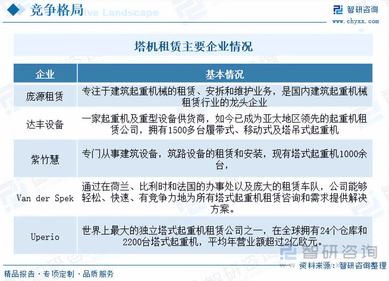 内容概况:2022年我国塔机租赁市场规模约1073.4亿元,较2021年下降2.6%左右,我国塔式起重机2022年销量仅为2.1万台,2023年来看,我国塔式起重机需求仍居低位水平,数据显示2023年上半年我国塔式起重机销量约1.04万台,国内销量占比超八成。 关键词:塔式起重机销量塔机租赁市场规模塔机租赁成本结构塔机租赁格局 一、塔机租赁产业概述 塔机全名塔式起重机,是建筑工地上最常用的一种起重设备,以一节一节的方式接长(高),像一个铁塔的形式,用来吊施工用得钢筋、木楞、脚手管等施工原材料的设备,是建筑施工一种必不可少的设备,塔机租赁属于建筑设备租赁,一般由专业的建筑设备租赁公司做塔机租赁,具备成本较低的优,适用于缺乏购买塔机能力的中小型房地产企业。目前,塔机的租赁业务模式主要分为经营租赁和一体化租赁两种,经营租赁是指塔机租赁公司单纯为客户提供塔机设备的租赁业务,出租人负责塔机的维护修保养,本质是让渡设备的使用权,一体化租赁是指塔机租赁公司为客户提供涵盖咨询、设计、施工、维护、售后等在内的一站式塔机解决方案服务,本质是移交服务指令权。 二、塔机租赁产业背景 融资租赁配套法律法规持续完善,乘融资租赁东风,工程设备租赁将维持高速发展。2020年以来,随着国内融资租赁监管标准不断提高,行业步入转型优化期。2021年5月起,国资委、央行、银保监会陆续发布文件,规范融资租赁行业发展,要求回归业务本源,提升服务实业能力,多个省市在“十四五”金融发展规划中也对融资租赁行业提出聚焦实体经济的发展规划。2022年,稳增长压力下央行、银保监会出台了多项金融支持实体经济文件,融资租赁业作为重要的非银金融部门响应号召,积极阔表,塔机等工程租赁业有望乘其东风,维持高速发展。 三、塔机租赁产业链 塔机租赁行业产业链包括上游塔机设备供应以及人力技术支持,行业厂商比较分散,为充分竞争性行业,市场供应充足,行业产品技术水平是行业最为主要的增值环节;塔机租赁行业下游主要集中在房地产、建筑业等领域,主要有房屋建筑工程、电力工程、市政公用工程等建筑施工行业,与经济周期的变化关系密切,很大程度上依赖于国民经济运行状况及国家固定资产投资规模,特别是基础设施、城市化进程及房地产发展等因素。 塔机租赁产品成本主要包括设备成本、人工成本以及其他费用。其中,人工费用和塔机设备折旧对于塔机租赁成本的影响最深,占塔机租赁整体产品比重超过71%。另外由于塔式起重机产品体型较大,一般采用分段运输,加之安装复杂,整体运装费用占比成本也较高。 四、塔机租赁产业现状 房地产行业高景气度带来建筑设备领域的大量资本涌入,塔机制造产能急速扩张,而塔机制造商竞争加剧,“零首付和延期付款”等非理性促销出现,大量个人大幅举债采购塔机进入租赁行业,我国塔机销量快速增长,叠加房地产持续扩张,供需两旺背景下,我国塔机租赁行业飞速增长,数据显示,我国塔机租赁市场规模在2021年及以前快速增长,随着国内持续出台融资相关监管政策,叠加下游房地产终端需求波动,塔机租赁市场规模有所下降,2022年我国塔机租赁市场规模约1073.4亿元,较2021年下降2.6%左右。 相关报告:智研咨询发布的《2023-2029年中国塔机租赁行业市场专项调查及投资前景分析报告》 我国塔式起重机销量变动情况而言,2016年以来我国塔式起重机销量快速增长,一度在2020年达5万台,需求和政策影响,我国塔式起重机2022年销量仅为2.1万台,2023年来看,我国塔式起重机需求仍居低位水平,数据显示2023年上半年我国塔式起重机销量约1.04万台,国内销量占比超八成。 五、塔机租赁竞争格局 相较于塔机生产销售,塔机租赁行业,尤其是小型塔机租赁的门槛较低,小规模资金有能力进入行业。塔机属于重型资产,跨省远距离移动成本过高,因此具有强烈的地域性,进而导致我国塔机租赁市场集中度较分散,中小企业数量众多,大型企业相对较少,主要有为庞源租赁、达丰装备、紫竹慧等,其中庞源租赁居龙头地位,按照企业类型可分为大型民营塔机租赁企业、国有建筑施工企业所属塔机租赁企业、中外合资塔机租赁企业,其他涉及塔机租赁企业,未来随着装配式建筑渗透率的提升,大中型塔机将成为主流,同时塔机租赁行业也将进一步集中。 庞源租赁是世界500强企业陕西煤业化工集团有限公司旗下上市公司-陕西建设机械股份有限公司最大的全资核心骨干子企业,庞源租赁对外租赁的起重机械主要包括塔式起重机、施工升降机、履带式起重机、架桥机等,是国内规模最大、设备种类最为齐备的建筑起重机械经营租赁企业之一,可以满足不同工程的施工要求,与同行业竞争对手相比具有明显的规模优势。就其经营现状而言,2021年及以前随着国内房地产需求和企业经营策略推动,庞源租赁整体租赁营收持续增长,随着国内房地产需求不振,2022年整体建筑施工产品租赁营收为35.3亿元,较2021年下降18%左右,毛利率水平也达近年来最低值24.24%。 六、塔机租赁发展趋势 塔机租赁市场具有较高的服务性特点,与一般的租赁不同的是,塔机的租赁企业往往要根据客户的实际需求,推荐不同的型号,同时还对塔机安全运转、维护、安装运输等承担一定职责,租赁合同定价具有较为明显的差异性。随着市场需求的增长,塔机自身的技术