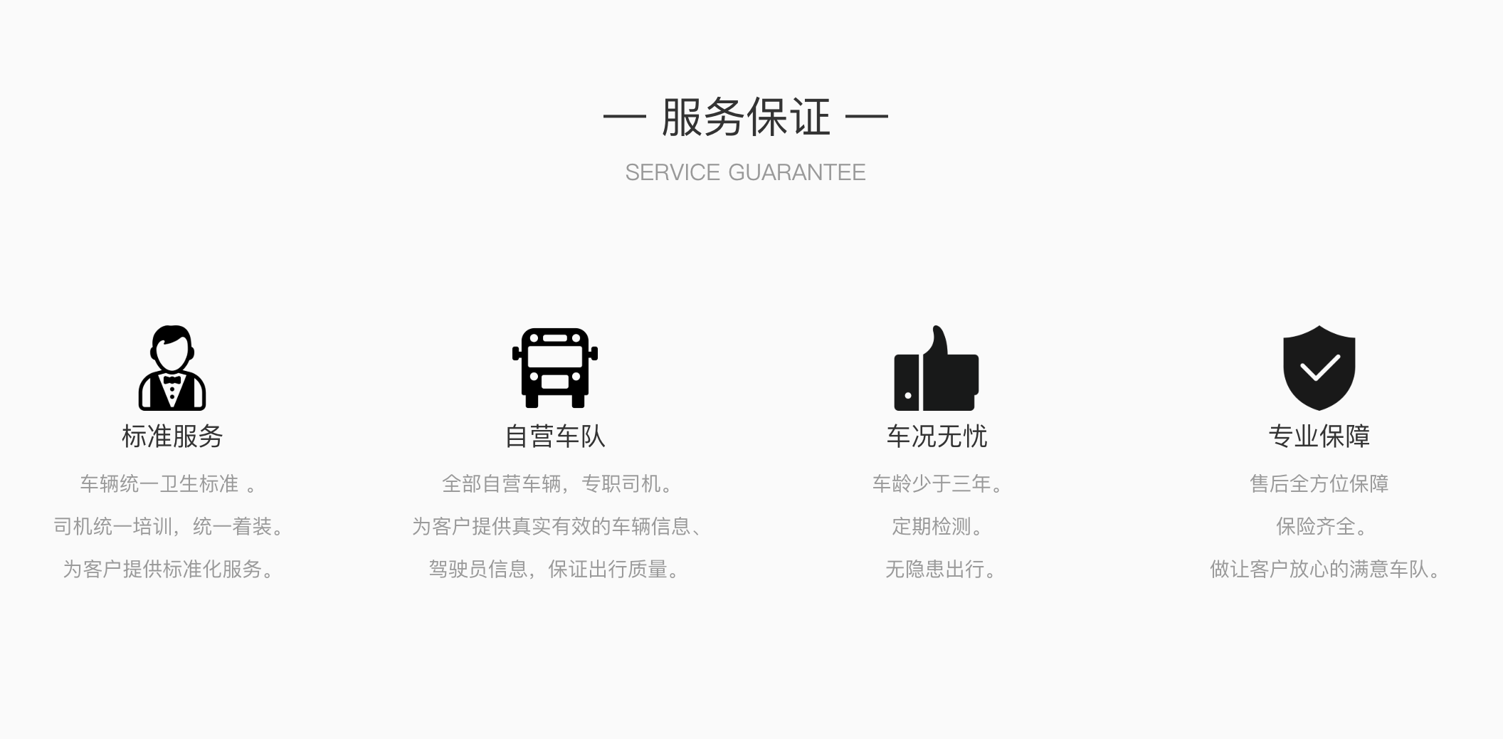 2、自营车队:全部自营车辆,专职司机。为客户提供真实有效的车辆信息、驾驶员信息,保证出行质量。