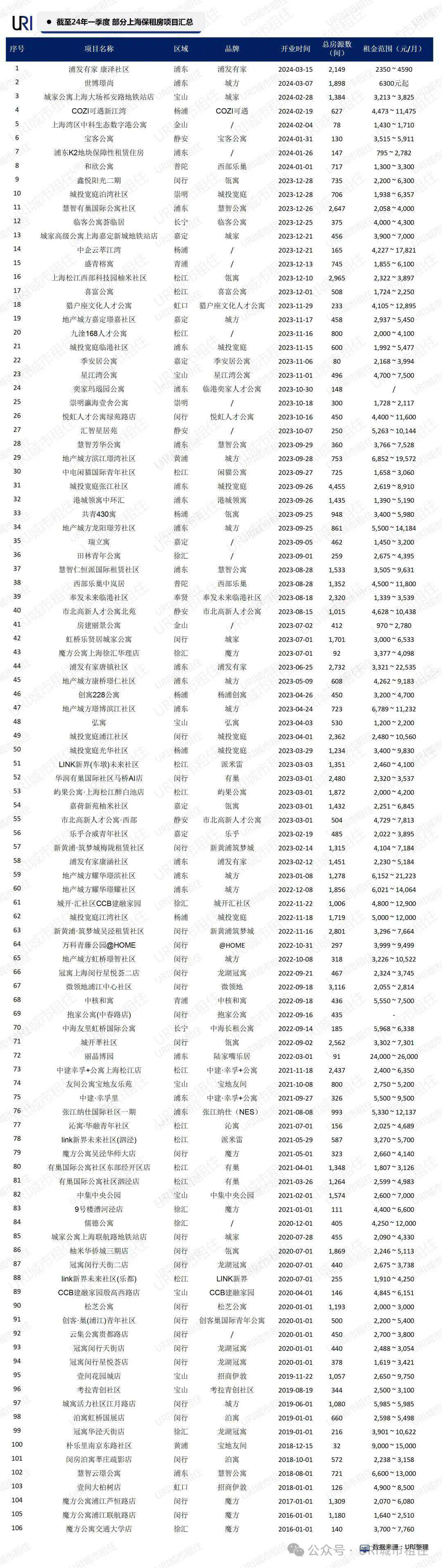 “十四五”期间,上海计划新增建设筹措保障性租赁住房47万套(间)以上。其中,2024年将建设筹措7万套(间)保租房以满足新市民、青年人的租赁需求。 截至2024年一季度,据URI不完全统计,上海保租房项目已超100个,房源总量近30万套(间)(含新建与纳保项目),其中新建项目占比达67.8%。随着保租房市场份额占比的扩大,其对租赁市场起到了“压舱石”和“稳定器”的作用。 以下展示部分项目,如需更明细数据,请联系我们咨询 新黄浦·筑梦城梅陇租赁社区 供应套数:1315间|套 户型及租金:包含Studio、一室一厅、二室一厅等多元化户型,面积在37-64平方米,租金价格4104-7184元/月 具体位置:闵行区曙丰路100弄 交通:距离地铁15号线景西路站直线约500米 特色:智能社区物联管理以及24小时安保监控,地下拥有充足停车位的超大车库,全部采用环氧地坪。从住户的楼栋电梯直达地下车库,十分便捷通畅。 新黄浦·筑梦城梅陇租赁社区实景图 地产城方龙阳璟芳社区 供应套数:861间|套 户型及租金:提供一房、二房、三房,面积在47-118平方米,租金价格5500-14184元/月 具体位置:浦东新区龙汇路66弄 交通:距离地铁2号线、7号线、16号线、18号线龙阳路站直线约800米、距离7号线芳华路站约400米 特色:约2万㎡配套商业空间,包含文化运动、教育培训、餐饮零售、生活服务等。国企房东,专业管家运营,24小时安保服务,民用水电燃。 地产城方龙阳璟芳社区实景图 地产城方璟博滨江社区 供应套数:723间|套 户型及租金:约53平方米一室、约65平方米两室一卫、约85平方米两室两卫,租金价格6789-11232元/月 具体位置:浦东新区东三里桥路183弄 交通:距离地铁4号线塘桥站直线约1200米 特色:每个户型都配备独立卫浴和封闭式独立厨房,并提供品牌家具家电,满足丰富多样的生活需求,真正做到拎包入住,安心居住。 地产城方璟博滨江社区实景图 慧智仁恒派国际租赁社区 供应套数:1533间|套 户型及租金:包含50-128平方米多种户型,租金价格3505-9631元/月 具体位置:浦东新区周秀北路86弄1-60号 交通:距离地铁16号线周浦东站直线约550米 特色:打造租赁住宅+公共绿化景观+社区会所休闲+社区商业配套为一体的大型综合高品质国际租赁社区。 慧智仁恒派国际租赁社区实景图 猎户座文化人才公寓 供应套数:233间|套 户型及租金:标准一居室、精品LOFT,面积在23-70平方米,租金价格4105-12895元/月 具体位置:虹口区大连路1053号 交通:距离地铁8号线鞍山新村站直线约600米 特色:公寓配备中央空调、广播系统、公共监视系统、地暖、电视、厨房等一应俱全的家电设备,营造出时尚优雅端庄的空间氛围。 猎户座文化人才公寓实景图 港城领寓中环汇 供应套数:1435间|套 户型及租金:仅提供一房,面积在21-66平方米,租金价格1390-5190元/月 具体位置:浦东新区康桥路1760号 交通:距离地铁11号线、16号线罗山路站直线约800米 特色:社区特别设置了共享空间,不定期举办各类社群活动,丰富职工的社交、文化、娱乐生活,体验温馨有趣的租住氛围。 港城领寓中环汇实景图 九淦168人才公寓 供应套数:800间|套 户型及租金:40平方米的一室户和75平方米的两室户,租金价格2000-4100元/月 具体位置:松江区九干路168号 交通:松江46路、松江48路 特色:每个房间内还配备了无线网络、淋浴器、空调、洗衣机、书桌、床、衣橱等,还有总用地面积约1.9万平方米的泗泾都市运动中心。 九淦168人才公寓实景图 中电闲猫国际青年社区 供应套数:725间|套 户型及租金:以一居室为主,并配有多人间,面积在25-50平方米,租金价格1658-3060元/月 具体位置:松江区广富林路5000号6-9号楼 交通:松江98路、1805路 特色:配套餐饮、24小时便利店、休闲咖啡等生活配套服务和青年人喜欢的活动空间;公寓内的房间设计温馨舒适,家电家具设施俱全,可实现拎包入住。 中电闲猫国际青年社区实景图 和欣公寓 供应套数:717间|套 户型及租金:以一房为主,并配有多人间,面积在25-50平方米,租金价格1300-3300元/月 具体位置:普陀区武威东路718号 交通:紧邻地铁15号线武威东路站 特色:公寓明亮整洁、窗明几净,每个房间厨卫齐备、可拎包入住。周边有大华第一坊、巴黎春天等综合商业,以及天佑医院、利群医院、德济医院等医疗机构,还包括城市公园。 和欣公寓实景图 悦虹人才公寓绿苑路店 供应套数:450间|套 户型及租金:主要有一房和loft,面积在33-123平方米之间,租金价格4400-11600元/月 具体位置:闵行区绿苑路99号 交通:距离地铁10号线上海动物园站直线约700米 特色:房间内配置大屏幕电视、干湿分离卫浴间、一字型开放式厨房等,同时在社区内配有24小时便利店、健身房、洗衣店、轻餐等,满足都市青年日常生活所需。 悦虹人才公寓绿苑路店实景图 临客公寓荟临居 供应套数:375间|套 户型及租金:均为一室户,单套建筑面积37平方米左右,租金价格4000-4300元/月 具体位置:长宁区协和路1599号 交通:新泾1路 特色:屋内包含独立厨房、卫生间及阳台,并配备了齐全的家具和家电,绿色环保,风格明快,可以实现拎包入住的需求,部分房间为简装,适合希望自带家具入住的租户。 临客公寓荟临居实景图 微领地浦江中心社区 供应套数:3116间|套 户型及租金:主力房型为一室户,面积在11-20平方米,租金价格2055-2814元/月 具体位置:闵行区康华路131弄29~30号 交通:距离地铁8号线沈杜公路站直线约1100米 特色:社区在