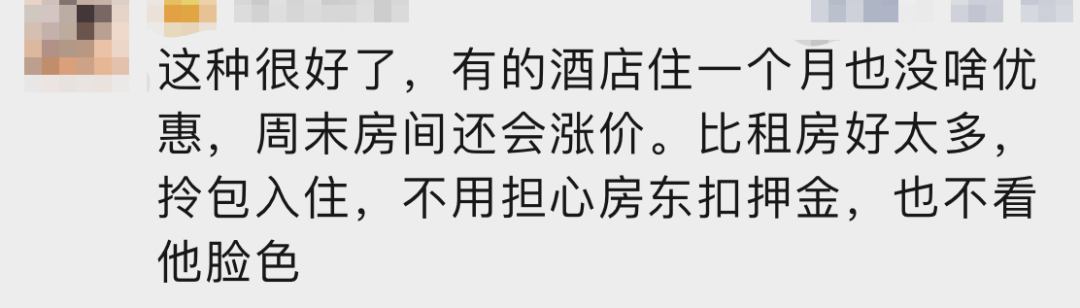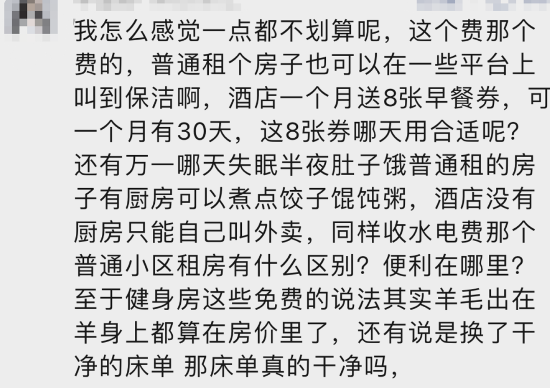 最近,一种新兴的租房模式开始兴起, 不但每天有人帮忙打扫卫生、换床单, 还能享受24小时免费的水电费和网费, 无需押金,拎包入住, 那就是——“长租酒店”。 在社交平台上,“长租酒店”已成热门话题, 以此为关键词可以搜到2万+篇笔记。 杭州临平小伙小徐今年28岁, 从事媒体行业,目前正在创业。 由于每天下班时间不定, 为了不影响到父母的作息, 一年前,小徐选择搬出来住长租酒店。 小徐感慨,住酒店比租房舒服太多了, 不用自己操心打扫卫生, 还有免费丰盛的自助早餐和健身房。 而且上下楼都要刷卡, 有24小时安保,居住舒适又安全。 一个月开销4300元左右 包含房租、清洁费、停车费等 小徐平时工作忙,没有精力操心柴米油盐, 再加上单身小伙也不太会做家务, 因此当初在选择房子的时候, 小徐就选择了用酒店长租来代替租房。 01 房费3200元/月 小徐选择的是一家连锁品牌的高档型酒店, 位于市区,周边小吃店、超市林立, 衣食住行很方便, 原本酒店一晚的价格大概在250元左右, 小徐以长租的形式享受了优惠价格, 每月花费3200元左右。 在酒店配套方面, 酒店每月还会送8张早餐券和4张咖啡券, 小徐可以在酒店自助餐厅和咖啡厅, 享受免费的美食。 酒店内有商业健身房, 里面设施齐全,装修高档, 而且对他们这些房客都是免费开放的, 相当于一年一千多元的健身钱也省下了。 此外,房间内还有冰箱、洗衣机和WiFi, 生活方面可以说相当便利。 02 清洁费232元/月 由于长租价格比单租便宜许多, 因此酒店只送了小徐一年2次的清洁打扫, 如果额外需要阿姨上门清洁的话, 每次的清洁服务费在58元左右。 小徐说由于他周末回家住, 每周在酒店住5天左右, 平时下班回到酒店也是直接洗漱睡觉, 因此一周叫阿姨上门打扫一次就够了, 算下来一个月232元。 每次阿姨都会帮他换好干净的床单, 打扫好卫生间,顺便把房间垃圾倒掉, 不需要他额外操心。 03 水、电、物业管理费等共900元/月 和一般的长租酒店不同的是, 小徐住的酒店楼下是正常营业的酒店, 楼上几层是专门提供给长租客人的酒店式公寓, 因此酒店还要额外对水电费进行收费。 电费是0.9元/度,冷水1.5元/天, 热水50元/吨,中央空调外机费30元/月, 平均算下来,一个月大概要300元左右。 同时,酒店还要收取每月300元的管理费, 用于帮长租客人收取快递、外卖等。 此外,店长还帮小徐联系了一个车位, 月租费花费300元。 小徐说以前他也租过房, 同地段房租每月3500左右, 房东要收3000元的押金。 虽然水电费比酒店便宜, 每个月只要130元左右, 但是加上物业费、停车费和网络费, 价格也和住酒店差不多了, 但是生活上却没有住酒店舒适。 “长租酒店”兴起背后原因被曝光 选择新兴模式需谨慎 这种模式开始兴起的原因, 其背后还是年轻人的消费观开始转变, 不想在家务上耗费时间, 又重视配套设施和服务, 酒店长租房对于年轻人来说, 是个不错的选择。 再加上近几年酒店行业遇冷, 入住率和客单价均有所下降, 为了缓解现金流压力, 提高入住率,减少部分损失, 越来越多的商家开始降价推出长租房服务, 这也为年轻人提供了更多新选择。 当然,尽管酒店长租看起来完美, 但依然有踩坑的可能, 单间房间环境逼仄,来来往往的住客, 以及不能做饭等隐形问题, 大家在选择长租酒店时,还是要多加慎重。 网友评论 对此模式 网友看法不一 有人认为这种模式值得探索 ▼ 也有网友觉得并不划算 ▼ 你觉得住“长租酒店”值吗?
