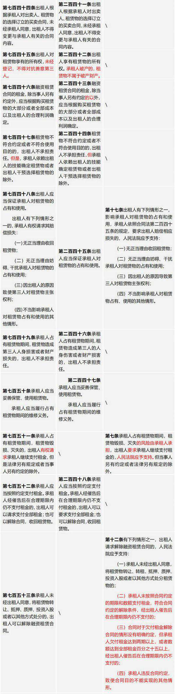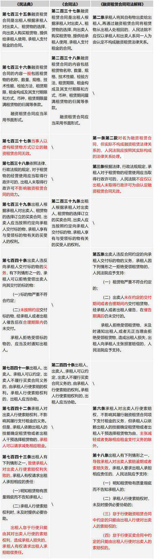 《民法典》合同编第十五章共二十六条专章规定了"融资租赁合同",在《合同法》第十四章及最高人民法院于2014年2月24日发布并于2014年3月1日生效的《最高人民法院关于审理融资租赁合同纠纷案件适用法律问题的解释》(法释〔2014〕3号,以下简称《融资租赁合同司法解释》)等规定的基础上,对已有规定作出了部分修改,并新增了个别条款。其中,第七百三十五条延续了《合同法》第二百三十七条对"融资租赁合同"的界定,删除了《民法典(草案)》中第七百三十五条第二款关于售后回租的规定,即"承租人将其自有物出卖给出租人,再通过融资租赁合同将租赁物从出租人处租回的,承租人和出卖人系同一人不影响融资租赁合同的成立。"因此也在一定程度上引发了关于售后回租业务模式合法性等方面的争议。《民法典》与《合同法》《融资租赁合同司法解释》的条款对比具体如下: