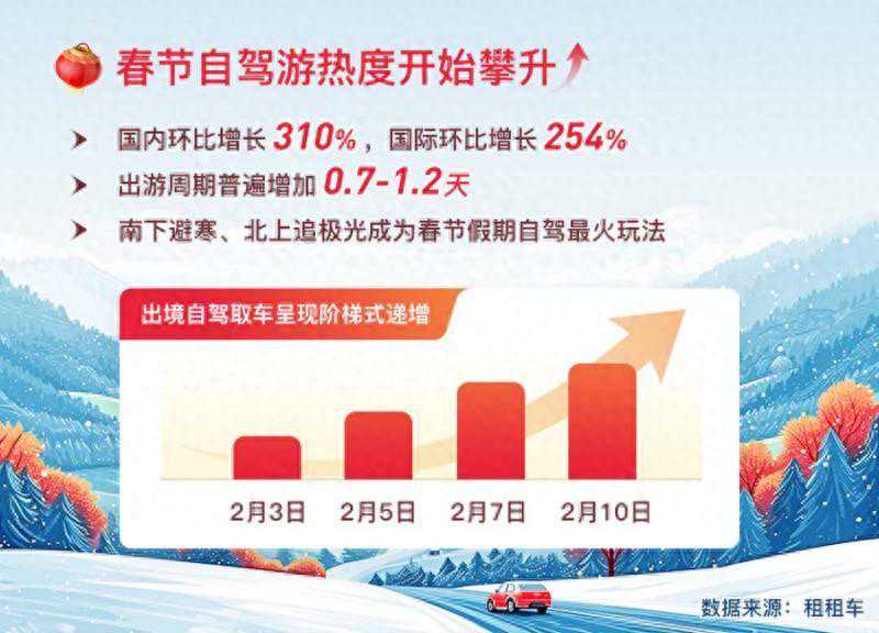 1月12日,全球自驾游平台租租车数据显示,元旦期间租租车国内租车订单同比增长197%,出境租车订单同比增长734%。元旦刚过,春节自驾游相关旅游目的地热度开始攀升,截止1月第一周,春节期间国内自驾游热度环比增长310%,出境自驾游热度环比增长254%,春节出境订单有望超过去年国庆峰值。 整体来看,元旦的出游人次高于2023年国庆的水平,春节旅游市场大概率延续此般火热,稳中有增。且根据国务院办公厅关于2024年部分节假日安排的通知,今年春节放假调休,共8天。鼓励各单位结合带薪年休假等制度落实,安排职工在除夕休息。很多消费者将实质性迎来9天长假,得益于假期的延长,其出游周期普遍增加0.7-1.2天,春节期间旅行更为从容。 当然,心急的消费者都选择拼假出行。对于出境自驾的用户,第一波集中取车高峰期将在2月3号到来,并整体呈现阶梯式递增,2月份的5日、7日、10日都将是新一波的取车高峰。除夕前几天便拼假出境游玩的消费者更多在14日还车,留下3天时间,回老家探亲,而2月16还车的消费者更多集中于除夕前后出发。国内自驾方面,集中取车高峰将集中于7-9日三天中,而还车高峰则出现在16日。 从目的地来看,国内目的地相较往年明显呈现旅游与回家的分化。回家的消费者更多选择年前自驾出发,主要来自上海、北京、深圳、广州、厦门、南京、成都、重庆、西安、宁波等城市;而旅游的消费者更多选择“飞机+车”或者“高铁+车”的出行方式,从三亚、昆明、成都、深圳、广州、哈尔滨、厦门、丽江、大理、海口等城市出发,进行一场5天左右的自驾游。 刚刚过去的元旦假期中,来自港澳地区的游客纷纷北上打卡。租租车数据显示,由于叠加圣诞和元旦假期,港澳地区游客12月北上自驾环比增长481%,其最“中意”的目的地是深圳、成都、上海、珠海、广州、北京等城市。春节期间香港地区游客同样可以请三休九,2月13-15日请假即可拼出9天长假出行,届时港澳同胞到内地自驾必将迎来新高峰。 国际方面,春节期间热门目的地将会是泰国、马来西亚、挪威、美国、意大利、新西兰、澳大利亚、西班牙、英国等国。这个春节假期,温暖的东南亚、中东和正处夏季的南半球将更受自驾游爱好者亲睐。以马来西亚为例,12月1日开放免签后一个月,自驾用户增长环比翻倍,预计春节期间还有更大客流。最热门城市为吉隆坡、兰卡威、哥打京那巴鲁三城,吉隆坡最为热门,兰卡威增势最猛,增幅环比超过160%。同处温暖地区的沙特阿拉伯是这个春节自驾游“新贵”,截止1月4日,春节期间订单环比翻倍,其中被誉为沙特最值得去、且必去的目的地埃尔奥拉最为亮眼,获得大量钟爱小众目的地的自驾游爱好者垂青。 无独有偶,这个春节北欧国家将格外亮眼,由于2024年也是太阳黑子“大年”,北半球高纬度地区频繁爆发极光,到追极光成为春节假期北欧自驾最火热的玩法。截止目前挪威、芬兰订单量均环比增超500%。同处北欧高纬度地区的冰岛由于前期地质活动频繁,消费者旅行信心虽未完全恢复,但订单仍环比增长超过200%。 文/北京青年报记者温婧 编辑/田野