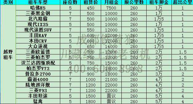 都说现在越来越多人们喜欢租车自驾游,一方面自己能体验驾驶的乐趣,另一方面又能享受途中的美景。那么,从成都租车到拉萨多少钱一天呢? 影响租车价格的因素有很多,以租车时间与租车车型为主。下面小编就来详细说一说。 一、租车时间 成都租车到拉萨也就是我们常说的川藏线自驾游租车,作为一条旅游路线它也会有淡旺季之分。一般来说5-10月都是川藏线的旅游旺季,租车的人会比较多,然后车源就会紧张,价格也就会有所上涨。 二、租车车型 租车车型也是影响价格的重要因素,车型不用,价格也就不同。一般来讲,本田CRV日租金在600左右,帕杰罗700左右一天,普拉多900左右一天,陆巡日租金1200左右。小编整理了一下价格表,如下所示。 注: 1.以上价格仅供参考,详细可来电咨询; 2.油费与过路费自理,不含保险费; 3.如需代驾,须补司机工资费用,平均150元/天; 4.月租、年租、长租,价格更优惠哦。 最后,成都租车去拉萨到底多少钱一天呢?这个不好说,大家按经济情况与实际需求来选择就好。