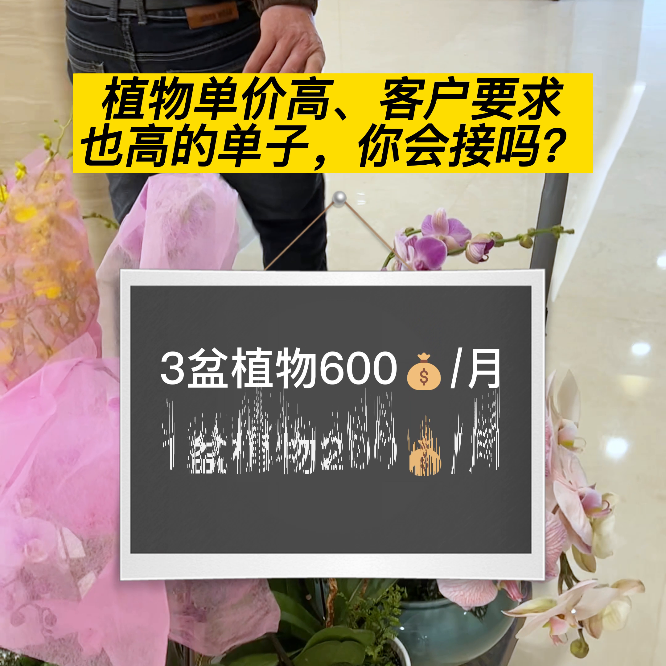 植物单价高,客户要求也高的单子,你会接吗? 植物单价高、客户要求也高的单子,你会接吗? 1.3盆植物,每周养护2次,2.月租金600。 3.非工作时间段养护和更换,只要3盆植物,每周上门养护2次,月租金600。非工作时间段进行养护。 3盆植物600/月,乍一看,3盆植物600,平均每盆植物的月租金1盆植物200/月,达到了200,感觉非常可以,但是最后一点,必须定时定点进行养护,浇水要在早班之前,要在晚班之后,过了时间就不允许进入,这才是你赚不赚钱的关键! 人工费用是否会增加?非工作时间段,养护人员的人工费用是否会增加?交通成本是否会增加?客户单位的距离远近,更换成本是否会增加? 遇到这样的单子,你会接吗?花卉租摆