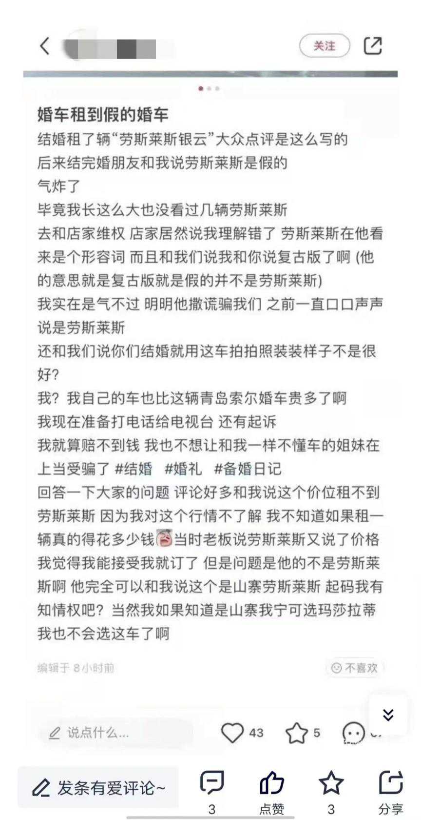 11月24日,上海市场监管披露了一起案件,有黑心婚庆公司为了一己私利,出租给新人一辆“假婚车”。 2023年8月2日,普陀区市场监管局对多家婚车租赁公司进行了现场检查发现,多家涉案的婚车租赁公司在某点评平台店铺上架了一款名为“劳斯莱斯银云”车的婚车租赁服务。 (注:劳斯莱斯银云是限量古董车,2013年广州曾以1500万元为底价开拍过一辆,现在的价值预估在2000万元以上) 2017年1月24日,四川成都老爷车展上的一辆1956年劳斯莱斯银云。 租赁服务页面显示,商家多次使用了“劳斯莱斯”“银云”“劳斯莱斯银云”等文字用以描述其提供的待租车辆。 然而,这些车辆并非劳斯莱斯。通过查验,所谓“劳斯莱斯银云”车的注册登记底档、行驶证件、产权证书等文件,并邀请权利人对涉案车辆进行辨认和鉴别,最终确认涉案车辆是一家国内汽车公司生产的某品牌汽车。 涉案的婚车租赁公司多次使用“劳斯莱斯”“银云”“劳斯莱斯银云”等文字或者图片,让消费者误认为其提供的该款待租车辆是劳斯莱斯汽车有限公司的银云车,或者与劳斯莱斯汽车有限公司存在特定联系。 本案中,各个当事人实际并不能提供真正的劳斯莱斯银云车租赁服务,只能提供某品牌汽车的租赁服务。即将出租给新人的劳斯莱斯银云车,是用某品牌汽车冒充的。 依据《中华人民共和国反不正当竞争法》第六条,经营者不得实施下列混淆行为,引人误认为是他人商品或者与他人存在特定联系:(一)擅自使用与他人有一定影响的商品名称、包装、装潢等相同或者近似的标识。涉案的婚车租赁公司构成了商业混淆的违法行为。 市场监管部门提醒,经营者在提供服务中,必须如实地向消费者明确说明所售商品或者服务的价格、产地、生产者、用途、性能、规格、等级、等内容,不得欺诈消费者。经营者在经营活动中也要守法经营,公平竞争。投机取巧企图“搭便车”“冒名牌”“傍名牌”的行为有可能违反相关法律法规,最终得不偿失。