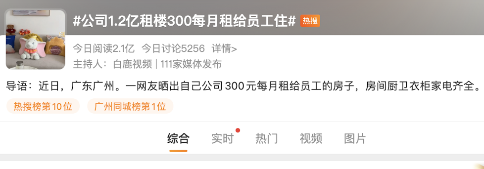 “公司1.2亿租楼300每月租给员工住”该话题登上微博热搜,引起大众热议。记者了解到,该公司为位于广东广州的唯品会,此处公寓于今年五月启用,共672套住房,入住员工95后占比六成以上,值得一提的是,周边同类型住房每月房租需三千元以上。 投资1.2亿元为员工提供月租300公寓 近日,一些互联网企业员工在微信朋友圈、抖音、小红书等平台上“晒房”,晒出自己公司300元每月租给员工的房子,房间厨卫衣柜家电齐全,可拎包入住,公共区域还有图书馆,健身房等生活设施。有居住员工表示,一年能省三万多元,生活品质能有质的变化。 今日,该消息登上微博热搜,记者了解到该企业为位于广东广州的唯品会。房子是广州的特卖电商唯品会投资1.2亿元在广州市中心核心地段拿下5栋大楼,改造672套公寓并交付给员工入住。 据悉,这处员工公寓名为“唯家公寓”,总计建筑面积约3万平方米,地处广州大道南,距离海珠万达广场直线距离200米。周边同档次拎包入住的公寓租金多为每月3000多元,唯家公寓的租金则300元/月,租金仅为市场价的1折。 唯品会相关负责人介绍,唯家公寓于2023年5月竣工启用,为便利员工生活,唯家公寓建有会客厅、图书馆、健身房、充电桩等配套设施,并为入住员工提供24小时热线等物业服务;入住唯家公寓的员工中,95后占比六成以上,刚毕业的大学生入职后也会获得抽签入住的资格。 资料显示,除了唯家公寓,唯品会早前同样以市价1折向广州、上海的员工提供了总计近400套公寓。截至目前,针对在广州总部上班且在广州、佛山没有房产的员工,唯品会已解决了其中九成以上人员的住房问题。去年,唯品会曾同时获评“2022福布斯中国年度最佳雇主”和“2022福布斯中国年度最具可持续发展力雇主”。 国内多家企业致力减轻员工住房负担 记者了解到,京东宿迁客户服务中心的员工宿舍曾因其豪华装修而走红网络。该中心集办公和住宿于一体,前五层是办公区域,六到二十层是员工宿舍。每间宿舍可居住一到两人,配备独立卫浴、厨房、阳台,以及茶憩桌、写字台等。除此之外,公寓内还有健身区、图书区等公共活动区域。 今年5月4日,京东还启动“京东青年城”项目,预计投入近60亿元在北京亦庄总部附近地块兴建4000多套自持员工租赁公寓。其中还为实习生准备了千余套公寓,并配备幼儿园、游泳馆、休闲健身等区域。 据京东集团介绍,目前京东在全国各个职场、物流园区拥有超2.5万套员工公寓,在员工居住条件改善上已投入超220亿元。去年也曾投入100亿元设立“住房保障基金”。 京东青年城/图源:官网 华为员工公寓不单考虑到员工单身生活,也考虑到了员工成家后的居住需求。 据资料显示,百草园公寓是华为深圳总部坂田基地的员工宿舍区,楼房为欧式建筑风格,房间大多为独立单间,为单身员工提供住所,华为的一线员工都可以申请入住,园内有会所、医院、游泳池、运动场等。还有上海青浦华为人才公寓,用地面积约49976平方米,与百草园建设理念相同。 华为员工在公司工作期间结婚成家,则有机会申请到华为另一员工宿舍区——荔枝苑。荔枝苑房屋户型分一室一厅和两室一厅,面积从60平方米到120平方米不等。小区内配备有儿童游戏区、健身会所、篮球场等,适合已婚成家的员工居住。 此外,华为东莞松山湖基地拿下36宗土地,其中15宗商住用地专门用于建设人才公寓。配套住宅部分不仅提供给员工租住,还能以低于市场的价格购买。据悉,松山湖溪流背坡村第一批住宅配建项目(湖畔花园)带精装修价格只要8500元/平方米,显著低于当时周边25000元/平方米的均价。 阿里巴巴和腾讯等虽然在实体住房提供数量上并不多,但是会助力员工购房。 资料显示,阿里巴巴总部杭州曾自建380套福利房,按市场价6折出售给员工,约1万元/平方米,产权归购房人所有。除了福利房,阿里巴巴还在资金上给员工提供帮助。目前阿里巴巴可为员工提供80万的首次购房免息贷款。 另一互联网巨头腾讯亦如此,有易居计划、安居计划,分别对应的是租房补贴和买房无息贷款。社会工龄三年以内员工可享受租房补贴,一线城市高达每月4000元。在购房上面,腾讯员工最高可申请到90万元免息借款资金支持。 近年来,一线城市居高不下的租金成为了阻碍人才流动的藩篱,今日“300元租房”话题登上热搜后,“别人家公司”探讨声持续高涨。如何减轻人才流入城市后的租房压力,尤其是应届毕业生租房难、租房远、租房贵等问题,有效降低房租负担,增强员工幸福感,也成为一项热议命题。而企业兴建员工公寓,用优惠价格向员工出租,以及为员工提供福利住房和购房免息贷款等,或许成为企业提供员工关怀、履行社会责任、留住人才的一种重要答题思路。 采写:奥一新闻记者刘婕