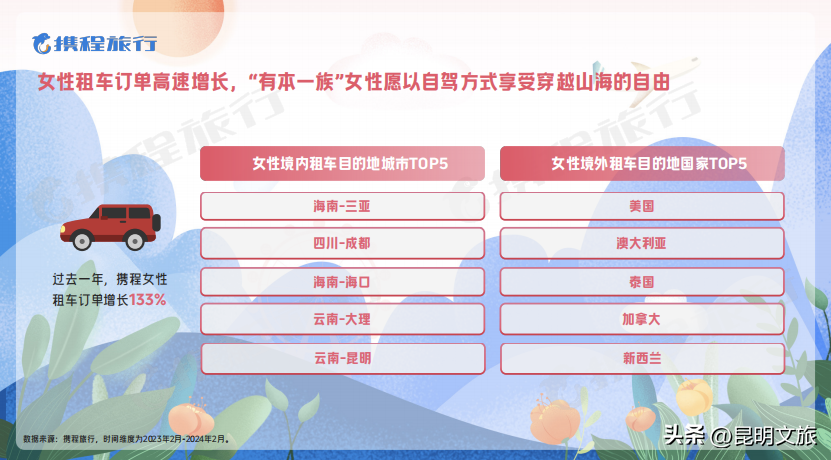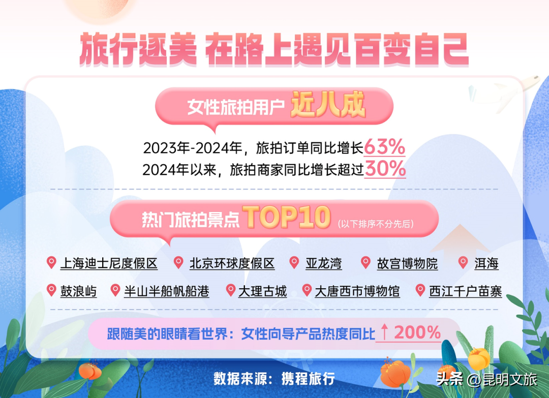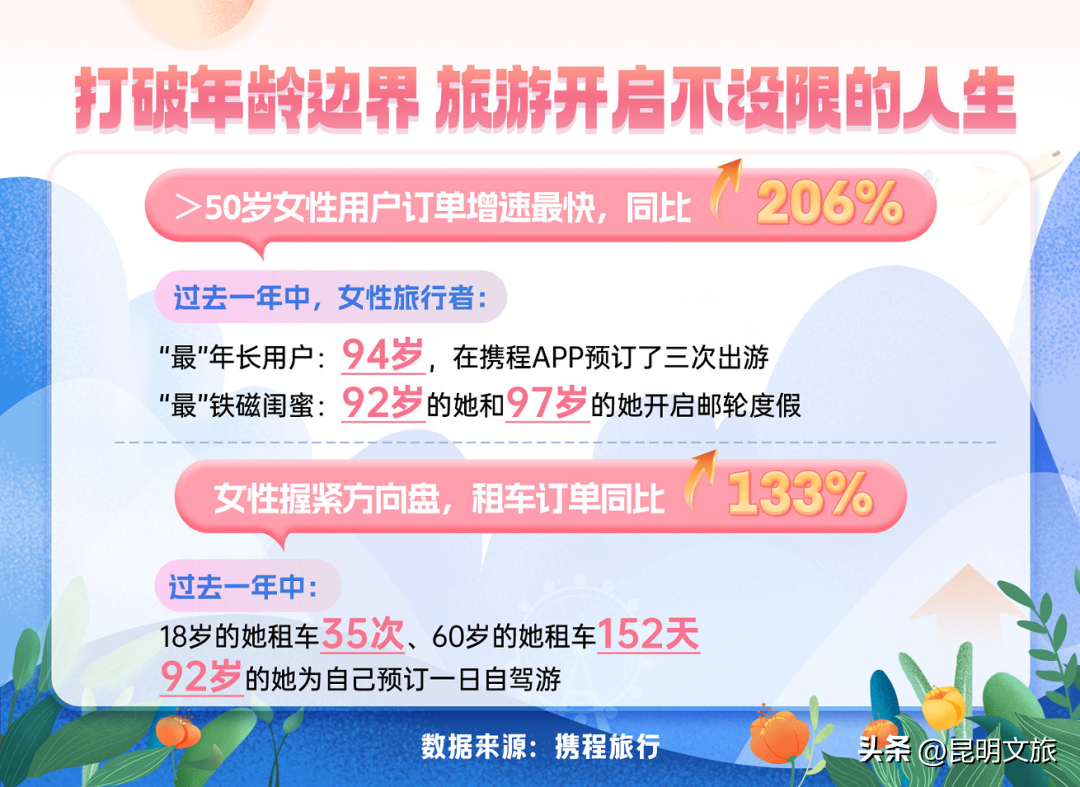 三八节前夕,携程发布《2024女性旅行消费洞察报告》(以下简称报告)。报告显示,女性人均旅行消费高出男性8%,中年女性是旅行消费的主力,有钱也有时间的“银发奶奶”们比年轻人玩得还要野。 “她消费”70后80后女性旅客占比62% 西双版纳、丽江位居女性境内目的地城市Top10 报告显示,2023年2月20日—2024年2月20日,女性全年人均旅行消费支出高于男性近8%,“她消费”力量势不可挡,数千万女性在旅行中实现“向往的生活”。其中,以70后、80后为代表的中年女性占比62.2%,成为旅行消费人群的“绝对主力”,消费力遥遥领先;90后、00后为代表的青年女性占比28.5%,消费潜力初现;50后、60后银发族群体占比9.3%,消费“品质化”升级,旅行消费金额领跑,不输年轻人。 既追求古城的安宁,也享受阳光和海滩,很多年轻女性更青睐于“去有风的地方”治愈心灵。携程数据显示,女性境内度假目的地城市Top10为北京、三亚、西安、上海、南京,西双版纳、重庆、成都、丽江、厦门,云南有两个城市入选。其中,20-35岁的年轻人最爱选择自然氛围浓郁的地方作为“逃离现实”的居所,丽江为该年龄段粘附性最喜欢的度假游目的地城市。 2023年以来,老年女性群体的旅行消费正悄然释放,50岁以上老年女性出行订单增速最快高达205.6%,她们或自驾、或邮轮、或旅居,出游方式丰富多彩。来自天津的60后李木子认为:“像我们人老心不老,旅行给了我们一个移动的、巨大的世界,让我们始终多巴胺爆棚,体会着年轻时才有的快乐。” 穿越热带雨林、体验登山和滑雪、自驾走遍全国几十个城市,越来越多的老年人更愿意融入目的地生活,了解当地历史人文,很多低龄老人也愿意参与目的地的徒步、骑行、露营等轻体育项目,越玩越野。部分银发奶奶们,还常年旅居,体验“生活在别处”。近一年携程App女性预订用户中,甚至有92岁银发奶奶下单了邮轮套餐,和97岁的高龄老闺蜜一起奔赴海上假期。 偏爱错峰游、玩法更丰富,“银发族”以出游频率高、旅行品质高、消费金额高撬动着旅游大市场。据中国旅游研究院预测,截至“十四五”末2025年,我国出游率较高、旅游消费较多的低龄健康老人将超过1亿人,老年旅游收入有望超过万亿元。有钱有闲且规模持续扩大的银发人群,为旅游市场注入新活力,也成为旅游业兵家“必争之地”。 2023年以来女性租车订单同比增长133% 年龄最小的18岁,最大的92岁 报告显示,女性喜欢“握紧方向盘,徜徉在路上”,“有本一族”的女性更愿以自驾方式享受穿越山海的自由。2023年以来女性租车订单同比增长133%;年龄最小的18岁,最大的92岁。其中,云南是深受女性游客租车目的地的省份,在女性境内租车目的地城市Top5中,云南的昆明、大理两个城市入选。 报告显示,35岁以上女性在旅行产品预订方面更具决策力量,家庭游七成为女性带队,近八成女性会为同行人预订产品。在度假团队游中,女性带父母旅行的占比高达67.6%,远远高于男性的32.4%,带娃和父母出行也是很多中年女性的人生成就感和满足感的体现。 在旅游目的地拍一套当地服饰写真,是不少女生热衷的体验。2023年2月-2024年2月,同比前一年旅拍订单增幅63%,目前海内外旅拍产品和商家数较23年同期增加30%+,丰富的旅拍产品满足用户的个性化需求。大江是一名旅拍师,2023年他全年都在各热门城市与景点奔波,如丽江、泉州、哈尔滨等,总共拍摄了上千名女孩。“这个数量比2022年上涨了近一倍。相对过去只是单纯拍照打卡‘我来过’,现在女生更追求氛围感和融入当地人文环境,更偏向沉浸式旅行。”