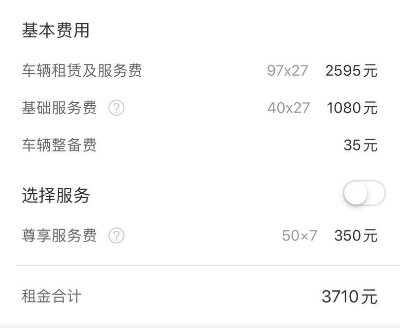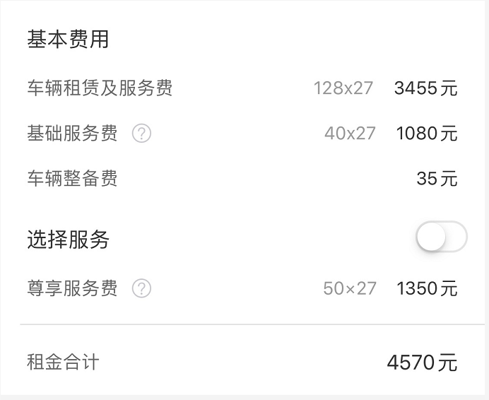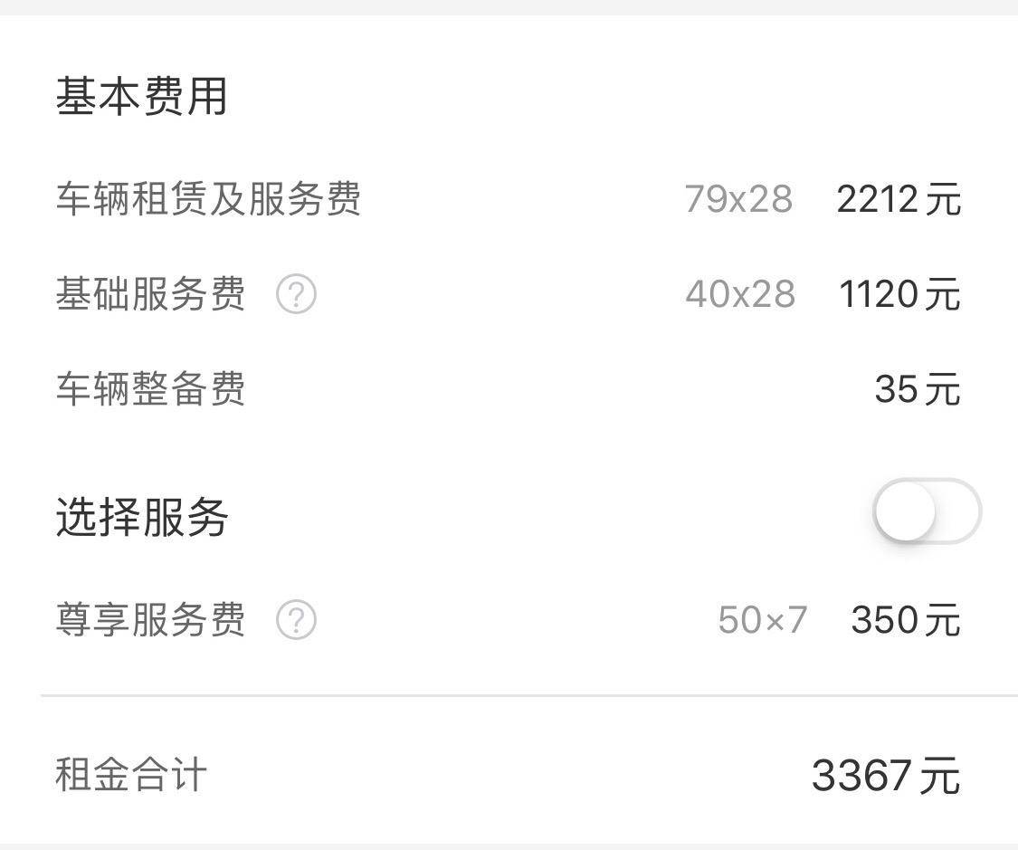 租期在7-27日的车辆可以选择周租套餐,周租费用会低于日租费用,同样以老款科鲁兹为例,周租价格为97元/日,基础服务费同样是40元/日不变,不算保险费用和车辆整备费用的话27天的租金是3675元,较日租价格低了860元。