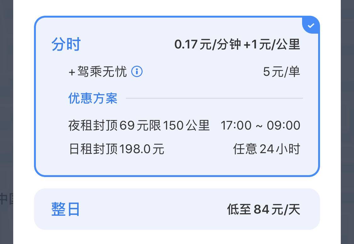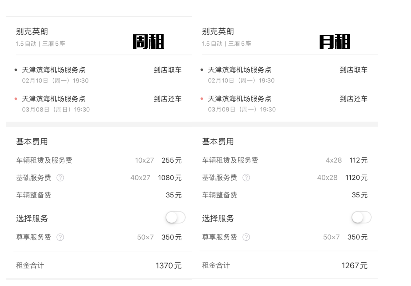 通过查询天津市各车型的价格发现,与科鲁兹同级别的别克英朗周租价格为10元/日、月租价格为4元/日,28日的租期只需要112元的租金与1120元的服务费,比同为28日租期的北京科鲁兹便宜了2100元。