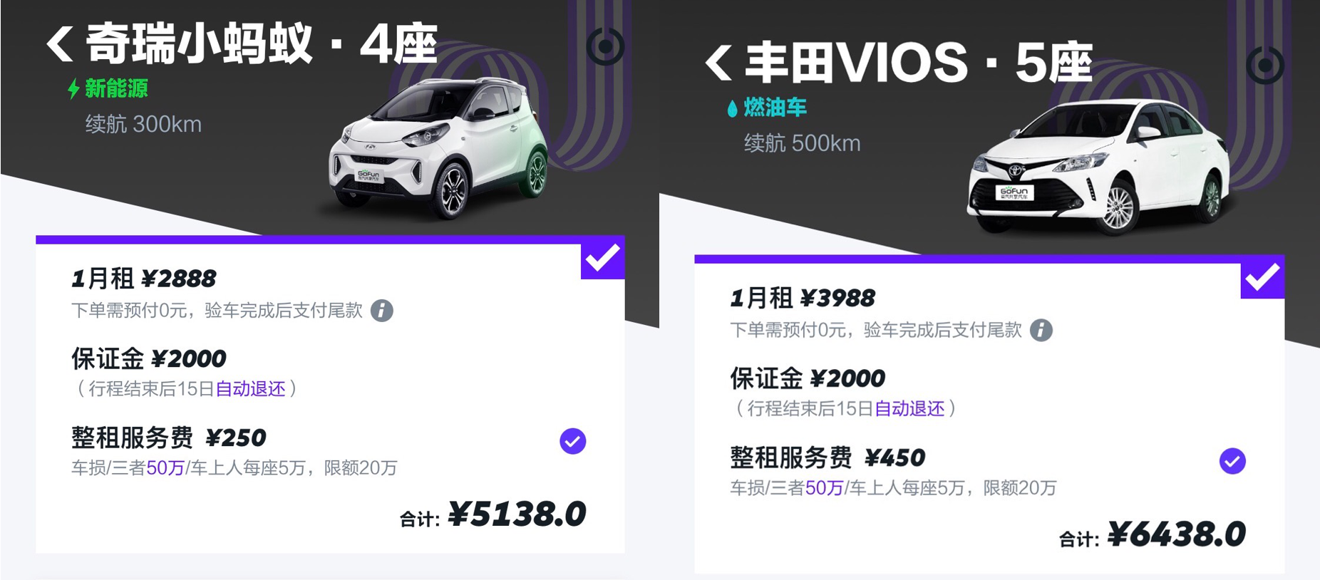 GoFun可选择的车型较多,有纯电动车与燃油车可租。以纯电车型奇瑞小蚂蚁为例,月租金为2888元/月,月服务费为250元/月,租车成本与神州大致持平;同样GoFun提供燃油车的租赁,基础款丰田VIOS的月租金为3988元/月,服务费为450元/月,租车成本明显高于神州租车。