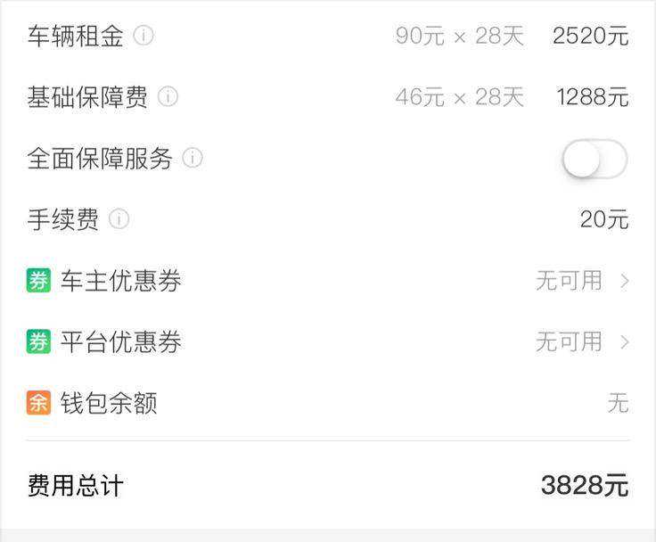 与神州租车不同的是,凹凸租车是一款P2P出行服务软件,将本地车主家中闲置车辆汇集在平台上对外租赁,车源也大多是个人名下的私家车,车况较好,车型也多。同样是28日的租期,在凹凸平台上最便宜的车型为老款日产骐达,其租金为90元/日,平台服务费46元/日,不算保险费用和车辆整备费用的话我租一个月的骐达需要3808元,与北京地区的神州租车价格相差不大。