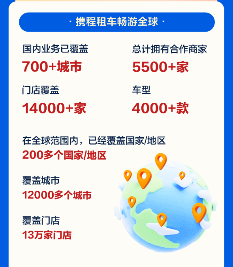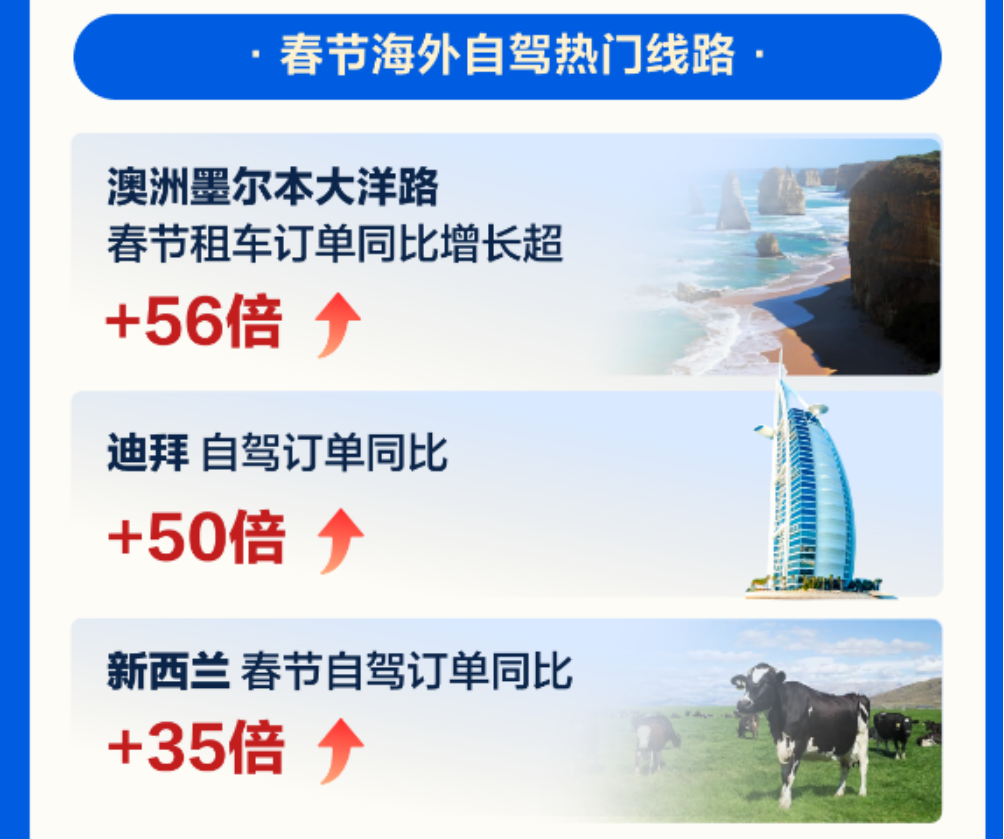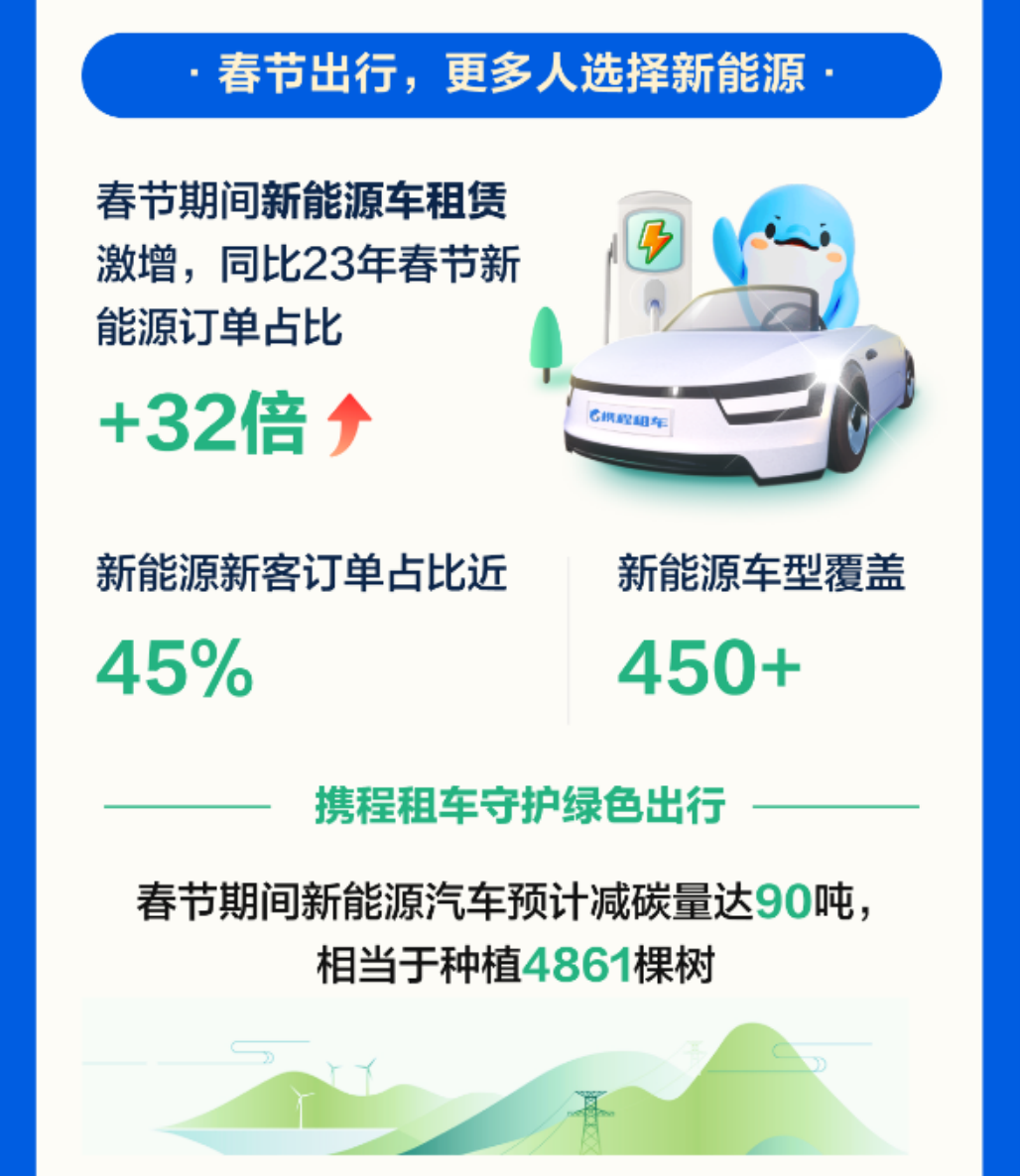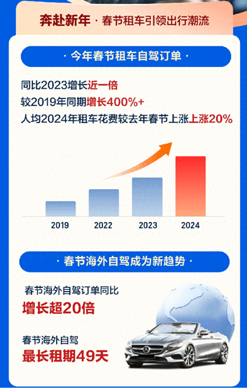 速途网2月17日消息(报道:李楠)据交通运输部数据显示,预测2024年春运,40天内大概有90亿人次出游、探亲、休闲等,可能创历史新高。春运发生了结构性变化,传统营业性运输,包括铁路、公路、民航、水运客运出行人次预计大概是18亿人次,其余80%都将是自驾车出行,自驾车出行将创历史新高。 今年春节你自驾在路上吗?对于跨省跨市出行人群,租车自驾也是比较省时省力的出行选项,凭借灵活自由、独立私密等优势,今年春节假期租车自驾游格外火爆。携程租车发布《2024年春节租车自驾游报告》显示,龙年春节国内租车自驾订单量同比去年增长近一倍,较2019年春节增长超400%。从花费来看,今年春节人均租车花费同比去年上涨20%。国内租车自驾的最长租期为39天,自驾里程约有一万多公里;海外自驾游同样火爆,携程平台上海外租车订单量同比增长超20倍,最长自驾租期长达49天。 随着出行交通组合更加灵活便捷,更多用户选择租车自驾作为目的地的游览出行方式。报告显示,携程平台上异地租车订单占比高达93%,机票+租车的组合预订占整体租车订单的40%。 为应对假期资源不足的问题,携程租车节前加紧储备库存,根据不同区域的租车预订情况调整车辆库存。凭借聚合型平台的优势,携程租车整合了全球租车供应链的资源为用户提供租车便利。目前国内业务已覆盖700+城市,总计拥有合作商家5500+家、门店覆盖14000+家,超过4000+款车型。在全球范围内,已经覆盖200多个国家/地区、12000多个城市,覆盖13万家门店。 从自驾人群来看,80、90后依旧是春节自驾游的主力群体,其中,80后占比49%,90后达到了30%。00后的增势最为迅猛,今年春节00后自驾用户的增幅高于其他人年龄群体80%。休闲旅游和家庭出行也成为80后和90后自驾出行的主要需求,“开车带家人一起旅行过年”趋势明显。其中海口、上海和昆明成为亲子自驾游的热门目的地。 从租车习惯来看,今年春节自驾用户平均提前7天预订车辆;选择1-3天周边中短途自驾的订单占比52%,4-7天长途自驾的订单占比41%;此外从消费来看,春节国内自驾客单价为3020元,同比去年提升20%。 春节热门自驾线路有:海南环岛线、滇西大环线、川西大环线、新疆大环线和西北大环线。春节租车火爆目的地有:海口、三亚、昆明、成都、广州、大理、上海、南宁、深圳及西双版纳;西安、贵阳、杭州、揭阳、潮州、桂林、福州、武汉、南京、长春新晋为十大国内春节自驾游的黑马目的地。 报告显示,2024年春节租车用户中新客占比近45%,其中很大比例是第一次自驾游的用户。携程致力于为用户提供高品质的租车服务体验,覆盖超4000款车型车辆,一年内车龄占比50%以上。一年内车龄的新车广受自驾用户的青睐,新客订单中近40%的用户选择租用一年内新车。 低碳环保的绿色出行成为自驾领域的重要发展趋势。据最新数据统计,携程租车平台新能源车型已覆盖超450种品类,春节期间新能源车租赁激增,同比2023年春节新能源订单占比增长超32倍,新能源新客订单占比近45%。春节期间新能源汽车减碳量达到90吨,相当于种植4861棵树。 今年春节在出境游大军中,自驾游的比重也非常高。报告显示,携程平台的海外租车订单量同比增长超20倍。携程租车已在全球200多国家或地区覆盖租车服务,支持12种语言,包括36个站点。“未来中国的租车市场有望在服务水平上领先世界,并通过出境租车领域向世界输出中国的服务。”携程租车CEO宋臻表示。 今年春节期间,基督城、墨尔本、迪拜、吉隆坡、洛杉矶、普吉岛、悉尼、曼谷、奥克兰、阿布扎比成海外自驾十大热门目的地;其中澳大利亚墨尔本春节租车订单同比增长超56倍、迪拜自驾订单同比增长近50倍、新西兰春节自驾订单同比增长35倍以上。 携程租车在海外多国实现租车免押金,覆盖国家如泰国、马来西亚、菲律宾、美国、加拿大、阿联酋等多国;其中,泰国已开通免押的服务商中,选择免押的订单更是占比近70%以上。 为助力用户轻松开启海外自驾,携程租车还推出免费申领驾照国际翻译认证件,畅行全球近200国家。据携程数据显示,近90%的出境自驾用户已选择领用。携程租车共推出128篇官方自驾路书,覆盖“此生必驾”“当季推荐”“文旅合作”等经典自驾路线,为用户出行提供更准确更便捷的自驾指南。 “未来租车市场竞争将集中在服务质量和用户体验上,各家都在深化自己的专长领域,价格竞争将不是主要方向。携程租车还是以优质服务为发力点,致力于让全球用户体验到便捷、无忧的高质量租车体验”宋臻表示。 报告显示,2024年春节“无忧租”订单占比近7成。此外为帮助用户更直观选择车型,携程租车业内首创VR看车,开启360度全景看车新时代。覆盖1500+车型,覆盖超130000辆车。 过去一年携程租车在全国核心枢纽建立租车中心,打造一站式车辆取还服务,覆盖全国热门城市交通枢纽。春节期间分别在三亚、西双版纳、南宁、乌鲁木齐新开五个租车中心。 同时,携程租车在《经济观察报》主办的以人为本,洞见未来—2023美好生活高峰论坛上斩获2023美好生活·年度品牌领先企业荣誉。近期,“三亚发布”公众号公布携程租车为“2023年度红榜平台”,积极配合推行备案政策、投诉率低、发现问题及时整改、出现纠纷快速化解,为用户提供良好的行业市场环境。