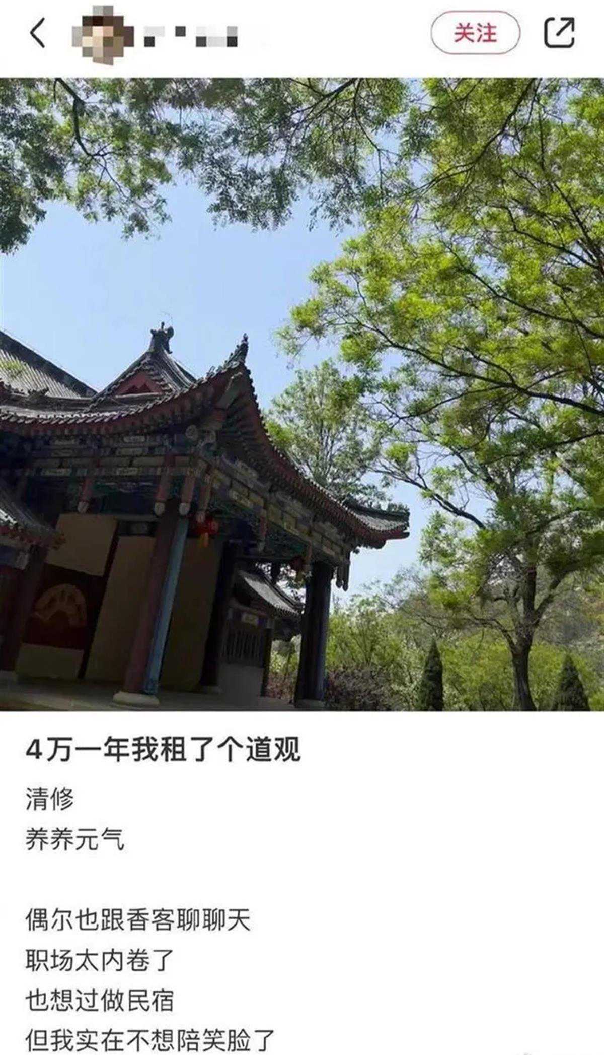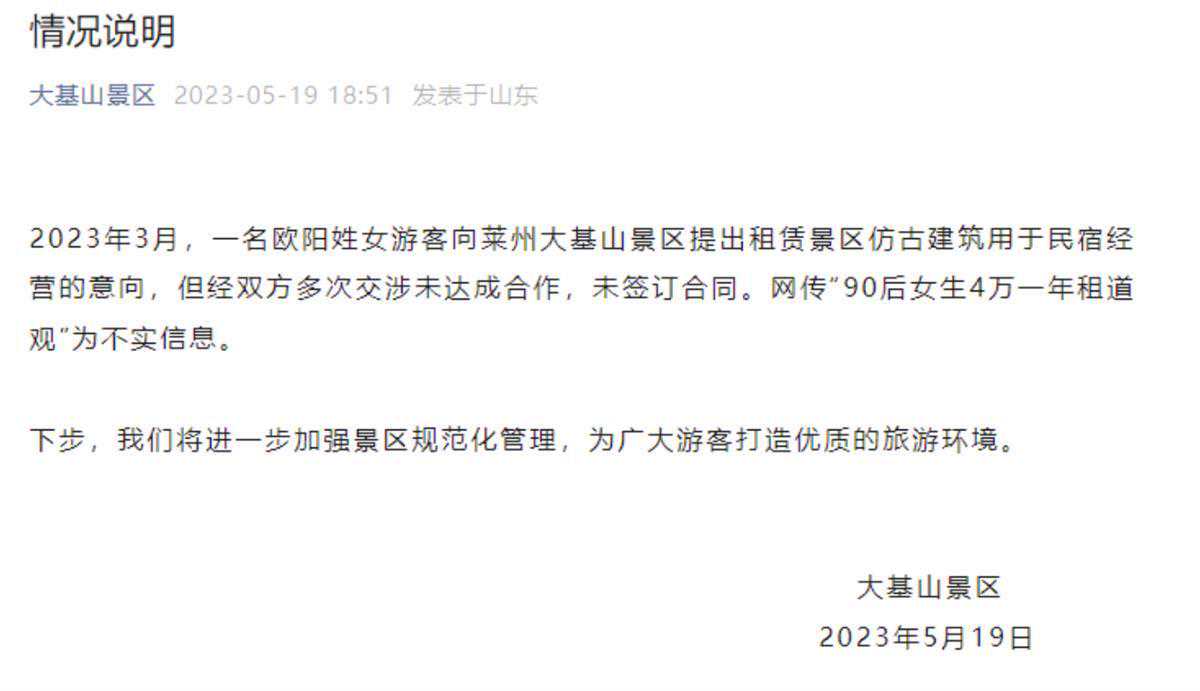 近日,一网友称自己花4万元一年租了个道观清修,养养元气。5月19日,山东莱州的大基山景区发布通报称,系不实信息,双方未达成合作。 据北晚在线报道,5月18日,博主欧阳表示,自己原先在南方做旅游民宿和酒店板块的工作,近几年行业发展不是很好,整个业务量减少,工作压力也很大。之所以选择山东莱州大基山,是因为一位从事文化产业的朋友的推荐,“朋友说它们那些道观好像蛮多还是空着的,我就想是不是可以去住住,给点钱之类的。” 该网友在社交平台所发网帖截图 欧阳称,和景区沟通后觉得4万一年的租金比较合适,就在半山腰的一间一两百平方米的“道观”住了下来,现在的生活很轻松。 5月19日,大基山景区发布通报称,2023年3月,一名欧阳姓女游客向莱州大基山景区提出租赁景区仿古建筑用于民宿经营的意向,但经双方多次交涉未达成合作,未签订合同。网络上所传“90后女生4万一年租道观”为不实信息。 下一步,我们将进一步加强景区规范化管理,为广大游客打造优质的旅游环境。 (极目新闻综合北京晚报报道) 更多精彩资讯请在应用市场下载“极目新闻”客户端,未经授权请勿转载,欢迎提供新闻线索,一经采纳即付报酬。24料热线。