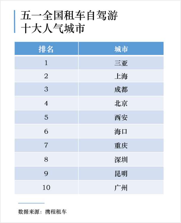根据订单和取车数据,五一全国租车自驾游十大人气城市分别为三亚、上海、成都、北京、西安、海口、重庆、深圳、昆明、广州。海南、江浙沪、四川、北京、陕西、重庆、广东、云南成为最热门的区域,海滨度假胜地三亚人气排名第一。