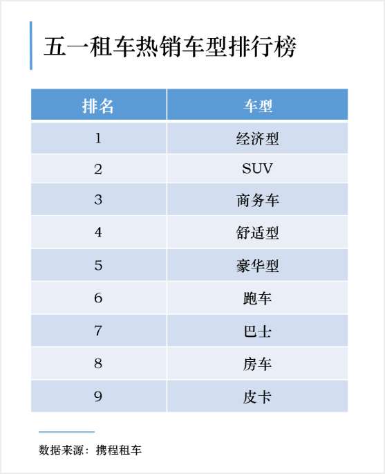 从消费者喜爱的车型看,大家的选择越来越广。从订单量看,五一租车热销车型排行榜前九名依次是:经济型、SUV、商务车、舒适型、豪华型、跑车、巴士、房车、皮卡。