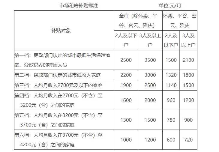 在北京租房 别忘了领这些补贴 每月3500元租房补贴 每月20日前发放至 申请人银行账户 补贴金额比例达95% 补贴建筑面积 上限为60平方米 要点1 目前北京住房保障方式包括公共租赁住房、市场租房补贴、保障性租赁住房等多种方式。 对于超出公共租赁住房收入标准的无房家庭,可以通过申请承租保障性租赁住房,也可以通过申请市场租房补贴解决住房困难问题。 要点2 公租房定位于解决中低收入住房困难家庭住房问题,重点面向低保、低收入、大病、重残等特殊困难家庭以及人口较多的家庭配租; 对于收入超过公租房准入标准的中低收入无房家庭,可以通过申请市场租房补贴解决住房困难; 对于新市民、青年人等群体,可以通过租赁保障性租赁住房满足住房需求。 要点3 以三口之家为例,如家庭年可支配收入低于10万元,可通过申请配租公租房解决住房困难问题; 如家庭年可支配收入高于10万元但低于15.12万元,可通过领取市场租房补贴,租住市场房屋解决住房困难问题; 如家庭年可支配收入上述标准均不符合,也可通过租赁保障性租赁住房满足住房需求。 一 每月3500元租房补贴 每月20日前 发放至申请人银行账户 1 市场租房补贴申请条件 本市城镇户籍家庭同时具备以下条件的,可以以家庭为单位申请市场租房补贴: (1)申请当月前12个月家庭人均月收入不高于4200元; (2)申请家庭成员在本市均无住房且在本市生活; (3)3人及以下家庭总资产净值57万元及以下,4人及以上家庭总资产净值76万元及以下。 2 市场租房补贴标准 (1)市场租房补贴标准考虑本市经济社会发展水平、财政承受能力、房屋市场租金水平等因素,根据保障家庭人口结构、收入水平分档确定。 (2)取得市场租房补贴资格的家庭应在本市行政区域内租赁住房,签订房屋租赁合同。房屋月租金超过核定的租房补贴标准的,按租房补贴标准确定租房补贴,超出部分由其自行承担;低于租房补贴标准的,按租赁住房租金金额确定租房补贴。 (3)加大重度残疾等3类家庭市场租房补贴力度。符合下列条件之一且市场租房补贴标准低于第一档的家庭,可以向街道办事处(乡镇人民政府)住房保障管理部门申请提高市场租房补贴: 家庭成员中有重度残疾人员; 家庭成员中有患重大疾病人员; 家庭成员均为60周岁以上老人且无子女。 经街道办事处(乡镇人民政府)住房保障管理部门初审、区住房保障管理部门复审,符合提高补贴申请条件的,提高一档市场租房补贴标准。 (4)鼓励核心区家庭承租中心城区以外房源。东城区和西城区家庭租赁城六区以外的房源,且房屋租赁合同依本市规定办理租赁备案登记的,经申请家庭所在区住房保障管理部门认定后,可提高两档市场租房补贴标准,提高后的租房补贴标准不超过第一档补贴标准。家庭租赁房源变动的,补贴标准须按本通知规定重新核定。 3 符合条件的家庭可按以下程序申请办理市场租房补贴手续 (1)申请市场租房补贴资格 符合申请条件的家庭,可向户籍所在地街道办事处(乡镇人民政府)住房保障管理部门提出申请。申请通过之后,可通过市住建委官方网站中的“住房保障”—“查询服务”—“资格备案结果查询”模块进行查询。 (2)及时承租合法房屋 取得市场租房补贴资格的家庭应在6个月内自行到市场租赁住房。租赁的住房须符合有关法律法规要求,具备相关材料,承租的房源应在北京行政区域内,但不能承租经济适用住房等禁止出租的住房,也不能承租公租房。 (3)办理补贴领取手续 (4)发放补贴 市场租房补贴家庭当月办理市场租房补贴领取手续的,从次月开始计发补贴。每月20日前,市场租房补贴将发放至申请人银行账户。 二 公租房租金补贴= 公租房租金标准×补贴比例×补贴面积 1 哪些家庭具备什么条件可申请市场租房补贴? 承租公租房的本市城镇户籍家庭同时具备以下四项条件的,可以申请公租房租金补贴: (1)申请当月前12个月家庭人均月收入不高于2400元; (2)除承租的公租房外,无其他住房; (3)3人及以下家庭总资产净值57万元及以下;4人及以上家庭总资产净值76万元及以下; (4)所承租的公租房是通过市、区住房保障管理部门公开配租方式获得。 2 公共租赁住房租金补贴的标准是多少? (1)公租房租金补贴计算公式 公租房租金补贴=公租房租金标准×补贴比例×补贴面积 (2)补贴面积 公租房租金补贴建筑面积上限为60平方米。承租家庭所租房屋建筑面积超过补贴面积上限的,按上限取值;低于上限的,按实际承租建筑面积取值。 (3)分档补贴比例 除怀柔区、平谷区、密云区、延庆四区外,其他各区实行统一的分档补贴比例: 民政部门认定的城市最低生活保障家庭、分散供养的特困人员承租公租房的95%。 民政部门认定的城市低收入家庭承租公租房的90%。 人均月收入1200元及以下的家庭承租公租房的70%。 人均月收入1200元(不含)至1600元(含)之间的家庭承租公租房的50%。 人均月收入在1600元(不含)至2000元(含)之间的家庭承租公租房的25%。 人均月收入在2000元(不含)至2400元(含)之间的家庭承租公租房的10%。 (4)怀柔、平谷、密云、延庆4个区补贴比例 民政部门认定的城市最低生活保障家庭、分散供养的特困人员承租公租房的95%。 民政部门认定的城市低收入家庭承租公租房的90%。 其他补贴比例对应的家庭收入分档线由各区人民政府自行确定,报市住房保障管理部门、市财