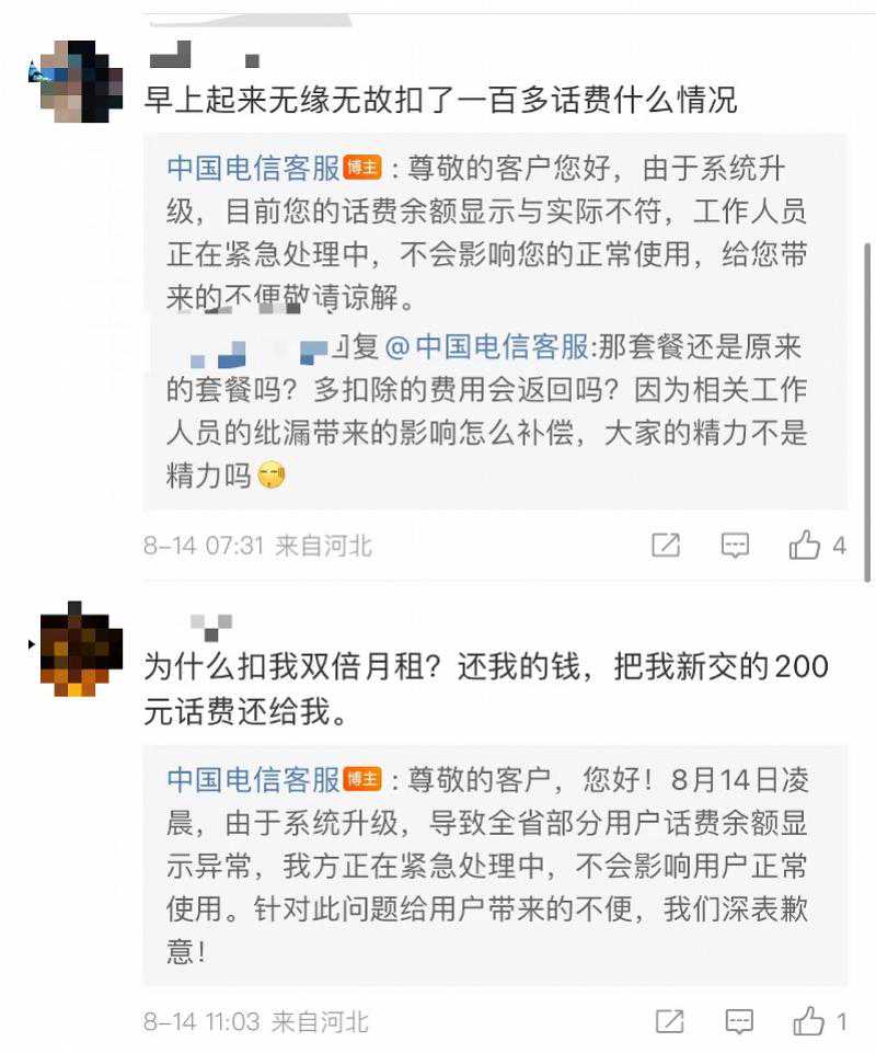 8月14日,部分河北电信用户反映凌晨突然被扣费,扣费金额基本为当月套餐的双倍费用。当日下午,河北电信官方客服回应南都记者称,错误扣费是由系统升级导致,目前正在紧急处理中,待系统恢复正常后即可处理退费事宜,但具体恢复时间无法保证。 多名电信用户反映突然被扣费。 对此,14日上午,中国电信客服回复称,“由于系统升级,话费余额显示与实际不符,工作人员正在紧急处理中,不会影响正常使用。” 14日下午,河北电信官方客服向南都记者表示,错误扣费是系统升级导致的,工作人员已经在加急处理。“对于已经停机的用户,我们可以开展紧急开机服务,保证48小时内正常使用。如果48小时之后仍是停机状态,可再次申请。”针对网友关心的退费问题,该名客服表示,“待系统恢复正常后即可处理退费事宜,但具体恢复时间无法保证。” 采写:实习生陈梓滨南都记者韦娟明