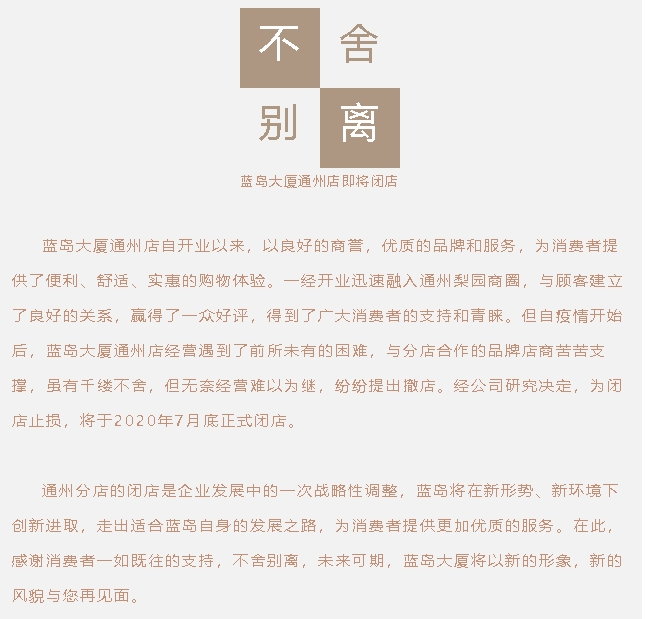 你知道吗?蓝岛大厦旧址地下一层新开了一家超市。那么关门三年多的蓝岛大厦怎么样了?今日(1月16日),北青社区报()记者从云景豪庭租赁部了解到:目前,蓝岛大厦旧址仍在以商业形式整体对外出租,争取在未来一年努力将蓝岛大厦租出去。 蓝岛大厦旧址地下一层:新开一家环球超市 蓝岛大厦旁的一个出入口,可以通往大楼的地下一层,门口的牌子上写有“多人行环球货仓”。上午10点,记者看到超市门口停了十余辆电动车及自行车,陆续有市民出入该超市。 旁边小区的一位居民告诉记者这个位置几经易主,“这里之前是一家健身场馆,可以游泳、骑车,再早一点,也开过超市。” 搭乘电梯来到超市,不少货物成箱堆放着,价格分为会员价和非会员价,近百位市民穿梭在货架之间,挑选心仪的商品。该店1月9日开业,目前看来,商品种类丰富,方便了周边市民买菜购物。 “价格还行。”有两位结伴而来的市民满载而归,对超市的价格也颇为满意。 在通州经营9年,老牌商场蓝岛大厦突闭店 与人来人往的超市相比,旁边的蓝岛大厦过于死寂。蓝岛大厦通州店位于通州新区核心地带的通州梨园镇云景东路。 自2011年成立至2020年关张,蓝岛大厦陪伴着通州和通州人走过了9个春秋。2020年7月,蓝岛大厦通州店发布闭店消息,“自疫情开始后,蓝岛大厦通州店经营遇到了前所未有的困难,与分店合作的品牌店商苦苦支撑,虽有千缕不舍,但无奈经营难以为继,纷纷提出撤店。经公司研究决定,为闭店止损,将于2020年7月底正式闭店。” 将时间拨回2020年7月,在蓝岛大厦正式闭店最后一周,为了把损失降到最低、同时也想“好好”和“老朋友”们告别的大厦商户纷纷采取降价、打折、第二件半价等方式展开促销“告别会”。 虽然即将“落幕”,但无论是按规定引导顾客扫码测温的安保人员,还是用最真诚的笑容和服务迎接顾客的导购,亦或是耐心解答顾客的疑问、细心办理客户的售后服务人员——蓝岛大厦的全体工作人员都坚持各司其职,竭力站好最后一班岗位。 彼时,蓝岛大厦的店铺都在筹备撤店,部分店铺已经撤走,或另行选址,或与其他门店合并,而蓝岛本店的工作人员则根据公司安排调岗。 “哎哟,我可是这儿的老客户啦,你就便宜点卖给我嘛!”在一家个体摊位前,一位精神矍铄的老奶奶一边与导购进行“价格拉锯战”,一边拿着自己“心仪”的帽子里外翻看,甚至走到镜子前试戴起来…… 这九年,它见证着通州人民的购买力、贡献过通州地区的GDP、还旁观过无数个通州人的喜怒与哀乐、青春与回忆……杨绛先生说:“世间好物不坚牢,白云易散琉璃碎。”离别之际,很多通州人都格外舍不得这位“老友”。 闭店三年将迎转机?租赁部人员称今年努力租出去 这一闭店,就是三年多。如今,“蓝岛大厦”的招牌早已拆除,旧址旁边的美仑国际酒店将招牌挂在了这里。蓝岛大厦闭店后,本报记者曾联系过通州区商务局相关负责人,商务局工作人员表示,蓝岛大厦未来或将改为商务写字楼。 然而,招商并不容易。如今,蓝岛大厦大门依旧紧闭着,侧门上方挂着的“写字楼隆重招商”广告牌已经老旧,玻璃上还贴着周边在营业商铺打印出来的招商出售电话。记者看到另一侧门玻璃房内停放着三轮车、自行车,已然成了停车棚。 关闭多年,玻璃上也积满了灰尘,透过玻璃向内看,曾经的商场空荡荡的,只剩下钢筋水泥的墙壁和地面。 与蓝岛大厦紧挨着的是云景豪庭小区,在蓝岛大厦旧址东侧就是美仑国际酒店,继续往东,还有一些门店底商,包含幼儿园、培训机构、健身馆、儿童门诊等。 记者以租户身份拨通了蓝岛大厦楼外的招商电话,工作人员表示,与附近几条街相比,云景东路比较繁华,人流量比较多,“咱们这边商铺属于半封闭式,在小区内部,但是人员进出没有问题,房屋入住率很高,人流量在中上等。” 记者也咨询了蓝岛大厦旧址的未来规划,对方表示:“目前,还是以商业形式整体出租。此前疫情影响太大,这几年经济慢慢回升,规划未来一年左右将它租出去。” 北青社区报副中心版组 文/韩凤兰 图/韩凤兰 部分内容综合自本报此前报道 责编/张欣