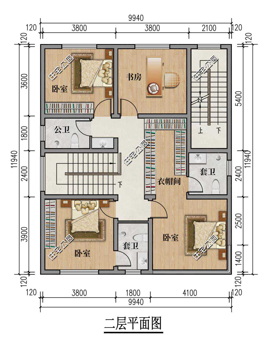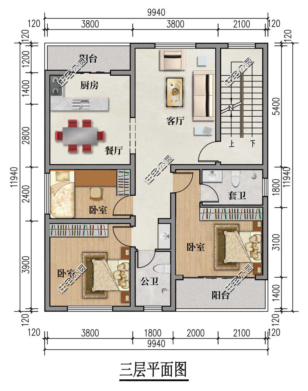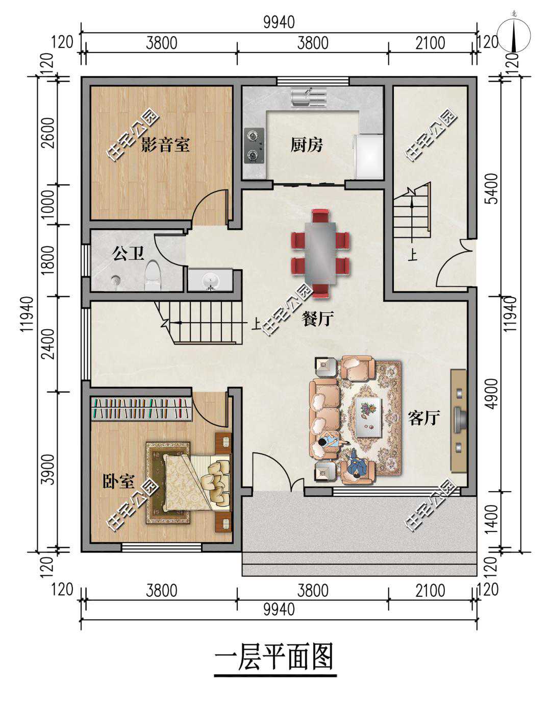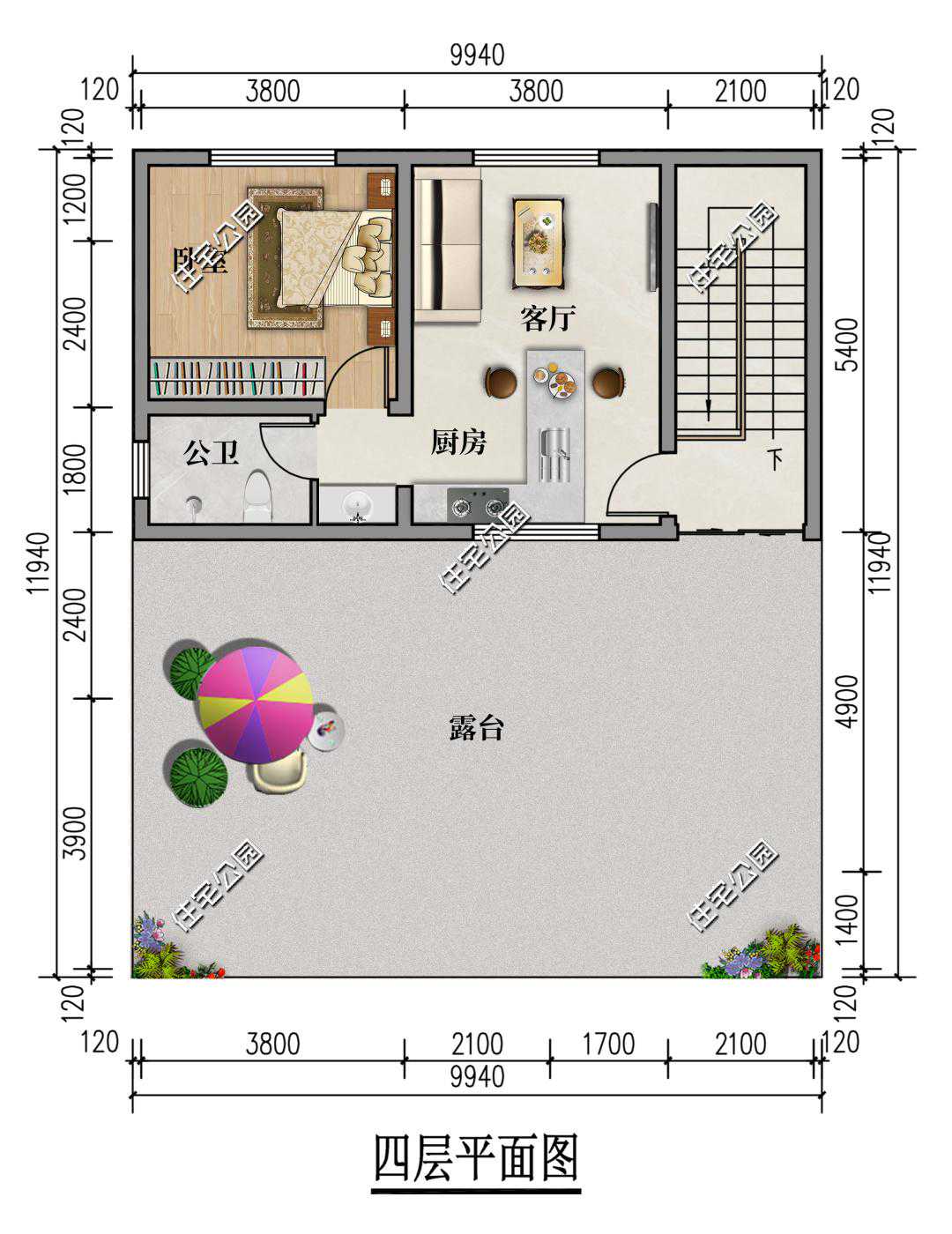 广东的王先生去年过年回家,看到邻居都建了新房,而且还把闲置的房间出租,生意做得如火如荼。王先生看着羡慕极了,于是打算今年回家也建一栋,既能自住又能出租的别墅。 在了解到王先生的需求过后,我们为他定制设计了这套四层现代别墅ZJ-2153+。 它有室外、室内两部楼梯,且一二层自住区与三四层出租区单独入户、互不打扰。三四层室内的厨房、餐厅、客厅均配备齐全,即便是出租使用,居住舒适度也不差。 其他方位图: 户型基本信息 占地尺寸:10m×12m 占地面积:111㎡ 建筑面积:399㎡ 建筑高度:13.65m 建筑结构:框架结构 建筑情况:设8卧室3客厅3餐厅3厨房7卫1影音室 详细示意图: 平面布局图: 一层 一层、二层主要作为自己的居住区,动静分区,居住舒适度更高。 入户即是面宽近6米的大客厅,客厅区域面积宽敞、采光通风性更好,看着也更大气。 二层 二层东南侧设有豪华套卧,业主的居住舒适度更佳。 东北侧的书房更显安静,大人在此办公,小朋友在这里上网课、学习都很方便。 三层 三四层为出租,每层单独入户,带有独立厨房、客厅。 南侧设有3间卧室,与北侧的客厅、厨房区域分隔开,家人也不必担心会被打扰。 四层 四层也是单独入户,室内面积虽较小,但该有的全都有。 南侧大露台,进一步拓展了使用空间,租客可以在露台上尽情地休闲娱乐。