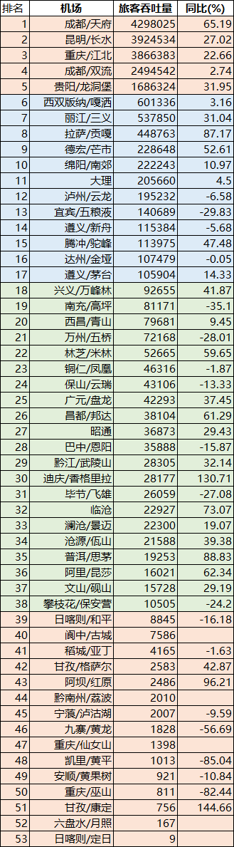 最近,民航局西南局公布了2024年1月西南地区53座机场的生产数据。 旅客吞吐量方面,大幅增长。 超过百万人次的有5座机场 成都天府第一,430万人次 昆明长水第二,392万人次 重庆江北第三,387万人次 成都双流第四,249万人次 贵阳龙洞堡第五,169万人次 我们发现,成都天府机场依然牢牢占据西南头名位置。 昆明长水则反超重庆江北机场位居第二。 由此看来,2024年,昆明长水机场与重庆江北机场之间将有一番争夺。 10万-60万人次的有12座机场。 西双版纳嘎洒、丽江三义是仅有的在50万以上的。 1万-10万的有21座机场 1万人次以下的15座机场。 2024年1月份西南地区机场旅客吞吐量排行榜(人次) 货邮吞吐量方面,也是大幅增长。 超过2万吨货邮的有四座机场 成都双流第一,4.9万吨 重庆江北第二,3.9万吨 昆明长水第三,3.2万吨 成都天府第四,2.8万吨 相对于旅客人次而言,货邮运输与经济发展息息相关。 四座机场的位次更能说明各大机场与地方经济发展的关联度。 1千吨-1万吨的有5座机场。 100吨-500吨的有22座机场 其他机场都在100吨以下,部分机场没有货邮进出。 2024年1月份西南地区机场货邮吞吐量排行榜(吨)