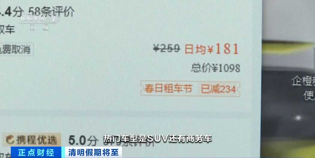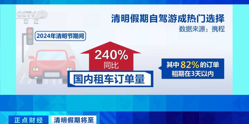 (央视财经《正点财经》)旅游平台的数据显示,清明期间,国内租车自驾订单量同比增长超过两倍。 在北京丰台区的一家租车店,消费者杜先生正在对租来的车辆进行最后的交接工作。他告诉记者,清明小长假,他计划提前两天出发,带家人一起自驾去山西。 记者了解到,早在3月底,这家租车店今年清明小长假的车辆出租率就已经达到了70%以上,随着假期的临近,预计100多台车将会被全部租空。 北京某租车公司负责人阚林:今年的订单量整体上浮了将近300%,热门车型是SUV和商务车,舒适型的车需求量比较大。 数据显示,2024年清明节期间,国内租车订单量同比增长240%。其中,82%的订单租期在3天以内。 某在线旅游平台公共事务部总监陈理楠:35%属于亲子订单,举家出行的情况较多。整体的订单平均价约为819元。 转载请注明央视财经
