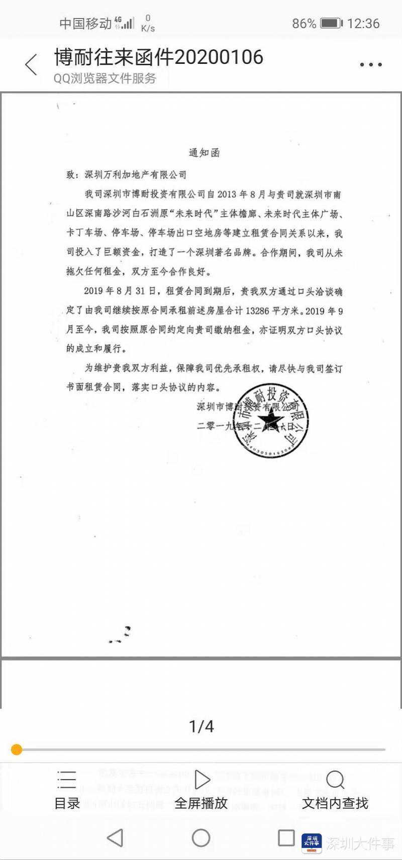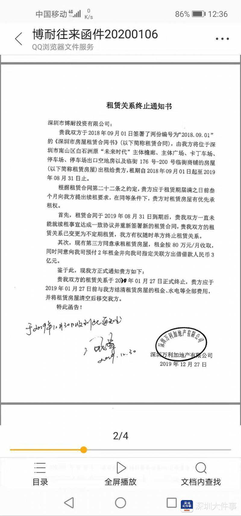 南都讯记者卢亮原本简单的租赁关系,却最终演变成对簿公堂。日前,有深圳租户反映,业主方万利加与“二房东”博耐投资之间出现了租赁争议,僵持不下,现在不知道该向谁交租。 目前,不满被终止租赁合同的博耐投资已经向深圳南山区法院提起诉讼,法院发布了“案件受理通知书”。 物业方:合同到期,博耐投资未正式续签合同 位于深圳人口密集的白石洲片区、世界之窗西侧的博耐家居广场是很多深圳人的记忆,这里曾次被评为“深港十大家居品牌”、“最具影响力商场”。 南都记者走访了解到,目前存在争议的物业,是博耐家居的“未来时代”主体檐廓、主体广场、停车场、卡丁车场、停车场出口空地房及部分临街商铺。据观察,该位置处于白石洲地铁口,人流极大,属商业旺地。 物业拥有方万利加称,深圳市博耐投资在2008年就租赁房屋签订了租赁合同关系,又在2013年至2018年续签合同,后又在2018年-2019年续签1年不定期合同。南都记者在一份“交楼确认书”上看到,其在2018年向承租方交付租赁房地产面积共计13000平方米。 博耐投资:仍在正常交租,并没有违约 作为承租方,博耐投资出具的一份公告显示,博耐投资多年来承租万利加的物业,用于经营“博耐家居欢乐购”商场、停车场,2019年8月合同到期后,双方商讨续签问题,在未正式签订书面租赁协议之前,一切按原合同履行。“我司一直正常交租,并开具发票,形成了新的不定期租赁合同关系,原租赁合同继续有效,我司仍继续享有合法出租权。”这份公告还向各租户强调,只有博耐投资才有权收取租金,而非万利加或其他机构。 博耐投资的丁经理接受南都记者采访称,目前仍在正常交租,并没有违约。租赁关系合法有效,应继续履行,万利加无权收回场地另租售他人。 一位知情人士透露,博耐投资租赁该场地后,装修投入的费用达数千万元。 因为不满终止租赁合同,博耐投资已经向深圳南山区法院提起诉讼,目前法院发布了“案件受理通知书”。 争议: 博耐是否享有“优先租赁权”? 作为业主,万利加地产的一位代表回应称,与博耐的租赁关系上,万利加与博耐的书面租赁合同在2019年08月份就到期了,博耐一直没有提出续签,万利加也一直希望终止合同。为此,万利加在2019年12月底向博耐发函终止租赁关系,并给予1个月的过渡期。 对于颇具争议的“优先租赁权”问题,万利加的负责人称,博耐不享有优先租赁权,因为根据双方的书面租赁合同约定,博耐应该在租赁合同到期前提前三个月通知才享有,但博耐一直没有主张优先租赁权。“对方可以向法院提起诉讼,但是不能因此对抗万利加的所有权。万利加作为业主,在租赁关系终止后有权收回物业。”而关于小商户维稳问题,“愿意积极配合处理,包括但不限于维持运营,给予过渡期优惠等。” 实际上,“优先租赁权”成为争执的焦点之一。 律师说法: 不定期租赁的业主可随时终止合同,承租方可主张装修等损失 有深圳法律界专家解释,优先租赁权是同等条件下的优先租赁。承租方的优先权要求确实不会影响业主和租户之间的租赁合同效力。如果属于不定期租赁,业主是可以随时终止合同。承租方如果有装修等损失,可以向业主方主张。 当事人双方方提供的部分文件。