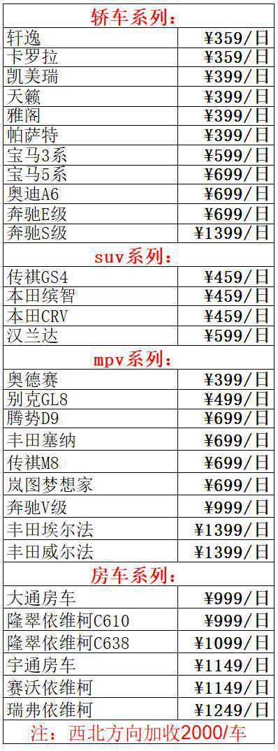 辞旧岁迎新春,在春节到来之际,为方便各界人士的出行需求,广州精通租车推出春节期间特价车型,车辆数量有限,均以定金为准,以下为价格公示: 注:以上均为月租车型价格日均价,其他未有车型以客服报价为准! 延伸阅读: 精通商务车公司主营车型:奔驰(S,E,C,级)、威霆,唯雅诺、凌特、威霆、奔驰S350等;还有各种豪华跑车出租为您量身打造全套用车方案及全方位的优质服务! 租车手续简单:在线预约,提供身份证,驾驶证,验车,交接您完毕。保险,导航,代驾租车,上门取车送车均可。本公司是一家正规工商注册企业。提供代驾租车,24小时服务,送车上门。 根据租赁时间可分为:长期租车﹑年租车﹑月租车﹑日租车,同时可以为客户量身定制租车计划租期灵活。是您在广州代驾租车放心之选,车型多样,价格实惠,服务周到,多年信誉值得信赖…【广州租车公司_广州商务租车_广州埃尔法租车-广州精通汽车租赁有限公司】