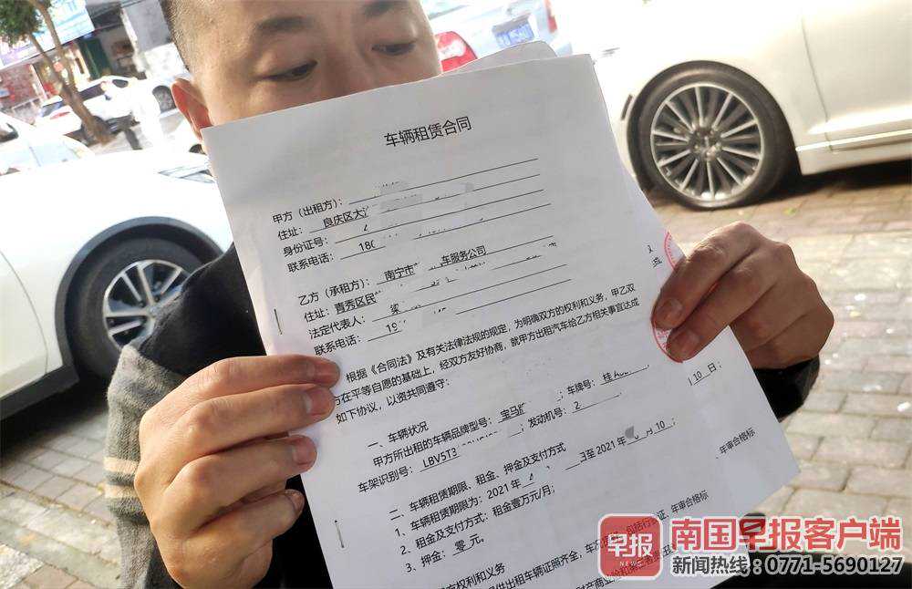 近日,市民尚先生向南国早报客户端反映,今年4月,他将宝马车租给南宁一家汽车服务公司,一个月前他得知自己的车竟被做了抵押,如今,不仅联系不上租车人,他的车也找不到了。 车主的宝马车。(车主提供图片) 11月10日,南国早报客户端记者在南宁市东风南路见到了尚先生,他在此经营一家酒屋。他说,受疫情影响,酒屋多个月生意清淡,今年4月,他经朋友介绍,了解到南宁市尊尚汽车服务公司提供汽车租赁服务,便决定将其名下的宝马5系小轿车,以每月一万元的价格租赁给该公司。 车主展示与租赁公司签的合同,如今车主盼望能寻找回自己的宝马车。南国早报记者何定坚摄 “第一份租赁合同签了2个月,6月份又续签了一份,一直出租到12月底。”尚先生称,被出租的车于2016年底购置,车况良好。与租赁公司合作的前几个月,对方能顺利给付租金,之后便出现拖延情况。 10月,他向租赁公司提出退车,但迟迟没有进展,他通过GPS找到该车的踪迹和使用者。尚先生称:“经过一番交谈,车辆当前使用者说我的车被租车人以10万元的价格抵押给了他朋友。”之后由于定位系统被屏蔽,尚先生再没见过该车。 尚先生介绍,当初与他签订汽车租赁合同的,是南宁市尊尚汽车服务公司工作人员李某。根据其出示的《车辆租赁合同》,当中的条款注明“乙方(即租车人)不能将车辆抵押、赠与,不能赋予自己任何超过本合同规定的其他权利”。尚先生还称,当其得知车在被隐瞒情况下进行抵押处理后,他便再也联系不上李某。 记者了解到,跟尚先生相同遭遇的还有车主杨先生,他将一辆奥迪车和一辆大众车租给南宁市尊尚汽车服务公司。其中,奥迪车的租约到期,目前无法取回;大众车的租赁合同11月到期,目前定位显示在广东东莞,杨先生担心车会消失。 尚先生就是在这家公司一楼办公点签的合同,目前公司已人去楼空。南国早报记者何定坚摄 11月10日,记者来到南宁市尊尚汽车服务公司的办公点,发现大门紧锁。拨打李某的手机,处于关机状态。目前,尚先生已到公安机关报案,民警几天前联系他前去做笔录。 就尚先生的遭遇,广西华胜律师事务所律师杨仕通认为,租赁公司未经尚先生的同意将车辆抵押给其他人,该行为是无效的。这个案例中租赁公司的行为可能会涉嫌诈骗,他可通过报警的方式维护自己的合法权益。如果报警不被立案或者有关部门认为不涉及诈骗等刑事犯罪的,尚先生可向法院起诉维权。 杨仕通律师提醒,车主进行车辆出租时,要考察公司的资质以及信誉,权衡租赁公司是否具备履行能力;在签订具体的租赁合同时,要特别注意合同里关于合同的期限、车辆的用途等信息。 本文由南国早报原创出品,未经许可,任何渠道、平台请勿转载。违者必究。