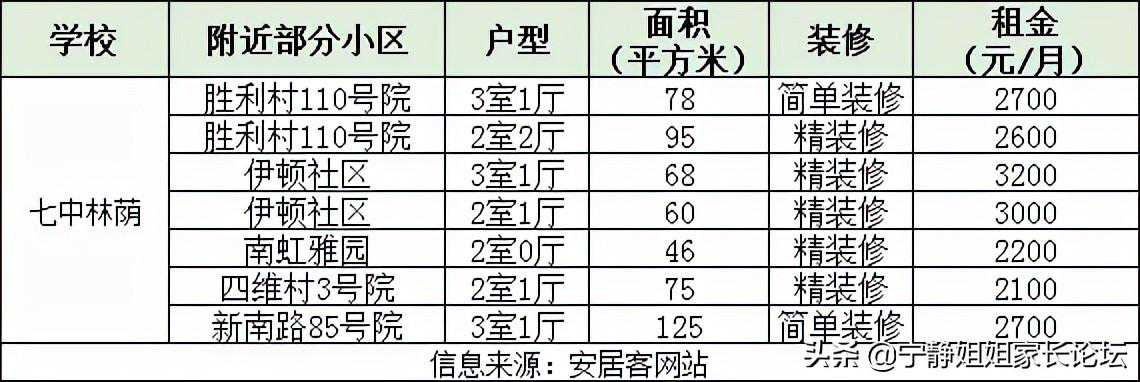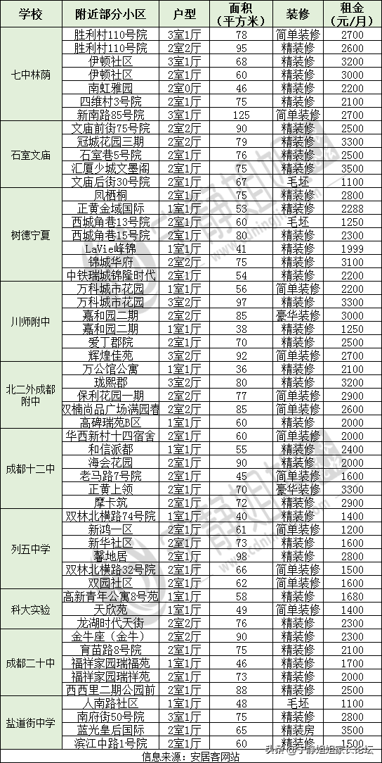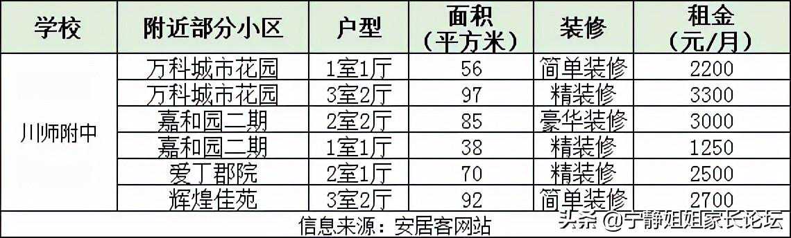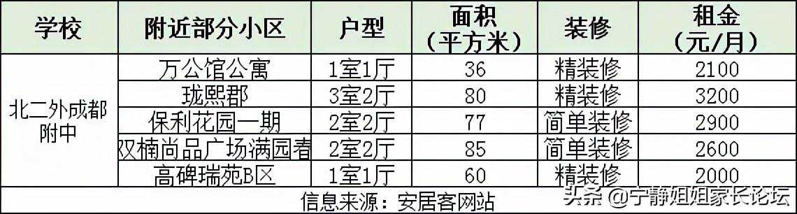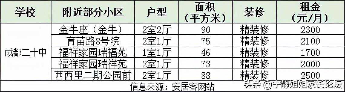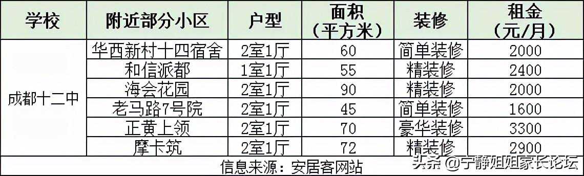 印象中,主城区只有十七中、田家炳中学和成大附中没法住校,其余高中都是可以住学校的,只是有些需要申请。 修建时间较早的学校一般床位有限,要优先满足离家远的同学;后来修建的学校或校区,硬件条件更好些,基本上是能够满足全部学生住校的。 公办高中住宿费一年是1200元,这是实行公寓化管理的宿舍价格,算是最高规格的,私立高中基本上也是这样,性价比还是比较高的。 不愿意住校,或者是高中床位不够的,离家较远的学生只能选择在学校附近租房。 本文挑选了十所高中,整理了附近小区的租金情况,给新生家长们一个参考,一起来看看吧。 1、七中林荫 2、石室文庙 3、树德宁夏 4、川师附中 5、北二外成都附中 6、成都十二中 7、列五中学 8、科大实验 9、成都二十中 10、盐道街中学 这些高中附近的租房信息还是挺多的,只收集了较近的部分小区,表中的信息是从安居客网站上整理的,仅供参考。 通过这一部分的租房信息可以看出来,租金还是不便宜,每月租金大都在两千元左右,一年下来预估要花两万到三万,是笔不小的开销。 和学校住宿费一对比,租房上学性价简直没得比,但有时候又只能租房。那么问题来了,你会选择租房上学吗?