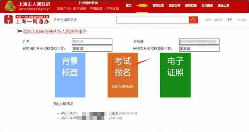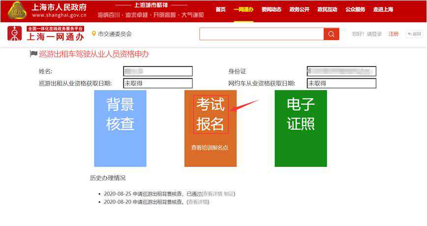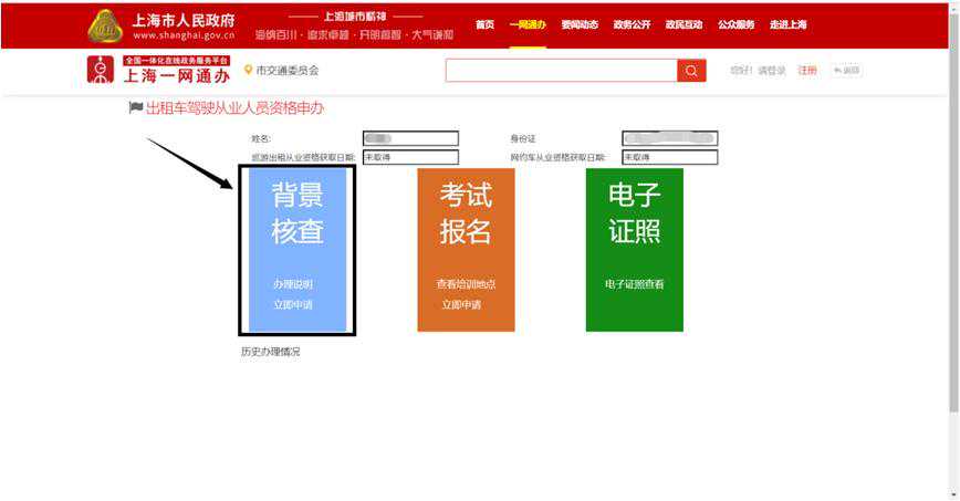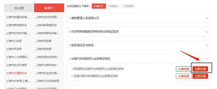 按顺序选择个人办事—按部门—上海市交通委员会—出租汽车驾驶员从业资格证核发↓