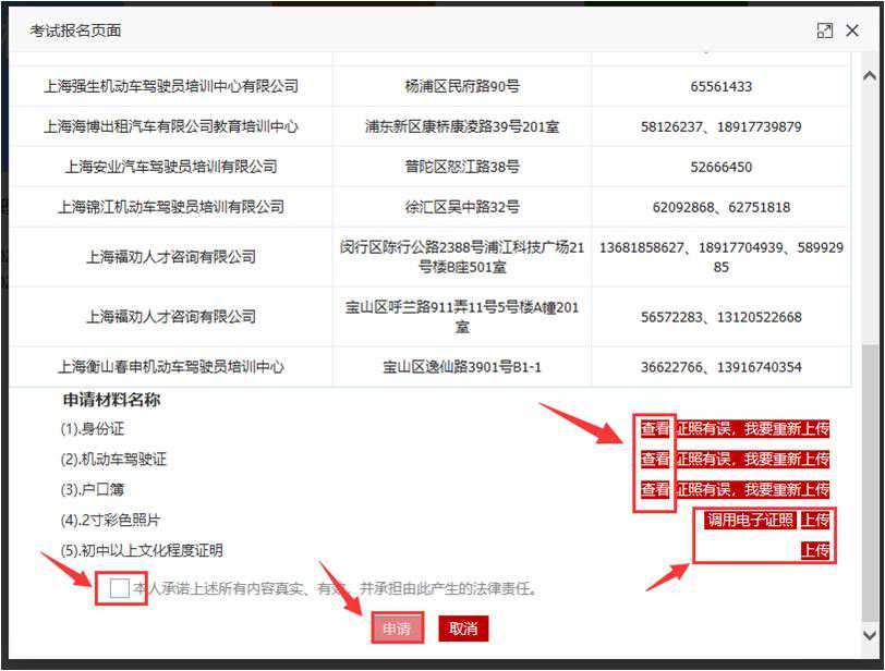 查看自己之前上传的申请材料是否有误,是否需要重新上传并且调用2寸照片的电子证照,上传初中文化程度证明↓