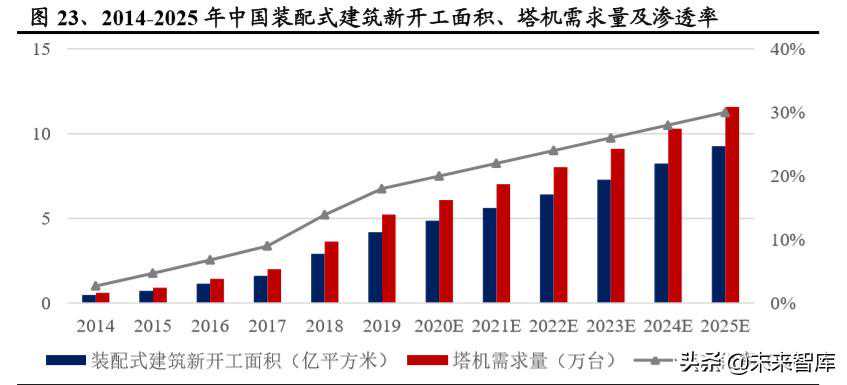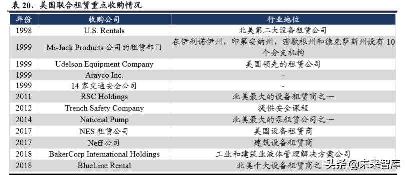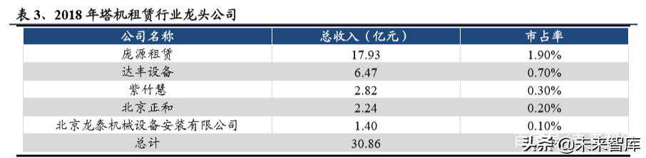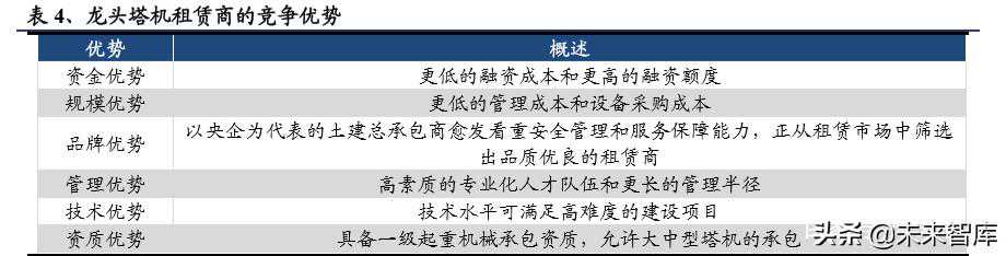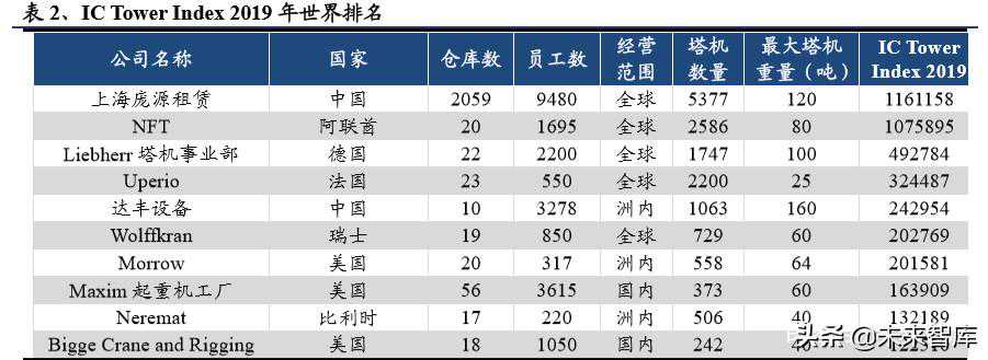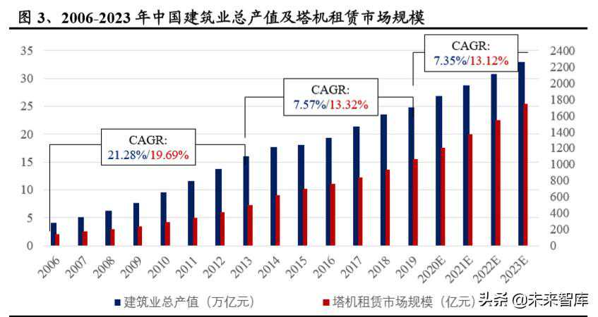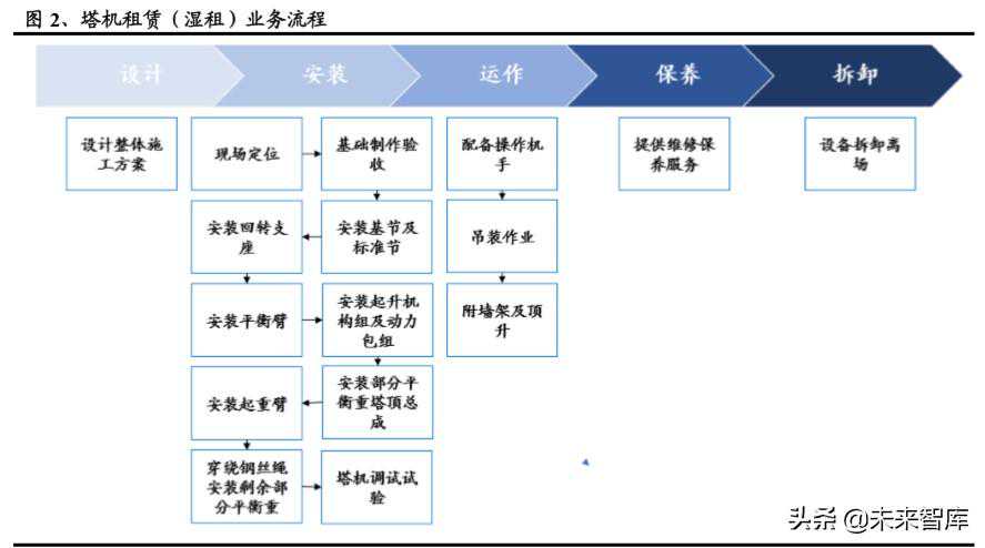 获取报告请登录未来智库。 1.1、塔机租赁本质上是业务分包,行业拥有较高进入壁垒 塔机(也称“塔式起重机”)设备租赁业务是一种向设备使用方提供从设备进场安装、现场操作、维修保养到最终拆卸离场等全方位的综合解决方案和服务。塔机租赁行业的上游为塔机制造商,因为塔机单价较高,塔机租赁商多采用融资租赁、分期付款等方式采购塔机设备。塔机租赁行业的下游为房地产和基础设施建筑施工企业,由于塔机具有单价高、型号多、专业性强、操作难度大、安全风险高、运输成本高等特点,建筑施工企业往往选择租赁方式。据中国工程机械工业协会和“技工人服务”数据,2006年我国新增租赁塔机占当年塔机销量的比例为57.25%,到2018年,这一比例提高到80%。建筑施工企业对塔机租赁的认可度不断提高。 塔机租赁是以湿租模式为主的外包服务,本质上是一种业务分包。与普通设备租赁不同,塔机安装和拆卸技术难度相对较高、安全风险系数大,需要专业服务,因此租赁公司在向客户提供塔机租赁服务过程中,还包含安装拆卸业务、维修服务,并配备操作机手。特种作业操作人员需具备操作证件才能上岗。 塔机租赁商提供塔机租赁服务的收入主要包括两方面:一是设备租赁费用,二是设备进出场费用(包括设备安装、拆卸费用、报检费等),设备租赁费用一般按月/季支付,以月支付为主;设备进出场费用则按合同约定按次支付。 在塔机租赁过程中,塔机租赁商负责设备从安装到拆卸离场的所有环节。塔机租赁商通常通过招投标方式取得经营合同,签订合同后,塔机租赁商根据施工环境需要设计整体施工方案,随后开始塔机设备安装服务(包括现场定位,安装基节及标准节、回转支座、平衡臂、起升机构组及动力包组、部分平衡重塔顶总成、起重臂、钢丝绳等),待设备安装完毕,塔机租赁商提供配备操作机手进行高空作业,出现质量问题则相应提供维修服务,到设备使用完毕,塔机租赁商继续负责设备拆卸离场。 塔机租赁服务行业的进入壁垒主要包括:1)资质壁垒——塔机是起重机械的一种,属于“特种设备”,该类设备由于体积和重量大,且大多需要高空作业,危险性较大,施工方需严格遵守《安全生产法》、《建筑起重机械安全监督管理规定》等国家法规和行业规定,塔机租赁商需具备《中华人民共和国特种设备安装制造维修许可证》和起重设备安装工程专业承包资质,特种作业操作人员需具备操作证件才能上岗;2)经验壁垒——塔机安装个性化定制需求多,原厂设计的起重机械可能不能充分满足实际施工需要,需要根据实际建设项目、施工环境的特点和要求,提出创新的设计图纸,如增加独立高度、提升局部起重性能等,这要求租赁公司具备丰富的行业经验的核心技术人员;3)资金壁垒——塔机行业属资金密集型行业,塔机采购单价较高,行业资质对塔机租赁商的注册资本等也有明确要求。 1.2、塔机租赁下游以房地产为主,未来市场增长有望提速 塔机租赁下游为建筑行业,包括房地产、基础设施建设等行业,其中房地产业占比约80%-90%。我国塔机租赁行业从20世纪80-90年代开始萌芽,当时的租赁商以国有企业设备管理机构为主,他们在保证内部施工的前提下提供部分外部租赁服务。当时很少有个体业主购买塔机从事租赁,主要原因是个体业主资金实力有限,且很多大公司拥有自己的设备,无需从外部租赁设备。20世纪90年代后期,随着中国土建工程领域总承包模式的推广,个体业主租赁设备也开始萌芽,逐步出现专业化分工的趋势。2000年起,建筑业走出低谷,工程机械行业开启新一轮黄金发展期,塔机租赁行业也随之进入高速发展期。 2006-2013年是房地产高速发展的9年,建筑业总产值从4.16万亿元增长至16.04万亿元,年均复合增速达21.28%,同期塔机租赁市场规模从142.8亿元增长至502.4亿元,年均复合增速19.69%;2013年起,中央政府加强房地产调控,部分城市开启“限购、限价、限贷”政策,建筑行业增速开始放缓。2013-2019年,建筑业总产值年均复合增速下降至7.57%,塔机租赁市场年均复合增速也降至13.32%。据全球最大的企业增长咨询公司弗若斯特沙利文预测,到2023年,我国建筑业总产值将达到33万亿元,年均复合增速达7.35%,塔机租赁市场规模将达到1742亿元,年均复合增速13.12%。 塔机租赁占工程机械租赁市场比例稳步提高。2012-2018年,国内工程机械租赁市场规模从3500亿元增长至6530亿元,年均复合增速10.95%;工程机械租赁渗透率从30.0%增长至50.7%;塔机租赁在工程机械租赁市场的占比从11.77%增长至14.27%。从工程机械租赁市场分布来看,挖掘机、装载机和塔式起重机是机械租赁的三大分支,2018年占比分别为32%、29%和14%。 从供给端来看,2008年以来,塔机销量和保有量经历了一轮起伏。2008-2013年,塔机销量从2.79万台增长至6.37万台,年均复合增速17.93%;随着工程机械行业进入低迷期,2016年塔机销量仅7000台,仅为2013年的10.99%,此后行业有所恢复,到2018年销量为12800台,到2019年塔机销量约4万台。据中国工程机械工业协会数据,2006-2015年,塔机保有量保持增长态势;随后,由于塔机销量不断下滑以及旧设备的淘汰,塔机保有量有下降趋势,到2018年保有量均值约为42.23万台,2019年塔机保有量均值预计为45.10万台。 据CME工程机械网和《信息化在建筑机械租赁管理的应用》,未来塔机租赁行业将朝着更加良性的趋势
