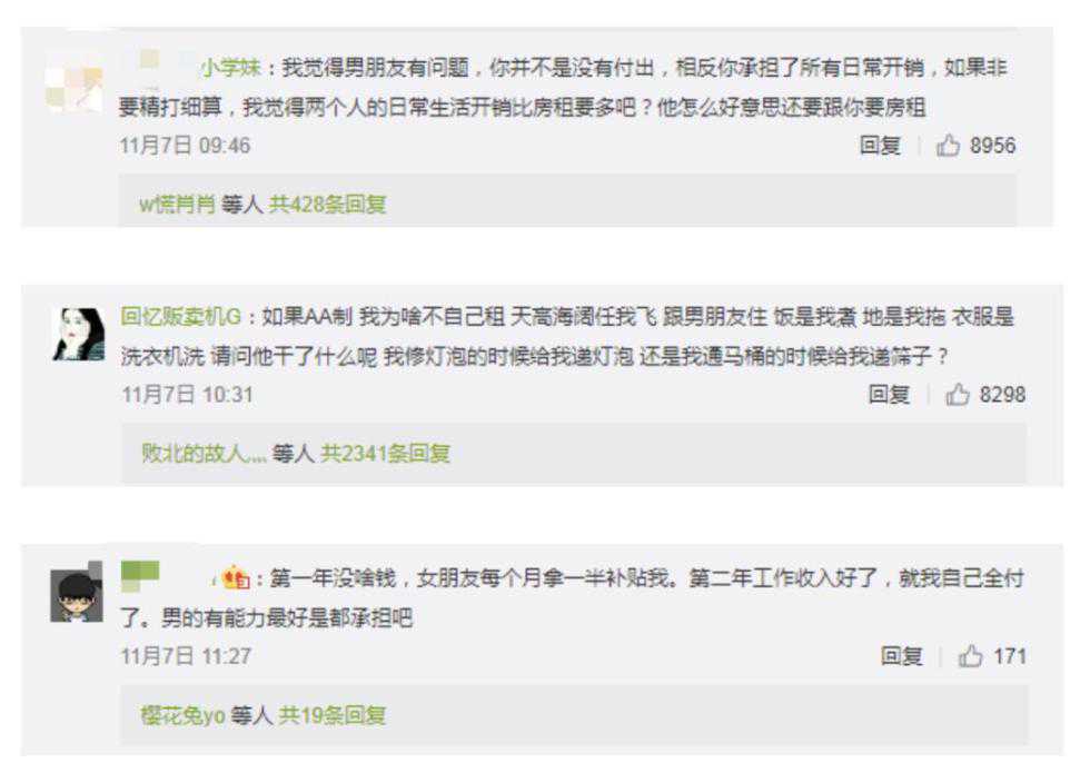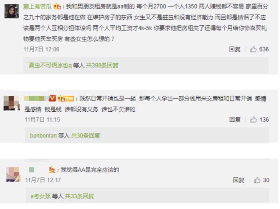 2019-11-1608:07 “AA制”早就成为一种日常交友方式存在年轻人的生活中,朋友聚餐会AA,出去旅行会AA,甚至喝奶茶,看电影都有AA经费的情况,大家各自承担各自的费用,心安理得,互不相欠。 但是近日,话题登上微博热搜榜,一度拥有1.7万的讨论量,2.2亿的阅读量! 起因是姑娘珍香(化名)向情感博主投稿寻求帮助。最近,她和男朋友贤石(化名)开启甜甜蜜蜜的同居生活,一起买菜做饭,一起牵手散步,感情稳定且恩爱,珍香情不自禁的开始幻想婚后生活。 可万万没想到,到了月底结算房租时,男友竟然开口问她要一半的房租,珍香表示自己都懵了。“我带着自己满腔的真诚,想要和你谈一场有结果的恋爱。结果,你却只把我当室友!” 珍香认为自己在同居之后,并没有什么都没付出,她主动承担了日常的大部分开销,并且还主动承担了大部分的家务。“每天洗衣做饭收拾家务,还要遛狗!如果房租都要AA,其他难道都要一五一十地算清楚?!” 网友们也是炸锅式的讨论起来。 有站珍香不支持AA制的: 也有站贤石支持AA制的: 针对这一话题,小编也随机采访了身边好几对合租情侣。事实上,两个人房租AA,或是由男方承担,这两种情况都普遍存在。 例如刚刚结婚的小M,其实早在交往时期,她就和男朋友就开启租房同居生活了。当时,他们和另外两个朋友一起合租在西湖区的望月公寓,三室一厅的套间,每月他们的租金大概2700元。 “谁交租金不好说,因为当时他的工资上交给我了。”小美边回忆边撒了一把狗粮。不过,当时男友工资并不高,交完房租后,钱就没剩下多少了。“反正他的钱不够了,就用我的嘛,总不能一直对方一直付出,日子是两个人的。AA制可能分的太细,而且生活在一起也分不了这么清楚。” 小C则是自己承担了他和女友的房租。“倒也没有具体商量过房租就要我出。”他们住在丰瑞北苑小区,租住了一套两室一厅的房源,每月租金3500元,除此之外每月还有水电费200元左右以及停车费200元。 今年初,他和女友刚刚结束异地恋的考验,终于能朝夕相处。小C的女朋友并不是杭州本地人,为了他来到陌生城市,小C格外珍惜这段感情。“她离开父母过来,这边朋友也少,我能多付出点也是应该的。”对于平时的日常开销,也并没有规定谁出多少。而因为两人工作原因,家务也是谁有空,谁主动去承担。 事实上,房租在情侣交往中虽然可以说是一道考验,但绝不是障碍,毕竟不管房租怎么付,如果性格不合或者别的什么原因等,都可能导致分手。 比如小B曾经就负担了和女朋友同居的所有开销,但最终因为感情不合分道扬镳;还有小D也曾为了男朋友同居,搬去离自己单位很远的地方,但因为男朋友每个月要还按揭,剩下的钱不多,同居的租金两人商量后只能AA,本以为同居会增进感情,却没想到最终还是因为生活琐事争吵不断而分手。 所以,各位正在租房交往的同志们,不管房租怎么付,且行且珍惜啊! 你怎么看??