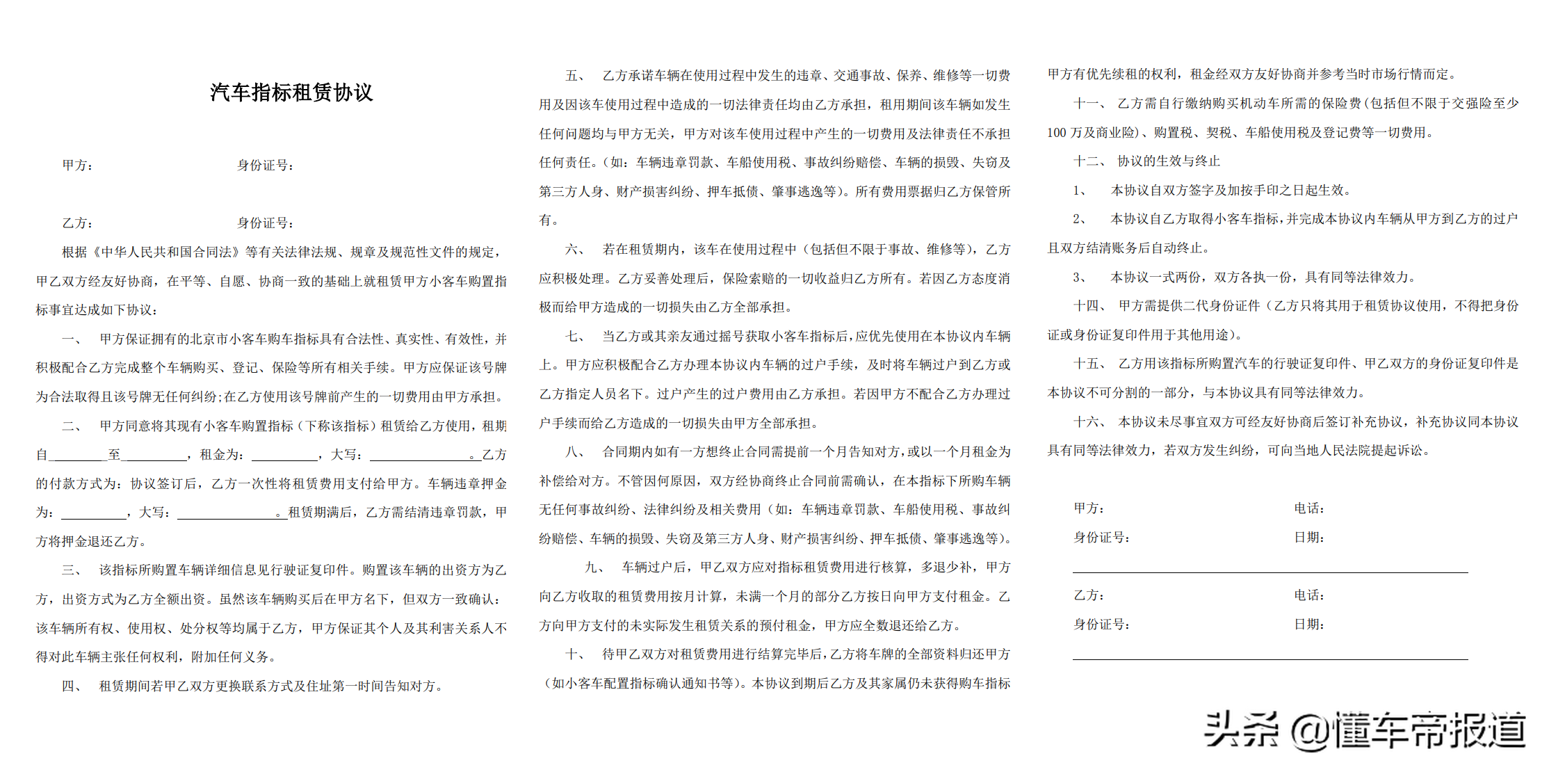 文:懂车帝原创王茸 [懂车帝原创行业]“有牌比有车难”,这是不少北京地区用车刚需人群的共识。 中签率低、排号时间长、“进京证”不再好用在庞大的市场需求面前,京牌租赁市场已是“公开的秘密”,甚至直接链接到了车企直营店。 前不久有媒体报道称,蔚来销售牵线介绍租赁京牌指标。而懂车帝了解发现,这一现象并非个例,特斯拉、蔚来、小鹏、理想等直营店的销售在被问及此事时,均表示可以提供“牵线服务”——为没有指标的消费者对接有资源的中介公司或个人。 笔者首先致电了北京一家蔚来门店,询问没有新能源指标但想购车怎么办,对方表示蔚来有第三方合作平台,可以帮助客户租用指标。而当进一步询问这种方式“是否靠谱”时,对方表示“我们找的是做了很多年的公司”,并分配了一位“非常了解指标问题”的一线销售顾问李阳做进一步讲解。 约二十分钟后,李阳主动打来电话。据他介绍,蔚来合作的第三方公司目前报价为一年1.6万、三年4.3万、五年6.3万。“之前三年是4万,五年是5.4万,基本半年一涨价,涨得太凶了。” 笔者表示价格比预想的贵,李阳提出自己认识一位专做指标租用生意的朋友刘伟,价格相对便宜,三年4万、5年5.8万,但速度可能比较慢。“他现在专门给特斯拉找指标,可以看看能不能捡个漏。” 当被询问通过第三方公司和刘伟个人办理租赁指标有什么区别时,李阳表示其实并没有很大区别,“都是找的都是北京本地人,个人指标。最终是你们双方个人签订协议,如果不放心协商还可以去办一个抵押协议”。根据李阳提供的空白协议模板来看,协议中确实不会体现蔚来和第三方公司。 而在随后和刘伟的沟通过程中,对方也表示,协议签署只会涉及租赁双方,但他会对双方名下的债务官司等纠纷进行排查,以保证双方人员“质量”。 笔者接着提出疑问,目前相关法规禁止租用车牌,如果真的发生纠纷,这份协议是否具有法律效力?刘伟明确表示“肯定没有法律效力,但法院会认定租赁事实”,因此能保证双方的权益。 对于这一说法,一位不便透露姓名的华律网律师告诉笔者,“的确如此,但在实际发生纠纷时,法院也可能会判定取消指标资格,双方都受到损失。“而她本人处理过的相关纠纷也非常多。 李阳、刘伟以及特斯拉销售人员均表示,如果找个人车主指标通常必须全款购车,而若想分期购车,理想和小鹏汽车的销售给出了另一种方案——租用公司指标,据理想汽车销售人员介绍,租用公司指标通常相对贵一些,但支持分期,一年一付租金。 当笔者询问租用公司指标和个人指标在可靠性上是否有区别时,小鹏汽车的销售王丽表示,“会更安全和可靠,因为会有融资租赁公司做第三方担保",即合同上会体现三方信息。在王丽提供的一份合同样本中,第三方公司创富融资租赁(上海)有限公司是丙方,购车人是甲方,指标人是乙方。 值得注意的是,上述合同名为“委托购车协议”,内容中并未直接提及车牌租赁信息,车牌相关条款在另一份补充协议中。 而在交谈过程中,几乎每个人都表达了“租赁车牌是无奈之举”的观点。随着北京小客车指标越发一号难求,许多购车人感觉等待指标遥遥无期,于是转而选择租牌,而经销商也更倾向于将这一服务定位为“帮个忙”,通常不会主动提及,但有人询问时会“与人方便”。 一位目前负责欧拉品牌的销售人员向笔者表示,自己所在的4S店从16年开始就在做指标租赁,目前已促成一千多例,“基本没发生过什么问题”。同时他还表示,今年开始新能源指标已更多地配置给无车家庭,而无车家庭拿到指标后基本100%会买车,因此目前市面上流出的空闲指标变得更少,但需求并没有减少,租赁价格也水涨船高。 最后,笔者了解到,不仅是新造车品牌,包括奔驰、宝马、奥迪在内的很多4S店都可以帮消费者联系租用指标。正如蔚来的销售人员李阳所说,“这已经是常态了”。 (注:文中人物均为化名)