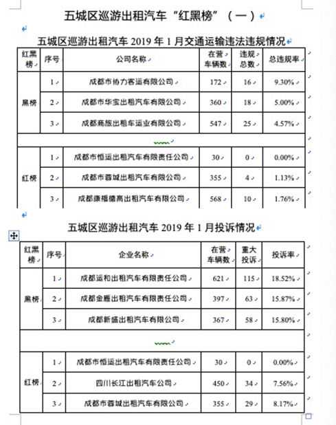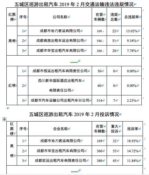 四川新闻网记者从成都市交通运输局了解到,为进一步规范巡游出租汽车市场秩序,遏制出租汽车行业乱象,督促企业切实履行主体责任,从源头上减少巡游出租汽车违法违规行为,成都市交通运输局决定从今年起,每月对各企业所属的巡游出租汽车交通运输违法违规及投诉情况进行通报并排位。每季度对交通运输违法违规率和投诉率较高的企业进行约谈,并在年终将通报数据纳入出租汽车服务质量信誉考评,考评结果作为经营权配置的主要依据。 同时,成都市出租汽车协会将启动行业自律机制,督促企业增强自我管理的自觉性,提高企业管理水平,提升行业规范化水平和服务质量。(记者戴璐岭) (图表来自成都市交通运输局) 想获取更多政务新闻及服务资讯,请下载四川省人民政府新闻办政务客户端──四川发布。