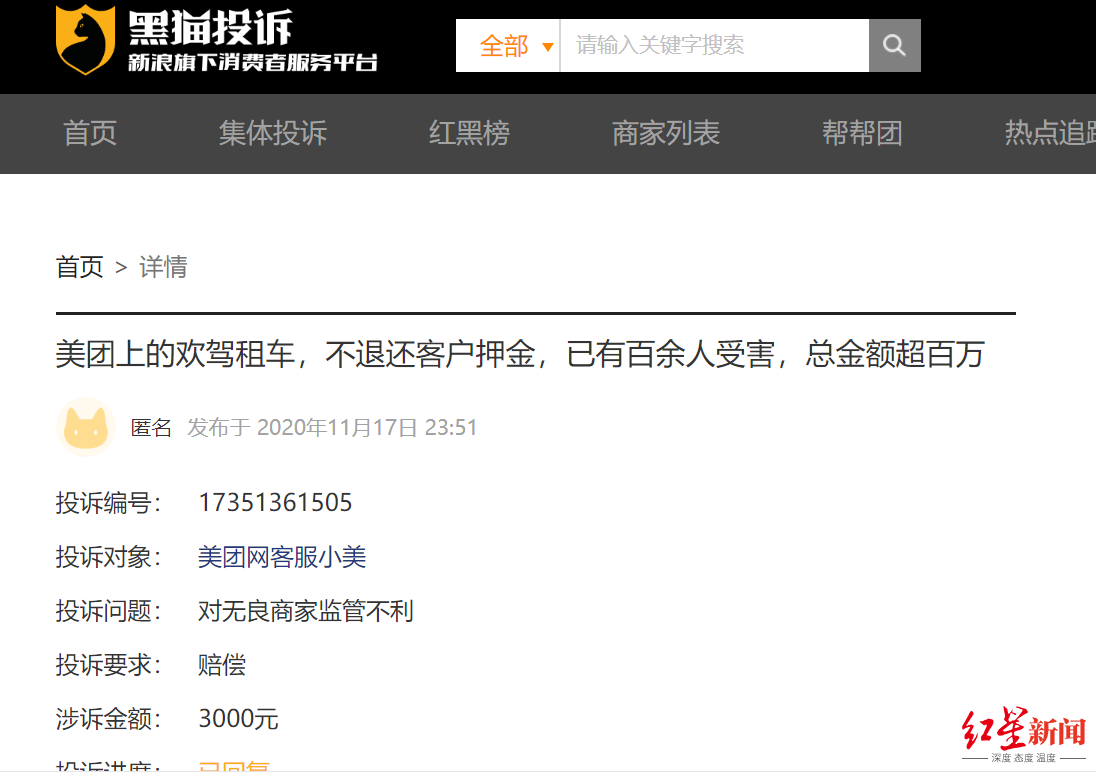 “欢驾租车”门店图据视频 “10月7日在美团上的‘欢驾租车’租车,签了租赁合同,交了3500元押金。合同称30天后商家返还押金,结果商家以各种理由推脱拒不归还。”来成都旅游的王先生告诉记者,今年国庆期间,他在“欢驾租车”上租了一辆车方便家人出游,等他归还车辆后被告知由于可能产生违章费用,租车的3500元押金会在30日至45日内退还给他。 “现在都一个多月了,不但没拿到钱,连人也联系不上了。”王先生表示,之前联系租车公司相关负责人,都被以各种借口推脱敷衍。 来自杭州的张女士也有相同遭遇。“我们是10月3日还的车,商家把我们的车辆押金2000元退了,还有3000元违章押金没有退,商家说的是30个工作日没有违章便退还。” 张女士告诉记者,国庆节期间,男朋友家里人到成都旅游,在美团上看到一家名为“欢驾租车”的租车公司,于9月30日到欢驾租车公司提车,租的是大众迈腾。 “租金为450元一天,租3天,我们一共付了6350元。其中1350为车辆租金,2000元为车辆押金,3000元为违章押金。”张女士透露,“租车公司说没有钱,后面我在美团上看见相关评价,很多人都说没有退钱。” 11月29日下午,记者来到四川欢驾汽车服务有限公司门店,发现大门紧锁,也没有工作人员。随后,记者拨打欢驾租车相关负责人电话,一直无人接听。 记者查询天眼查发现,四川欢驾汽车服务有限公司于2020年8月11日成立,注册资金100万,注册地址是成都市金牛区韦家碾一路118号2幢1230号附16号。天眼查相关页面还显示,2020年10月13日,该公司被金牛区市场监督管理局列入经营异常名录,原因是通过登记的住所或者经营场所无法联系。 张女士表示,美团对租车店铺应该有审核的职责。而根据黑猫投诉平台显示,有用户投诉称“美团上的欢驾租车,不退还客户押金,已有百余人受害,总金额超百万。”匿名用户留言称美团监管审核不力。 黑猫投诉平台上的相关投诉 红星新闻记者在美团上搜索“欢驾租车”,结果显示其三家店铺都是暂停营业的状态。记者就此事联系美团工作人员,对方表示目前正在了解相关情况。 另据四川电视台新闻现场报道,目前有近300位用户在“欢驾租车”上的租车押金和违章押金没有退还,涉及金额在一百万元左右。 搜索美团显示欢驾租车的三家门店已暂停营业 王先生表示,希望商家可以把该退的押金退还,如果不退还,他们下一步将会采取法律手段维权。 美团方面回应:“美团依据相关政策法规,对欢驾租车(四川欢驾汽车服务有限公司)进行过严格的资质审核,该商户入驻时资质齐全。消费者在该商户页面购买团购券后,至商户公司旗下实体店与该公司产生车辆租赁合同关系;未核销的团购券可退款。美团平台与该商户没有任何车辆租赁押金相关合作。美团接到投诉后,第一时间下线商户页面,并多方联络商户核实情况,但该商户目前处于失联状态。美团愿意积极配合消费者以法律手段维权。” 红星新闻记者李跃 (下载红星新闻,报料有奖!)