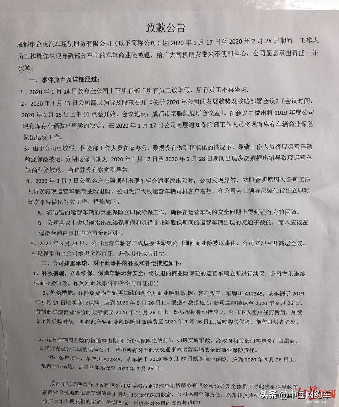 今年3月,在一场交通事故后报保险时,成都一名司机才发现,车辆的商业险被汽车租赁公司退掉了。 一石激起千层浪,在该公司租赁汽车的司机经过查询,纷纷表示,自己的车辆除了交强险,商业险没有了,截至目前,很多司机已经在没有商业险的情况下,跑了两个月的网约车。 对此,公司方面的解释是,工作人员在给库存车退商业险时,因数据没有精准化,导致租赁出去的车辆商业险也被退掉,这样的说法,并没有得到司机们的认可,公司大量的给车辆退保,也引起司机们对车辆今后过户一事的担忧。 司机们在公司讨说法 公司把商业险退了后, 既没告知,更没将退保的钱给司机 一位司机的车辆商业险保单 一些网约车司机近日来到了成都市京腾舰商务服务有限公司的办公大厅,这些通过以租代购,在该公司购车的司机没有想到,自己的车已经在没有商业保险的情况下,运营了一两个月。 司机刘松(化名)告诉红星新闻记者,3月初,一位和他一样在该公司购车的司机,在阿坝州出了事故,在报保险时发现,商业险被退了。消息出现在了司机微信群中,大家纷纷查询,竟然都遇到了同样的问题。 2018年7月,刘松在成都市京腾舰商务服务有限公司以租代购获得了一辆启辰牌小轿车,行驶证户头为成都市京腾舰商务服务有限公司,根据刘松的车险保单复印件显示,上一次车辆保险购买于2019年7月,本应到2020年才到期,其中,购买商业险的金额为2077.51元。3月24日,刘松再次通过保险公司查询发现,目前车辆在生效的只有交强险,而投保人已于2020年2月28日将该车的商业险办理了退保,共计退回了848元。 由于公司至今没有给刘松的车办理网约车经营许可证,他的车辆性质一直是非营运。而一位车辆属于营运性质的司机告诉记者,营运车辆的商业险保费要6000多元,公司把商业险退了之后,既没有告知他,更没有将退保的钱给他,“公司的做法,是致司机安全和权益不顾,背着大家就把商业险退了。” 3月21日至3月25日,每天都有司机在成都市京腾舰商务服务有限公司讨要说法。 公司回应: 工作人员失误所致,将为司机们续上保险 以租代购车辆,是车辆以长租的方式,按月逐月支付租金,待租期年限到期后,将车辆所有权过户给客户,是一种实现汽车金融购车目的的一种业务形式。因此,在刘松等司机还完按揭款之前,车辆的户主属于成都市京腾舰商务服务有限公司,作为车险的“被保险人”,该公司将车辆商业险退险后,司机们浑然不知。 对将租赁出去的车辆商业险退掉的情况,3月24日,成都市京腾舰商务服务有限公司办公大厅内贴出了一张致歉公告,上面对3月份阿坝州一司机在发生交通事故后,发现车辆商业险被退一事予以了证实。公告中称,公司在今年一月中旬决定,将2019年度的库存车辆出售,于是在今年1月17日,通知保险部门工作人员将现有库存车辆商业险进行退保。由于公司已经放假,保险部工作人员在家办公,数据没有做到精准化的情况下,导致工作人员将现运营车辆商业险进行了退保。退保日期在1月17日到2月28日期间,当时并没有察觉到异常。 公司致歉公告 该公司一位工作人员称,库存的车由于要出售,因此需要退保,而此次被退了保险的租出去的车辆有300多辆。公司方面表示,将为误退的商业险保险的运营车辆立即进行续保,并免费为车辆再加续两个月商业险时效,同时,在续保保险生效前,如遇到交通事故,经相关部门鉴定责任归属后,公司将承担所有对于此次交通事故运营车辆的全部商业保险责任。 至于续保的时间,公司一位负责人在23日上午表示,在当天下班前,将为每位被退保的司机续保,但截至25日晚,部分司机的车险商业险仍旧没有生效。 司机不信服公司的说法, 退保更引担忧:车辆过户恐遇麻烦 对于公司关于退保的说法,司机们并不信服,“操作失误,一两个还说得过去,怎么可能几百辆全部被退了。” 公司营业执照 目前,该公司已就车辆过户事宜,向司机们做出了公告,交通运输执法部门也已介入此事,关于过户一事,公司和司机双方还在协商。 (红星新闻记者逯望一摄影报道)