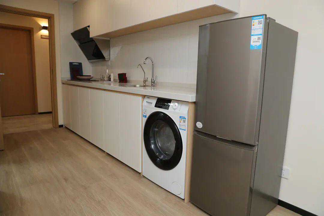 其中,150间是单间,配置了独立的卫浴设施、灶台、洗衣机等家具家电设备。另外55间是宿舍型房源,包含无障碍单人间、上下铺四人间、上床下桌四人间以及六人间等房型。一楼的公共区域设有共享厨房和洗衣房,满足租户日常生活所需。